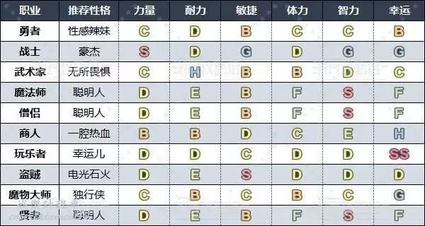 雖然可以通過性格來幫助職業補差,但還是推薦通過性格來補強。例如將戰士變成攻擊力特化的豪傑,魔法師、賢者等需求MP的職業就直接選擇特化智力的聰明人等,進一步提升最強能力,發揮各自職業的作用。