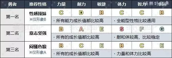 勇者(主角)推薦選擇性感辣妹、意志堅強和悶騷色狼三種性格,由於勇者職業比較全能(能夠選擇物攻、法攻、治療等多種定位),推薦成長率較高且比較均衡的性格。