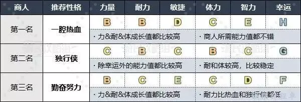 商人需求力量、耐力和體力均衡發展,因此建議選擇平衡型的性格,首推力量成長值比較高的“一腔熱血”。