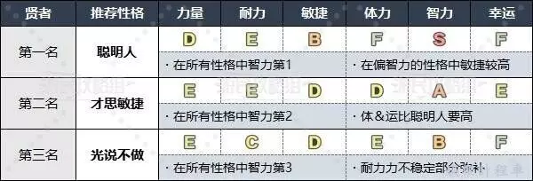 賢者推薦選擇智力較高的性格,能夠提升攻擊咒文威力和MP上限。如果擔心耐力較低的話,也可以用才思敏捷和光說不做來替代。