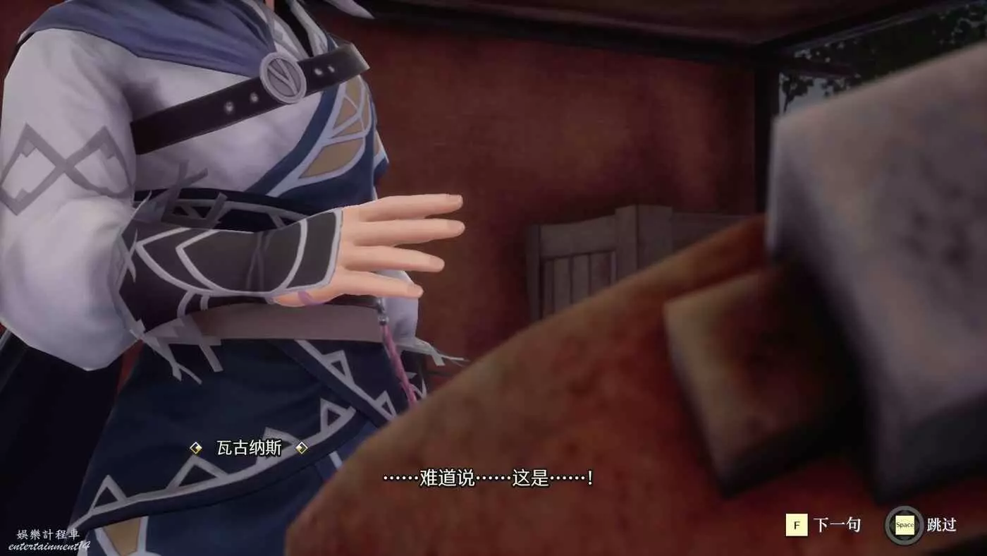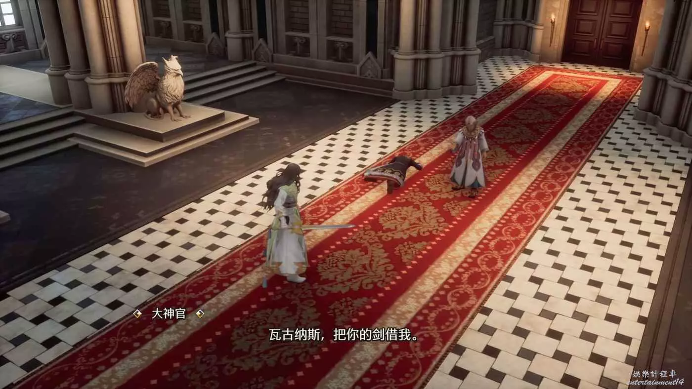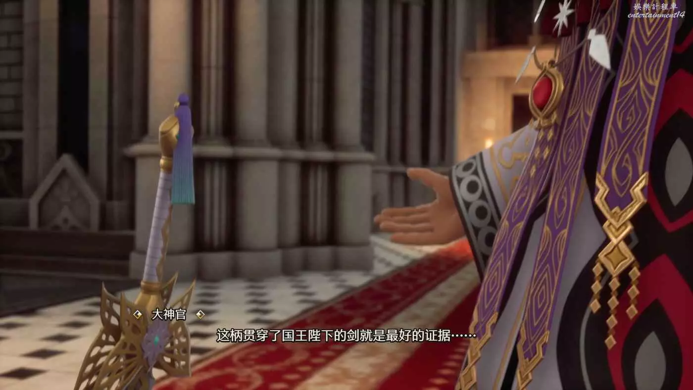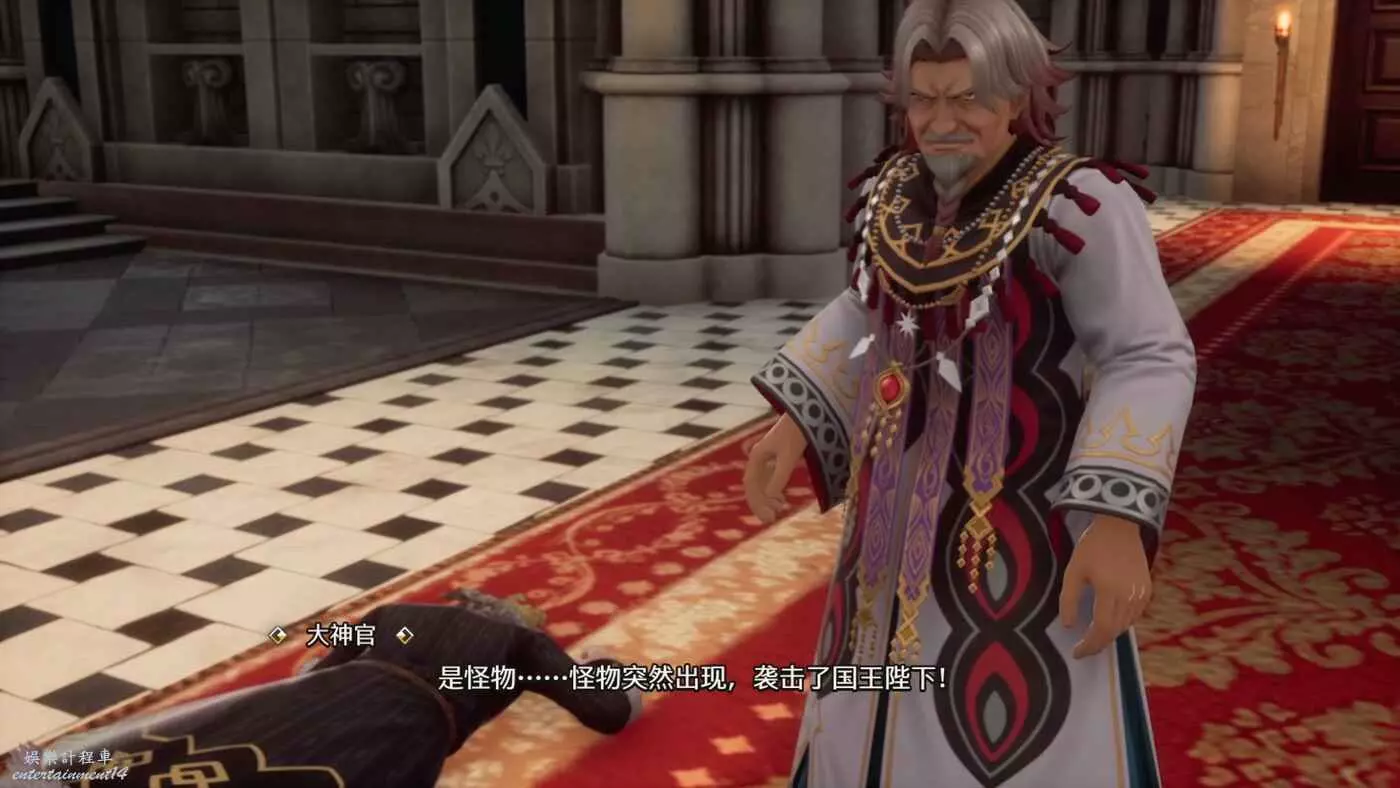 跟著來到這邊,觸摸以後觸發回憶。此次回憶一開始就是瓦古納斯在門口聽見房內的大神官慘叫聲,他趕緊沖進房間內查看情況。瓦古納斯看到國王倒在地上,於是詢問大神官發生了什麼,大神官說怪物突然出現襲擊了國王。
