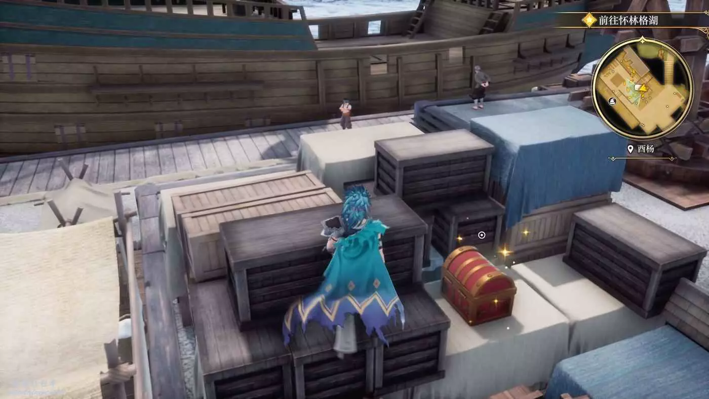 港口中間的雜貨箱子裡有一個寶箱,打開獲得頂級布料x3。