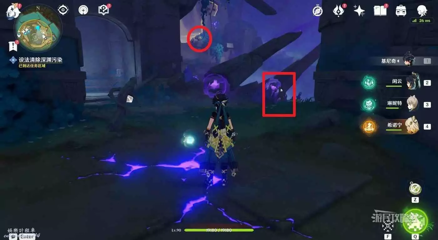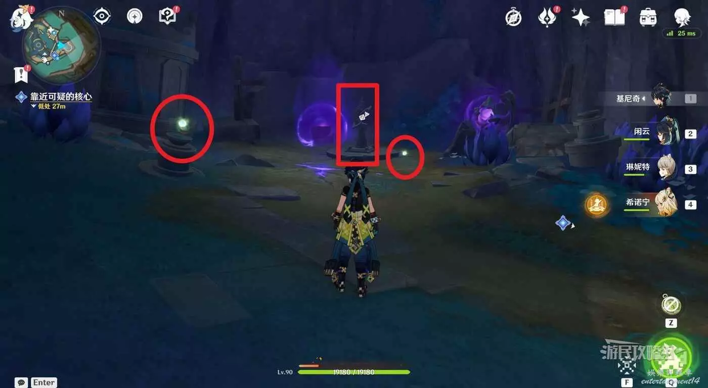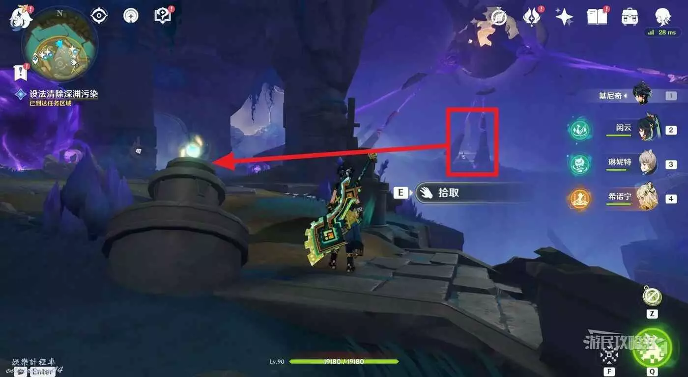 此時我們身上還帶著1個光球,將光球放入路上遇到的第一組紫色石柱之間的裝置中,這裡只需要1個光球就能抑制深淵能量。