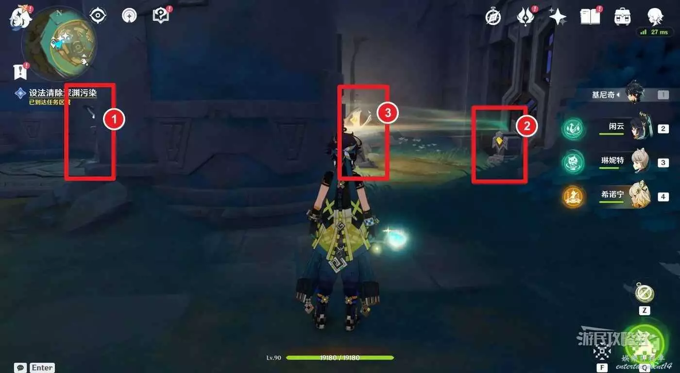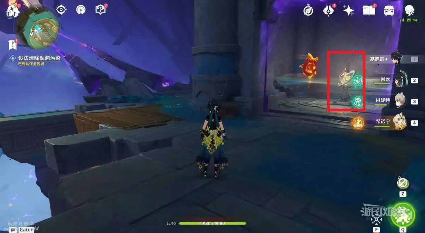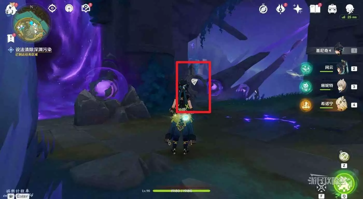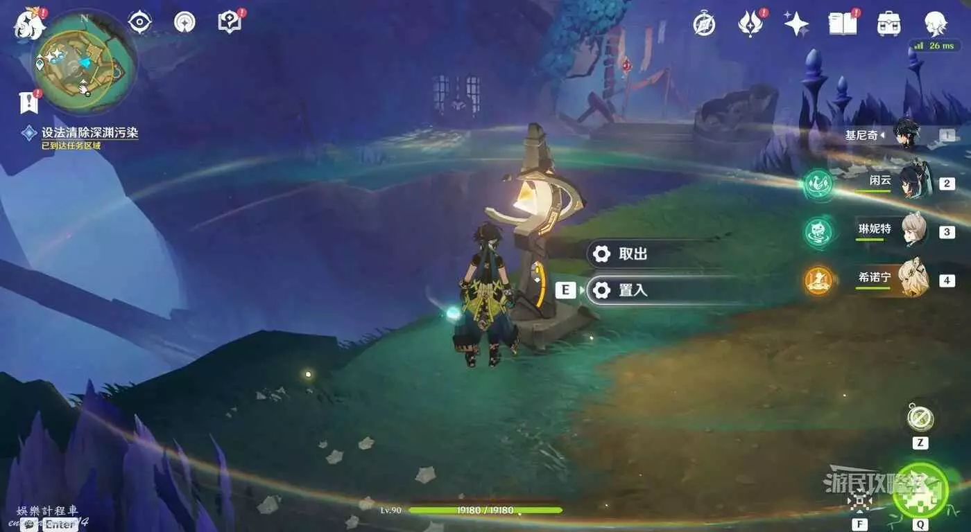 此時我們身上還帶著1個光球,將光球放入路上遇到的第一組紫色石柱之間的裝置中,這裡只需要1個光球就能抑制深淵能量。