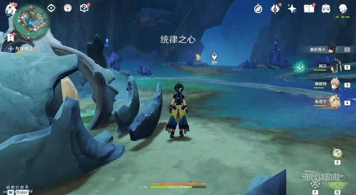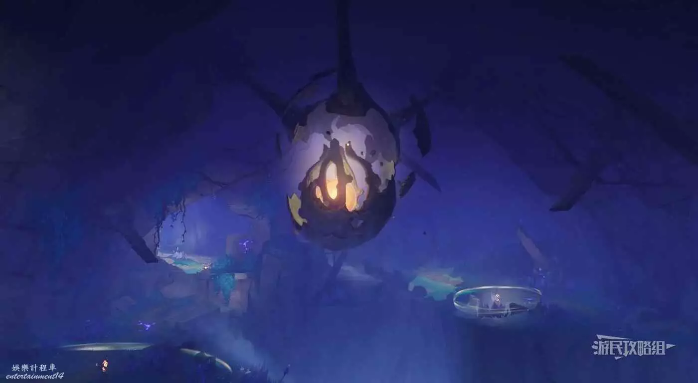 跳入大坑來到最下層後,到達統律之心,自動觸發對話。對話完畢,往洞內的另一側看,拾取2個光球放入中間的裝置,即可消除旁邊的紫色石塊,開啟寶箱。