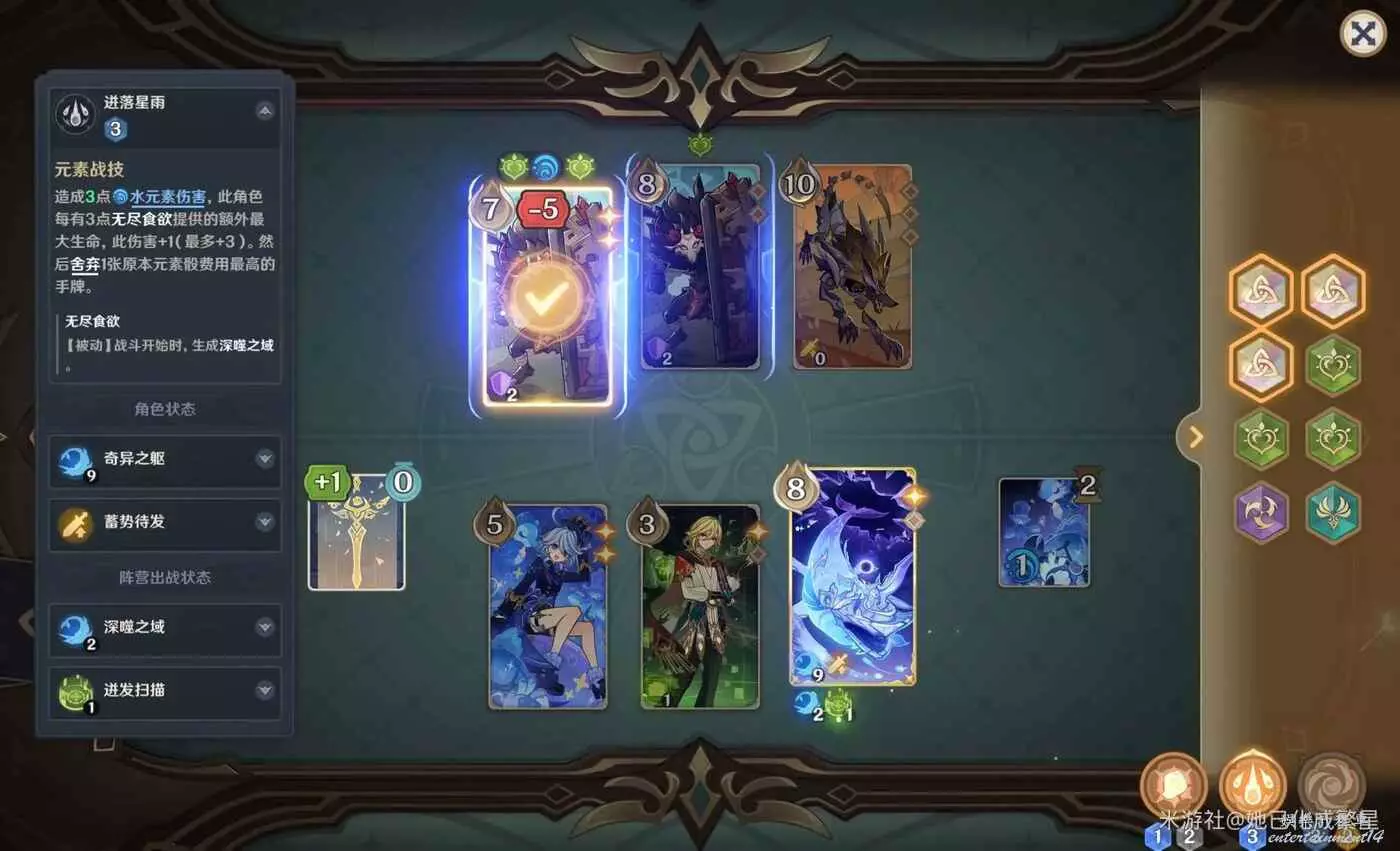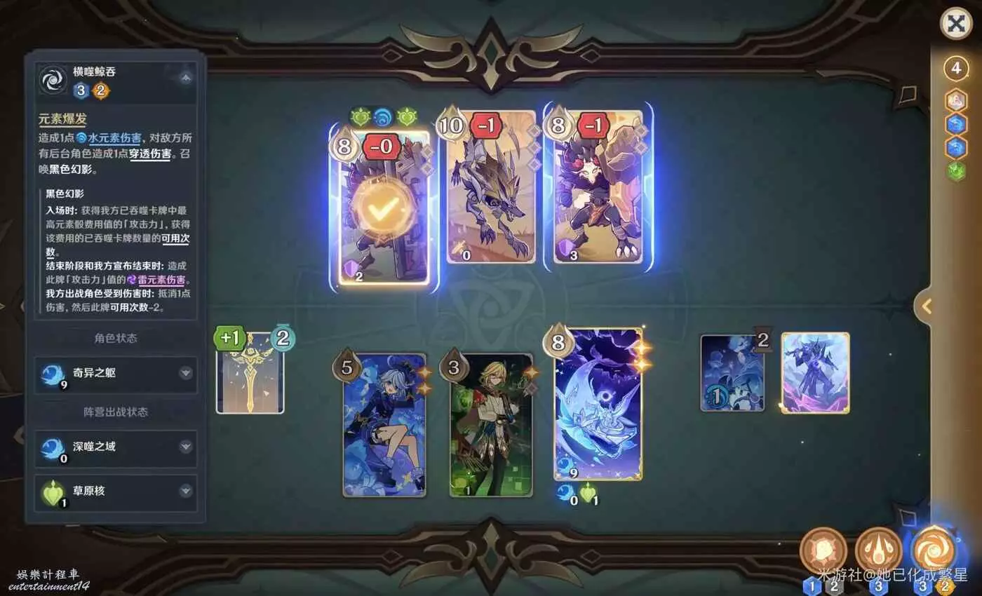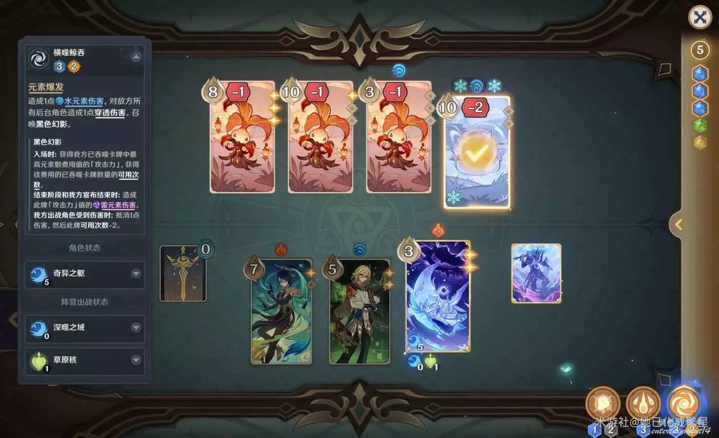 3.吞天之鯨卡組對於手牌的費用有一定要求,我們盡可能帶花費為3骰的手牌,實在湊不出三十張可以用其他費用小於3的手牌補足需求。