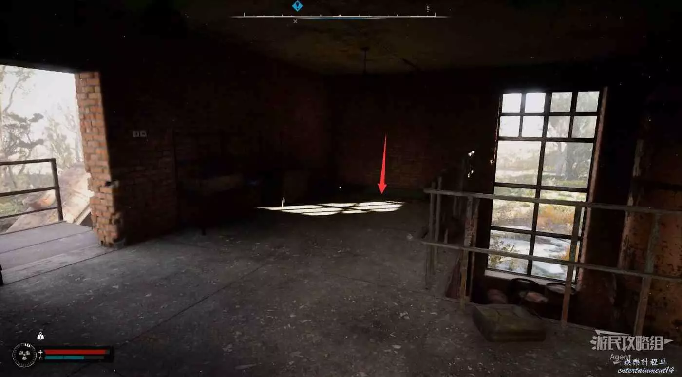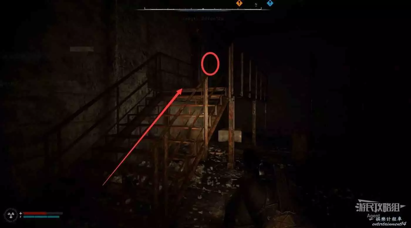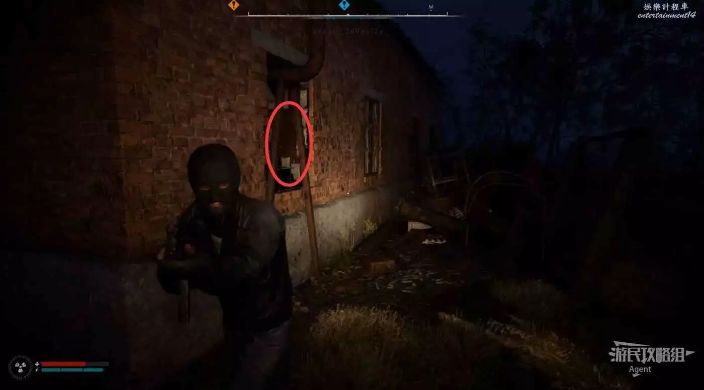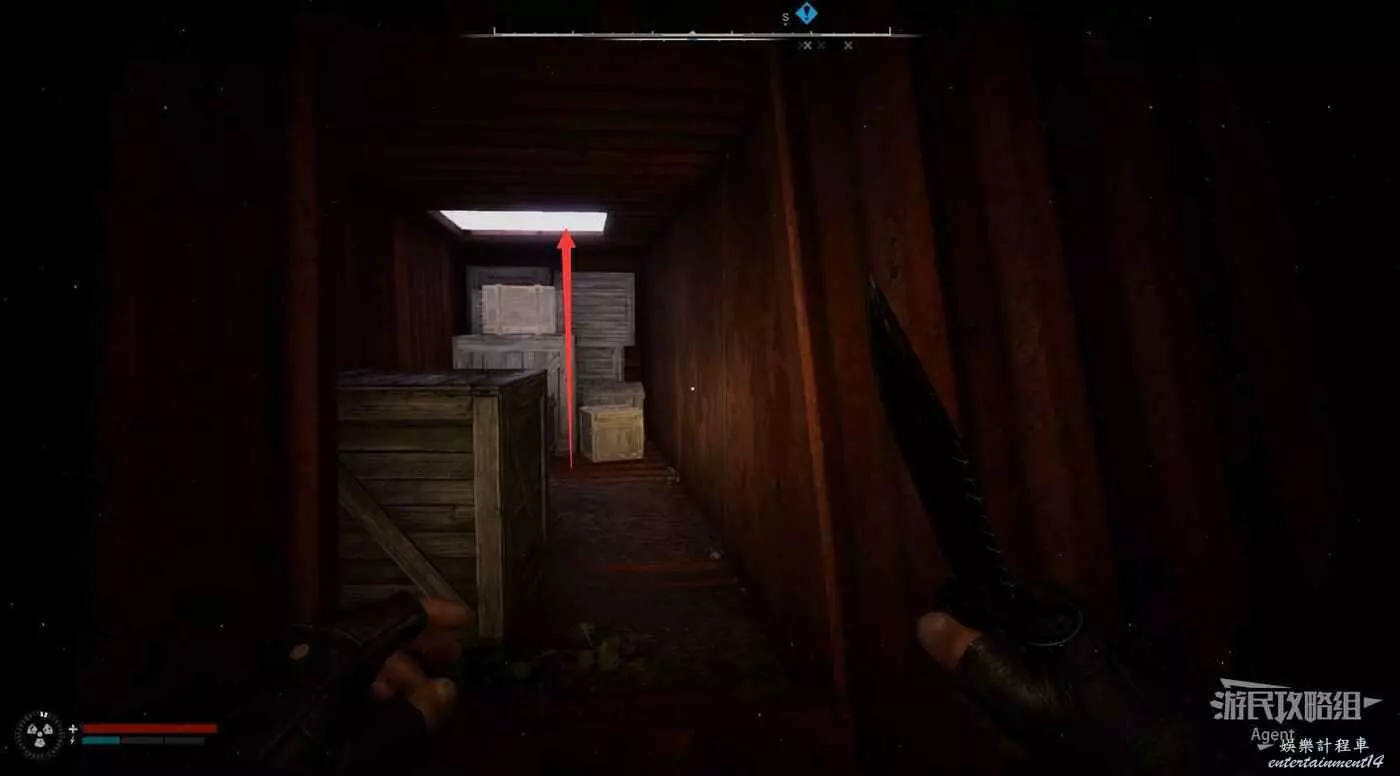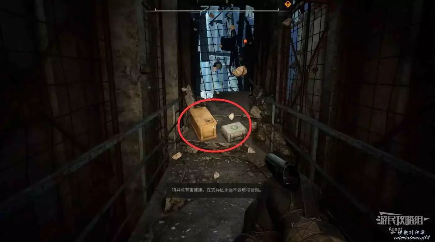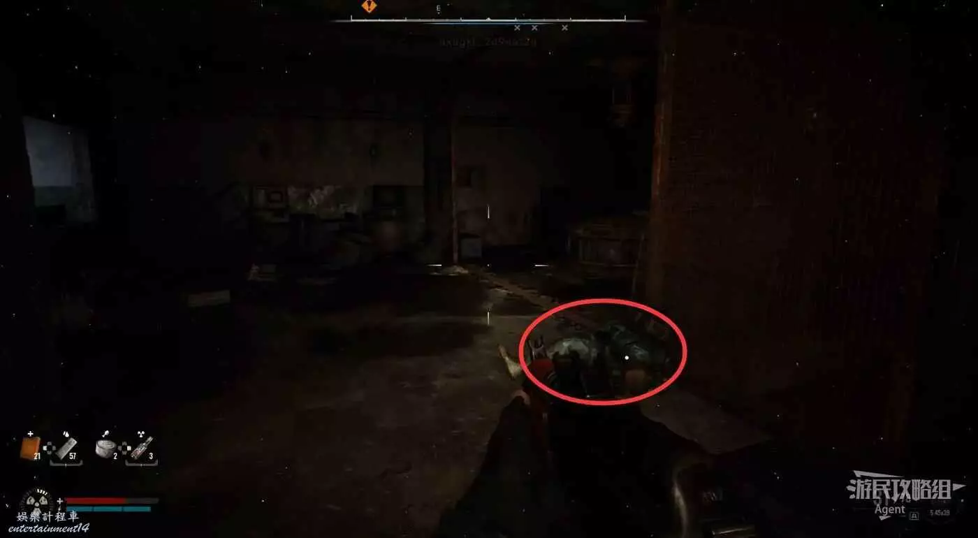 下圖位置有個儲藏點,扔螺栓使異常暫時消失,然後迅速跳到對面房子裡去,找到背包。