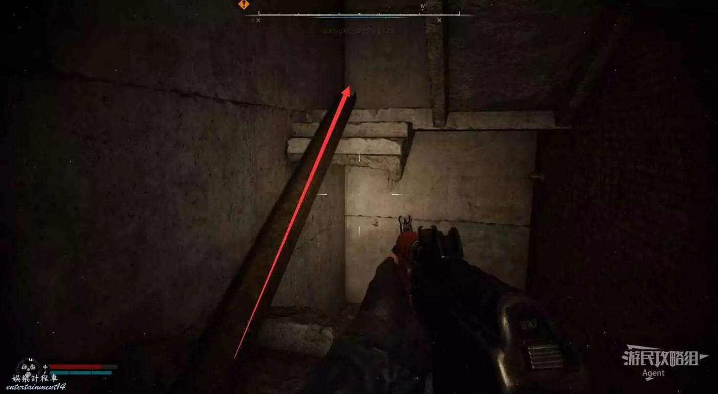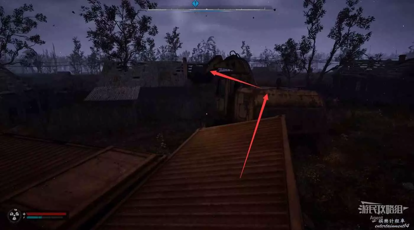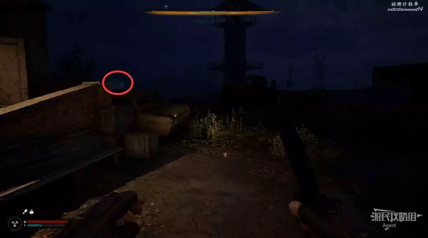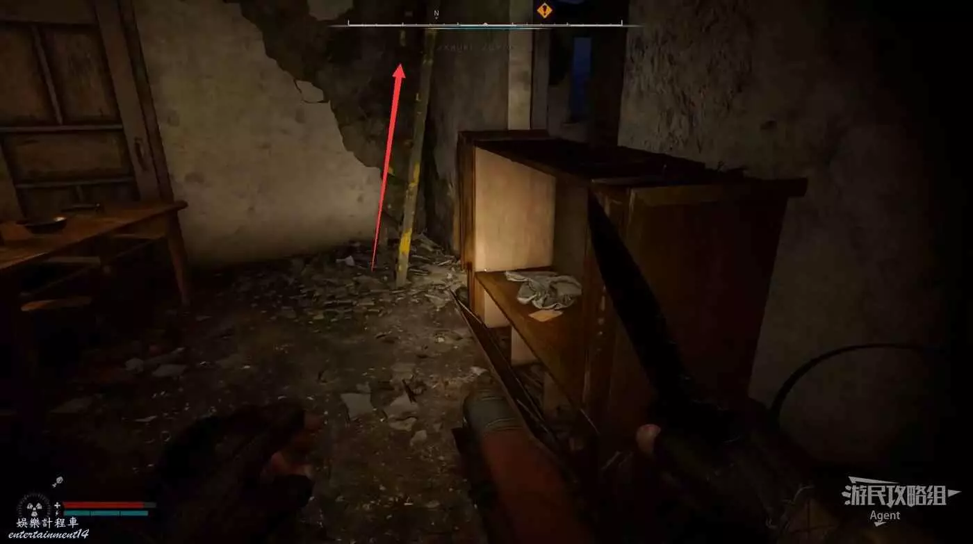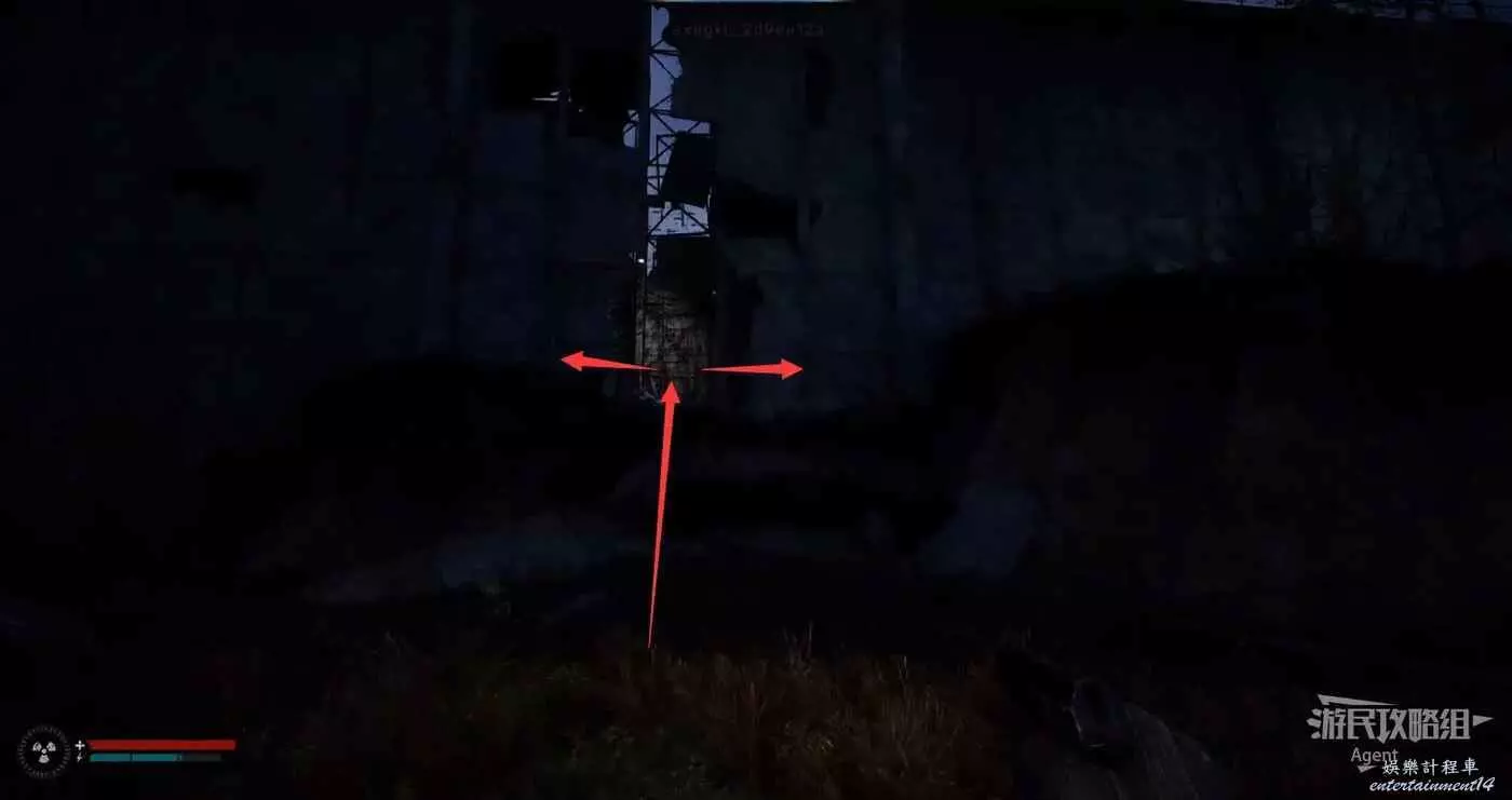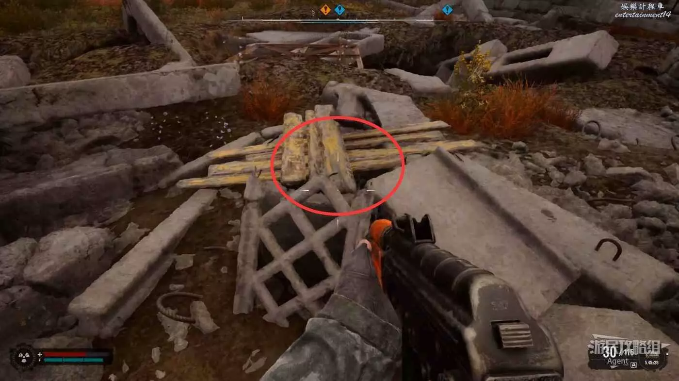 下圖位置有個儲藏點,扔螺栓使異常暫時消失,然後迅速跳到對面房子裡去,找到背包。