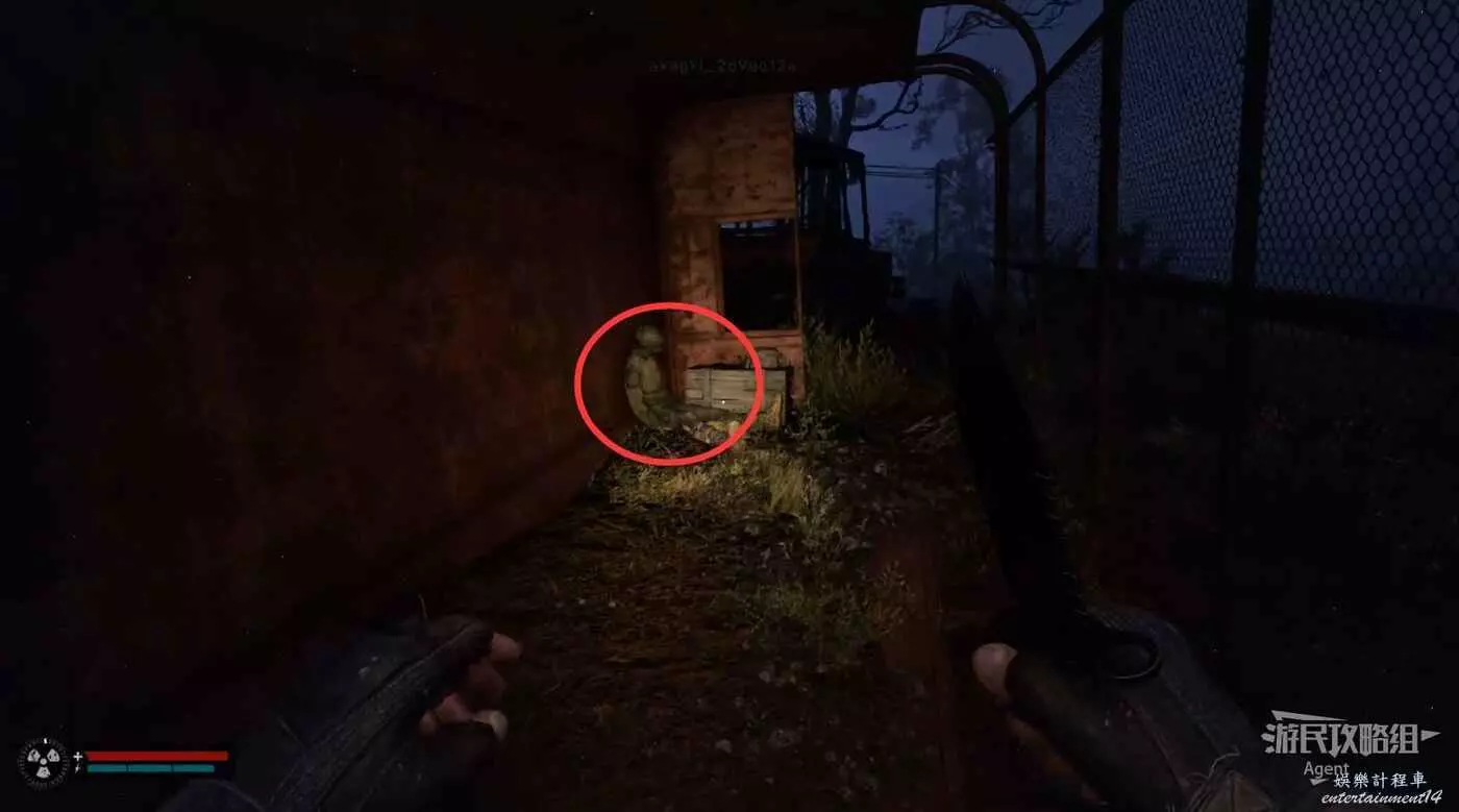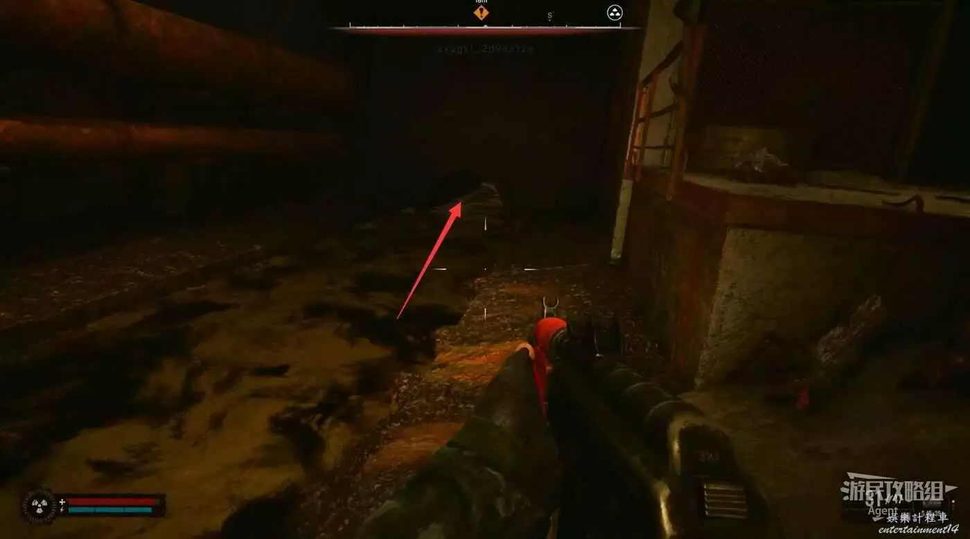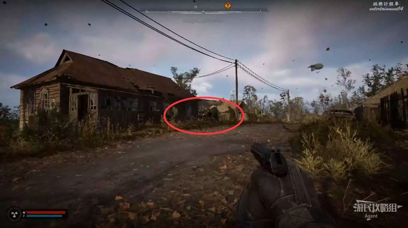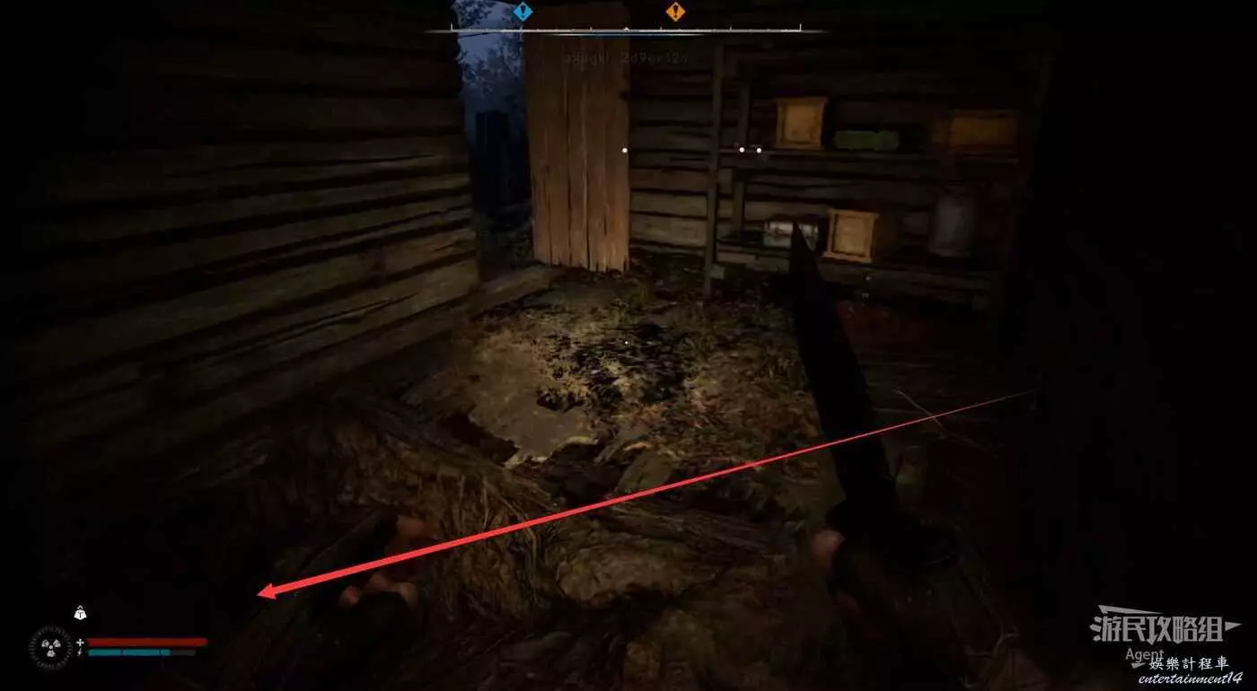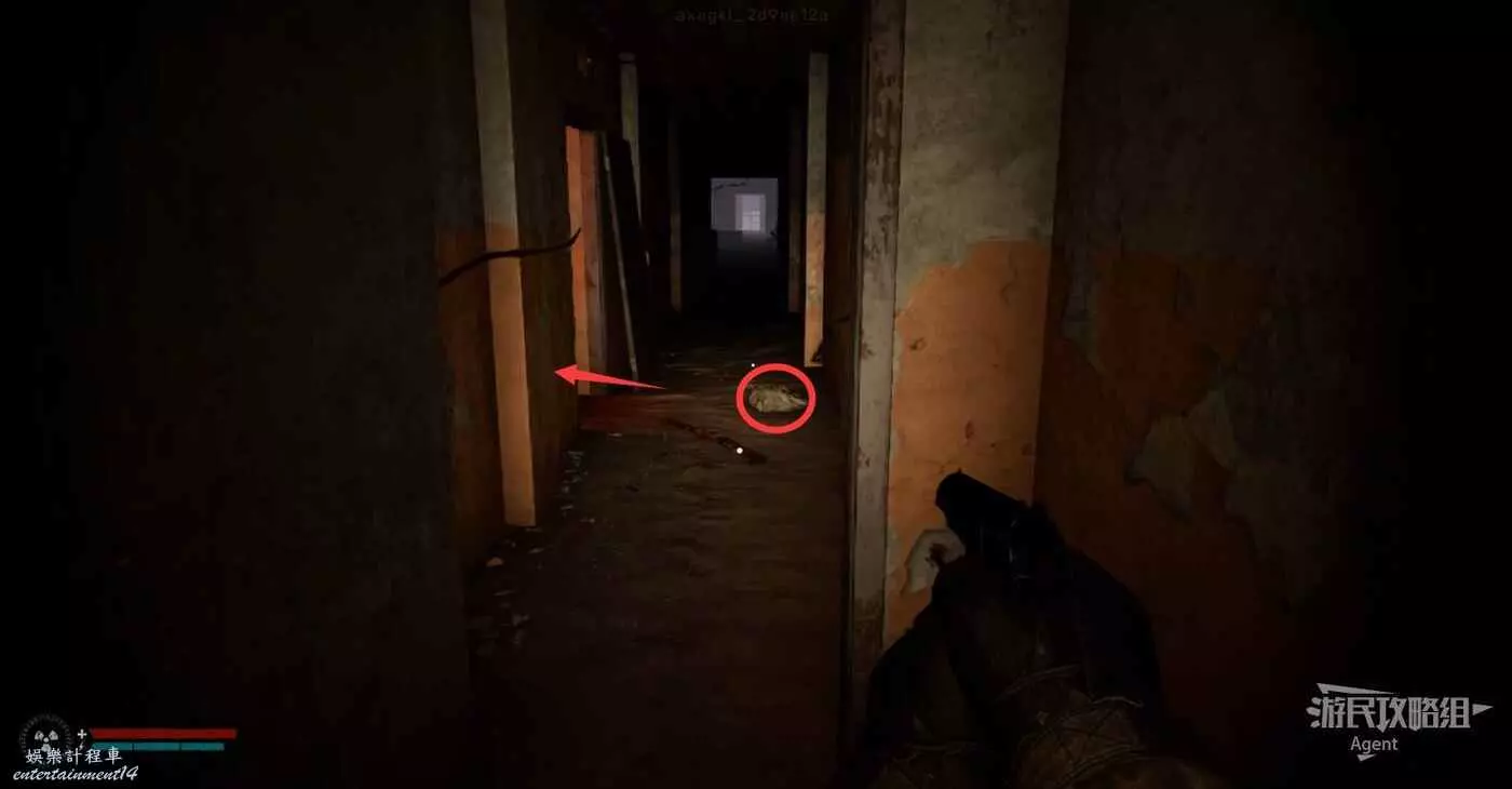 下圖位置有個儲藏點,扔螺栓使異常暫時消失,然後迅速跳到對面房子裡去,找到背包。