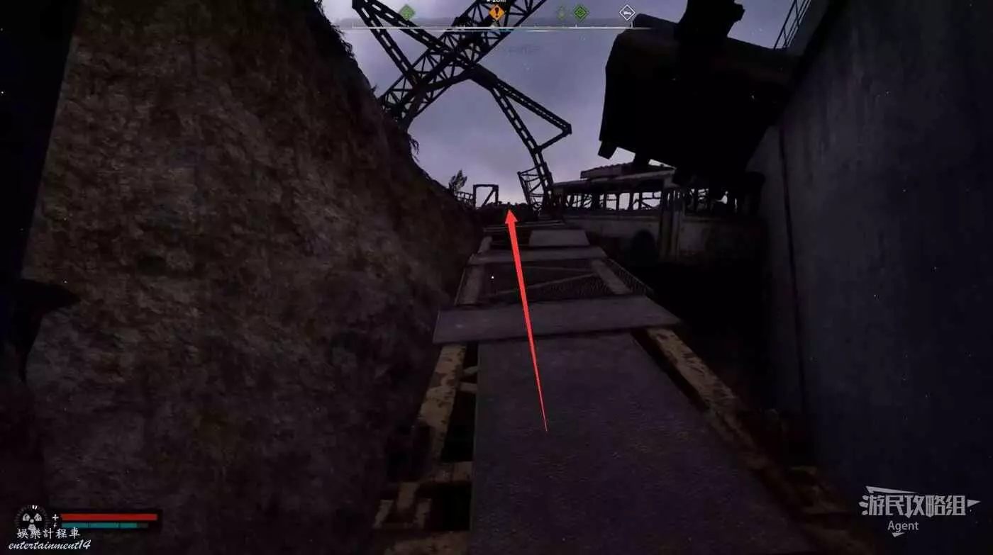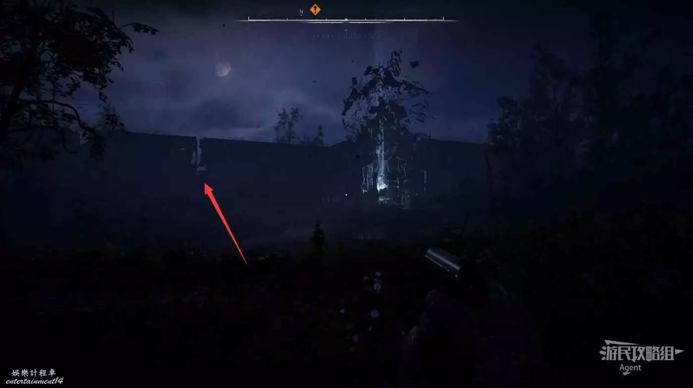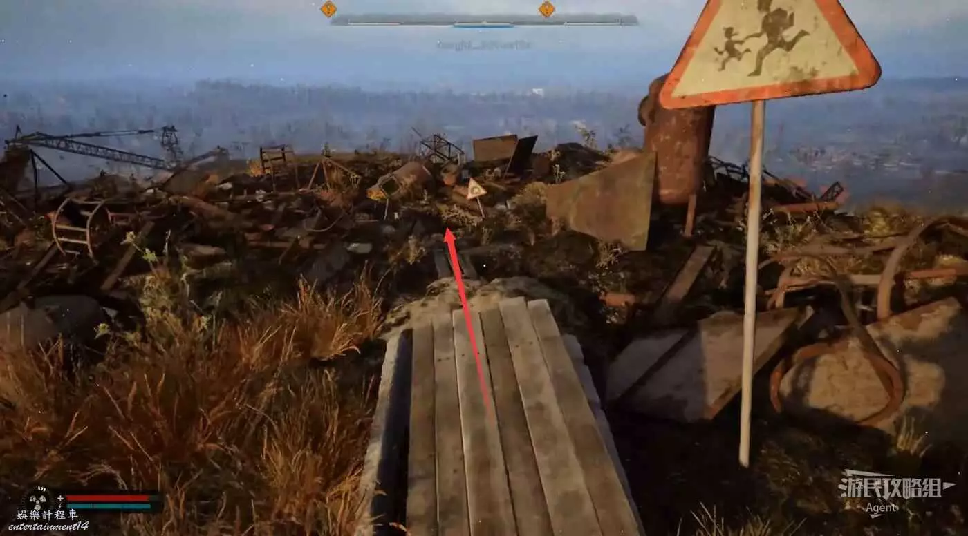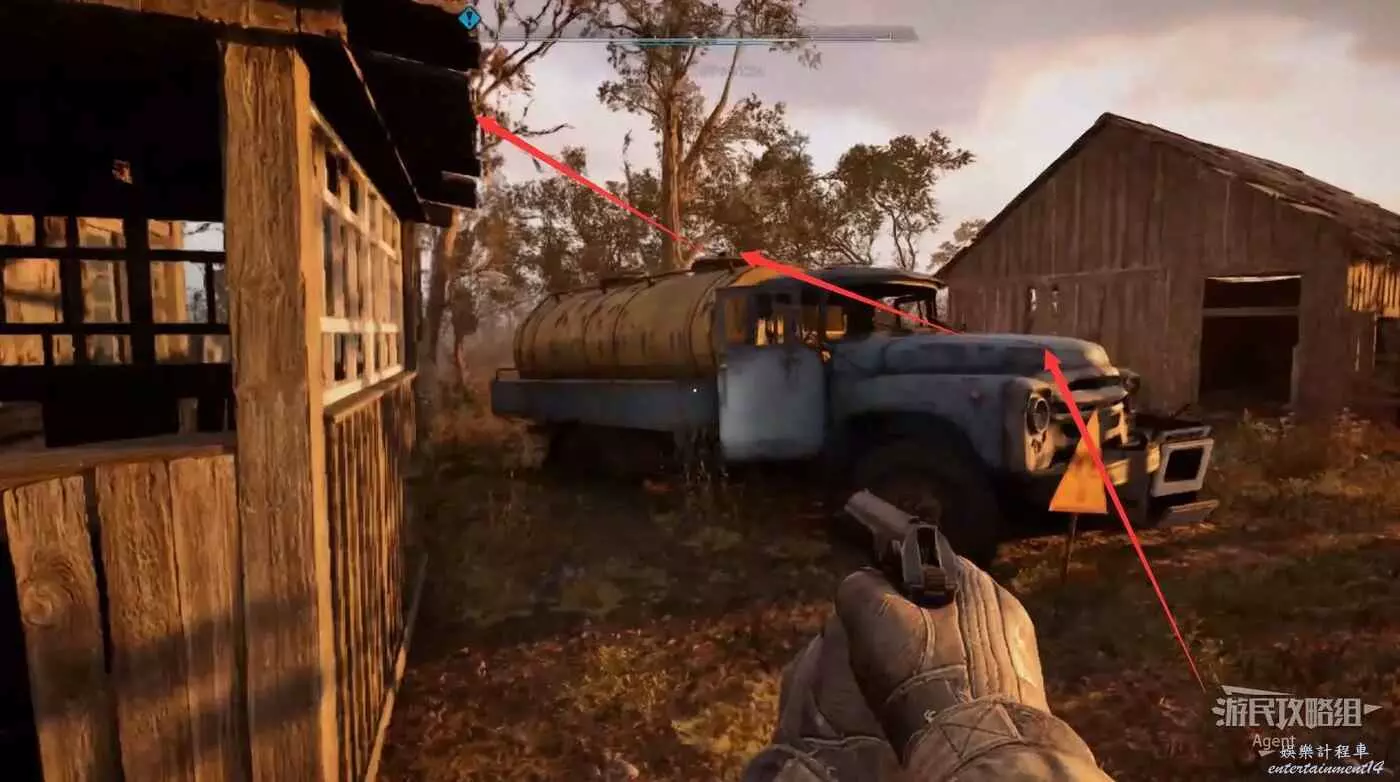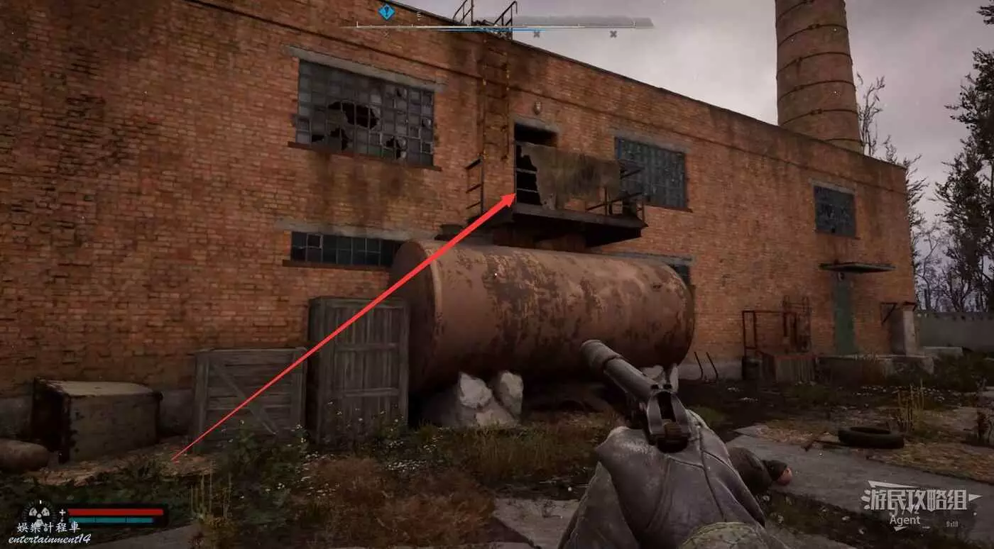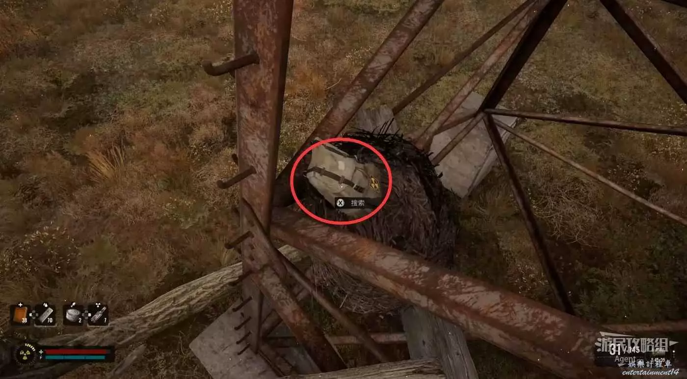 下圖位置有個儲藏點,扔螺栓使異常暫時消失,然後迅速跳到對面房子裡去,找到背包。