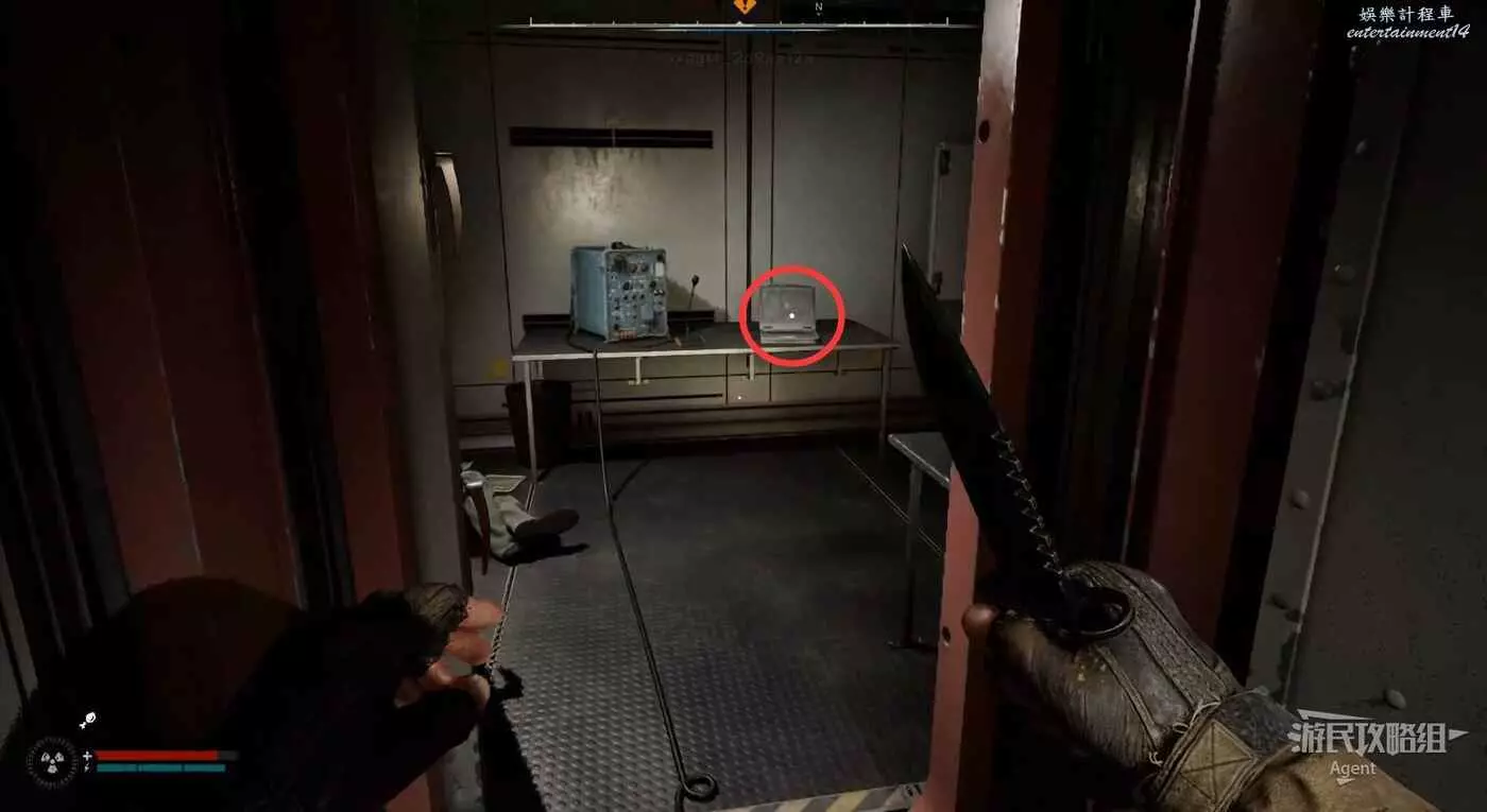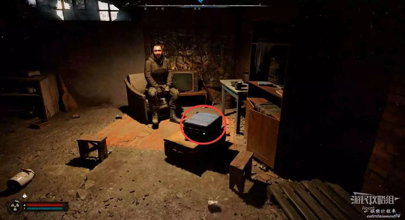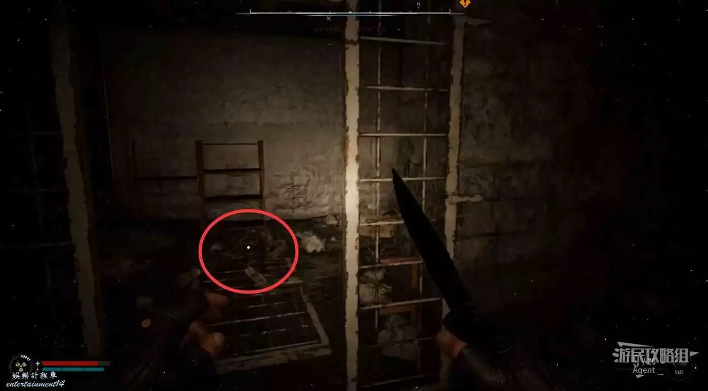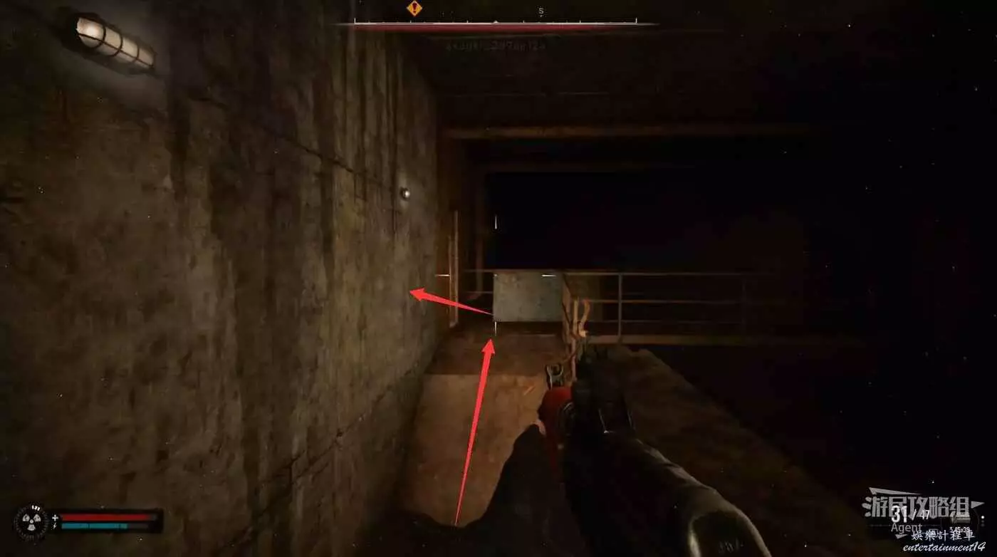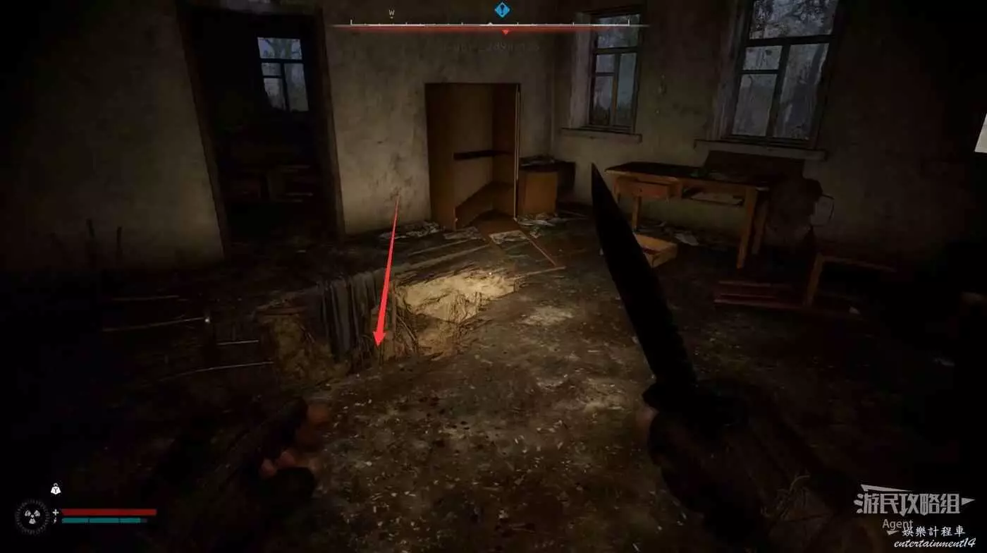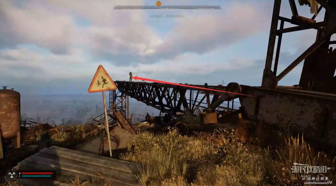 下圖位置有個儲藏點,扔螺栓使異常暫時消失,然後迅速跳到對面房子裡去,找到背包。