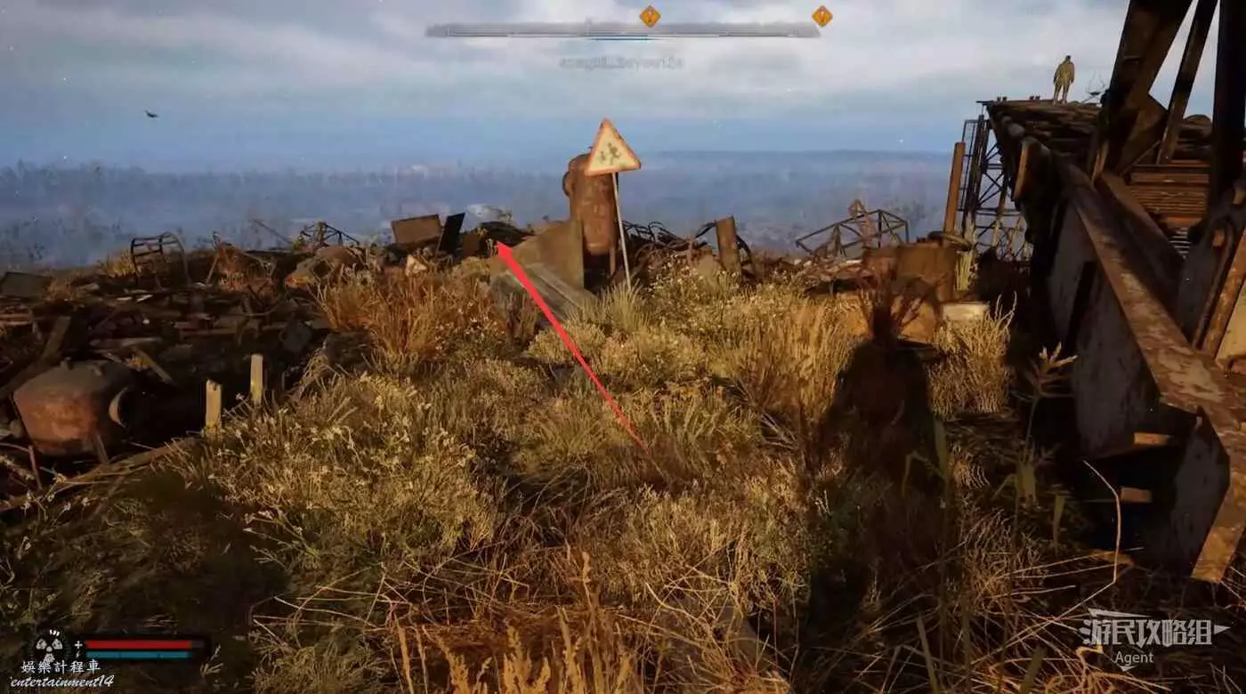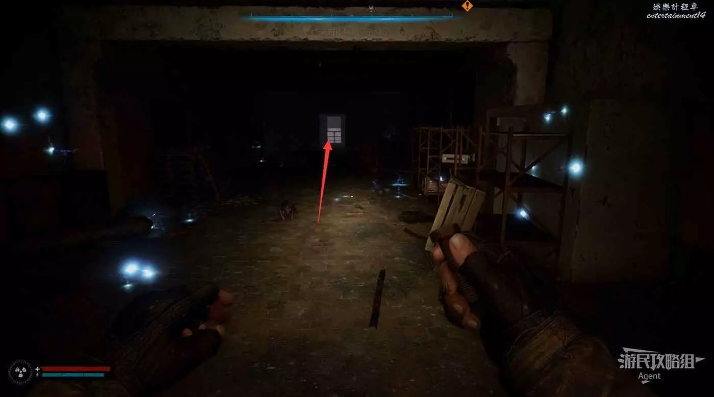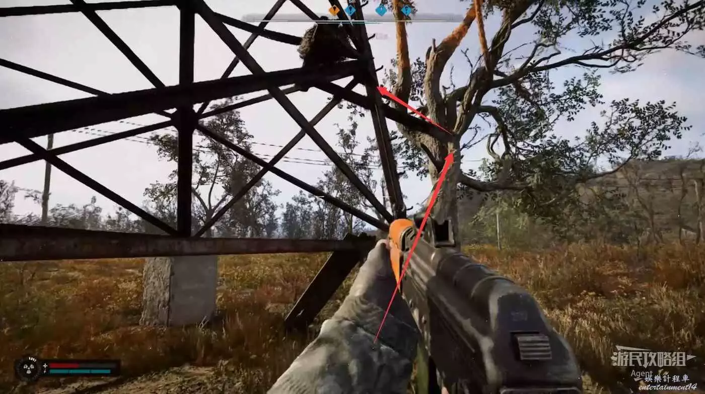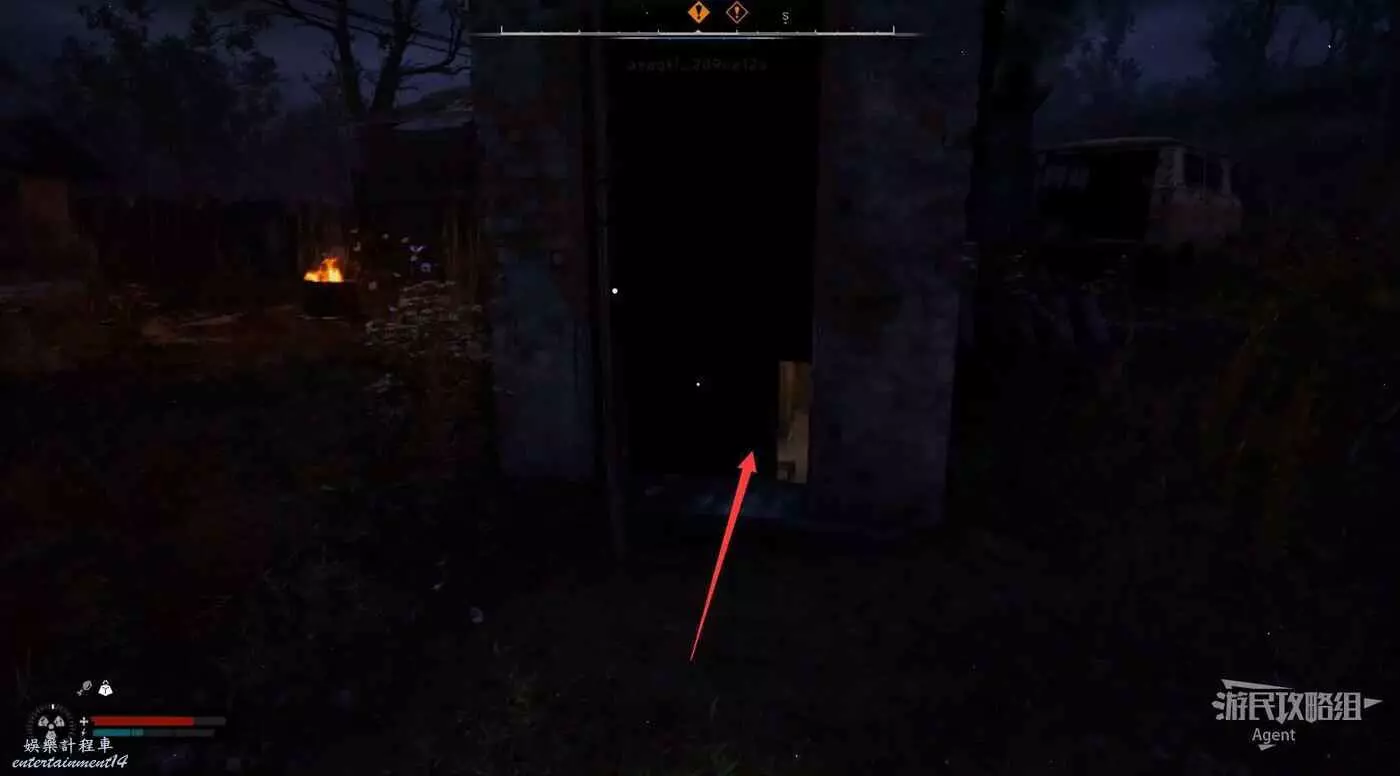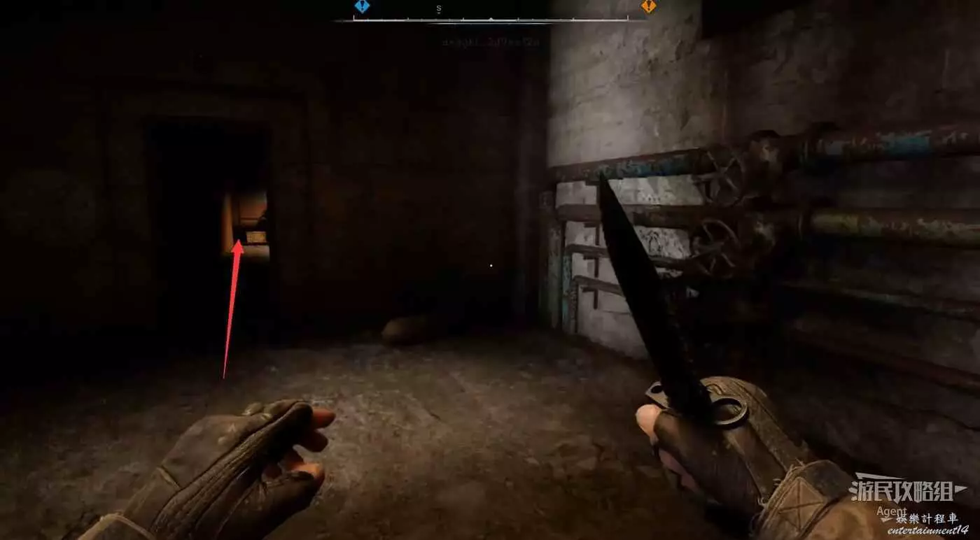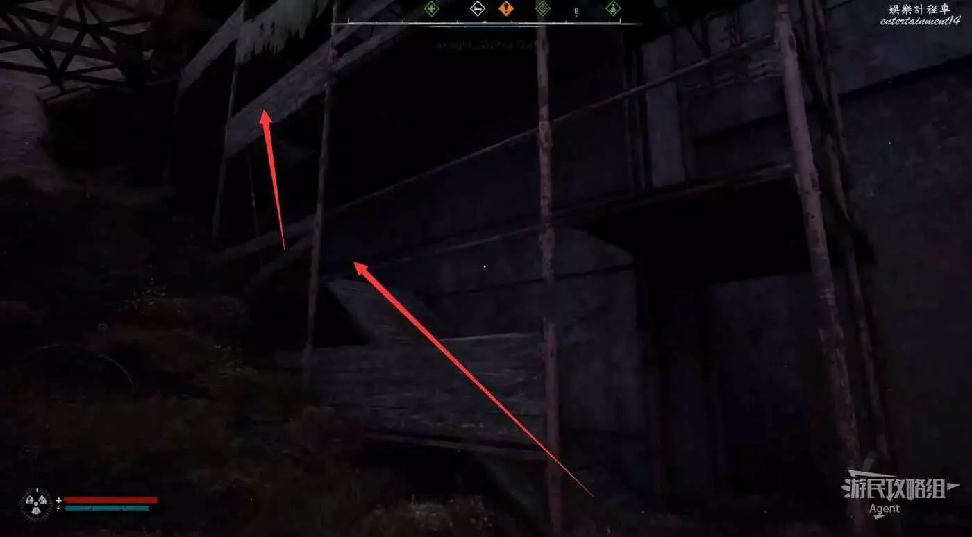下圖位置有個儲藏點,扔螺栓使異常暫時消失,然後迅速跳到對面房子裡去,找到背包。
