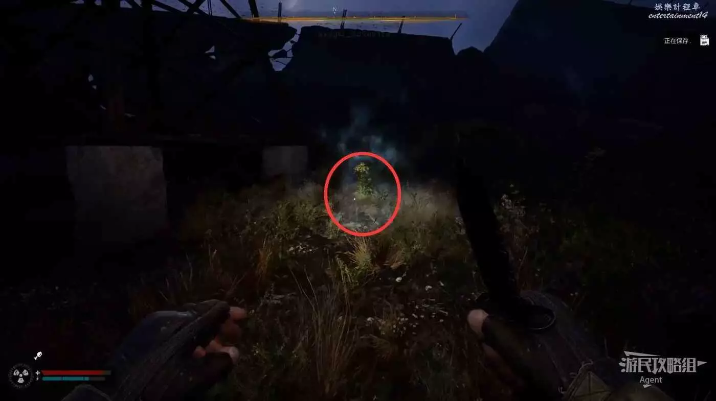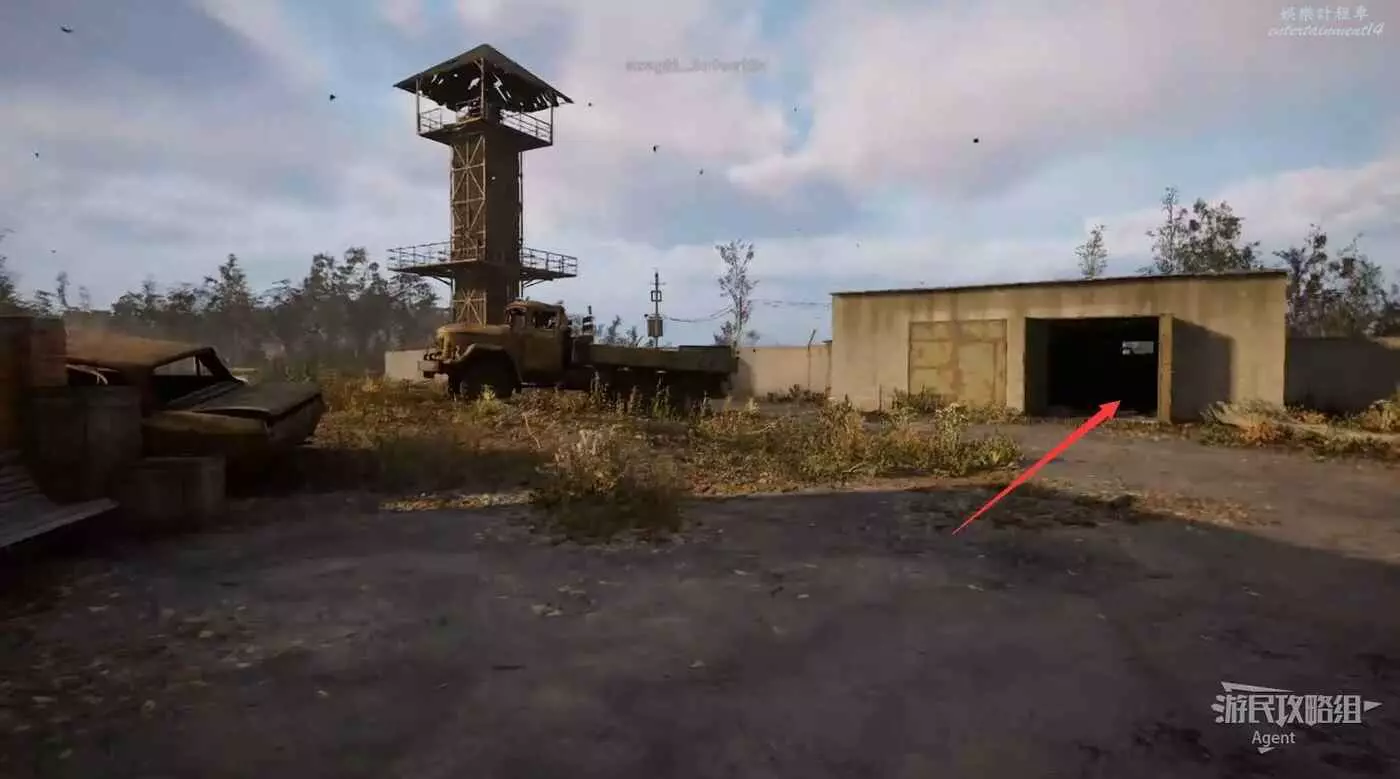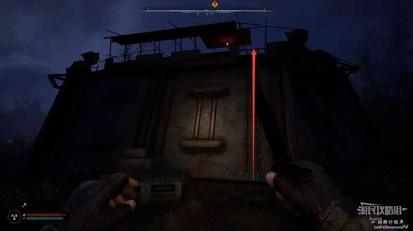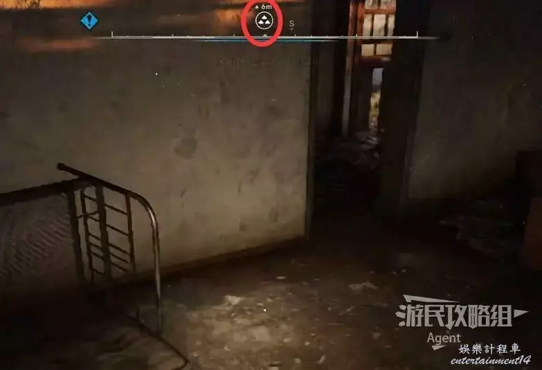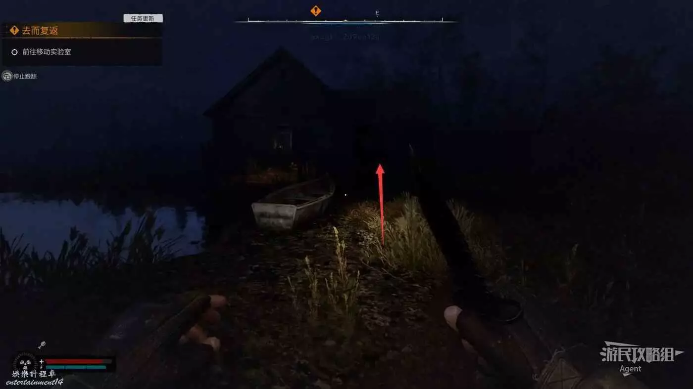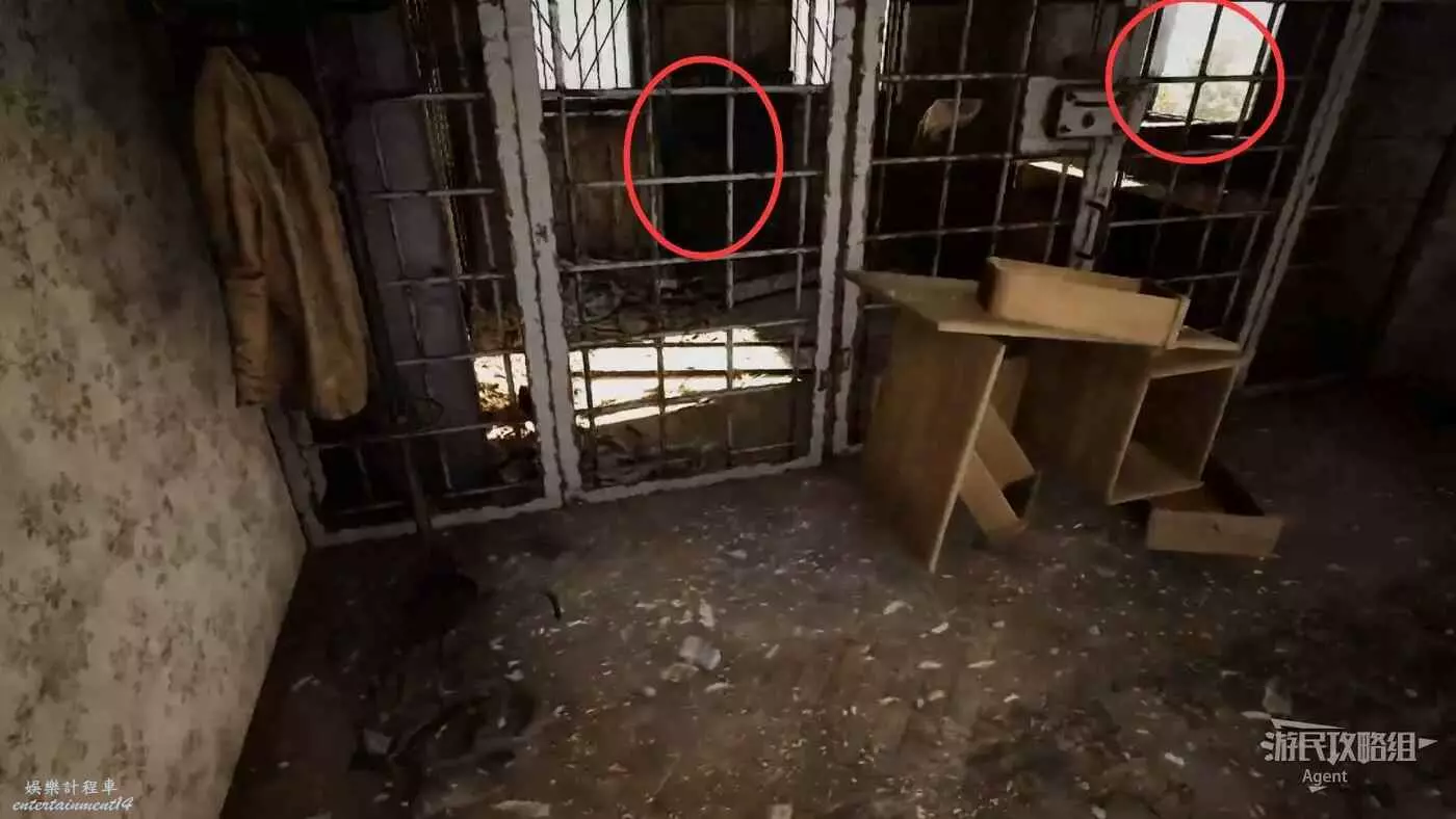 下圖位置有個儲藏點,扔螺栓使異常暫時消失,然後迅速跳到對面房子裡去,找到背包。