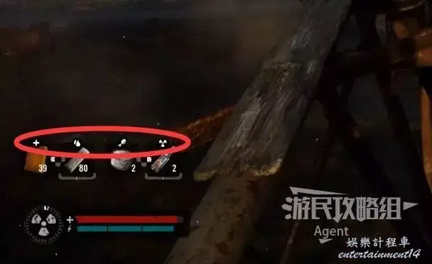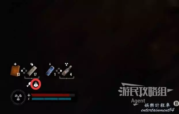 血條上方是道具快速欄,十字符號代表補血、水滴符號代表治療流血狀態、雞腿符號代表緩解饑餓、輻射符號代表治療輻射傷害、閃電符號代表補充體力。