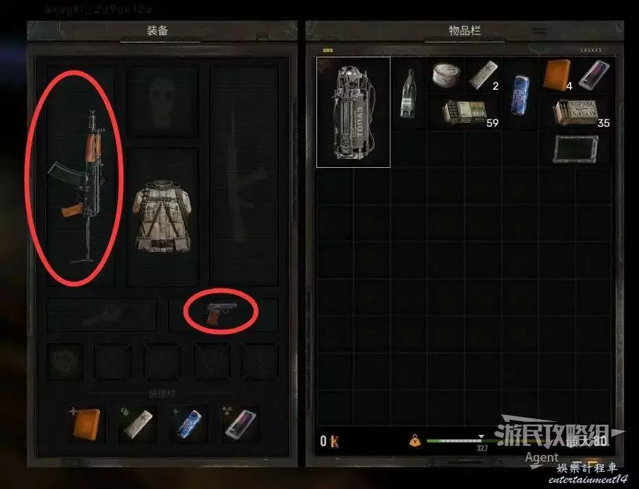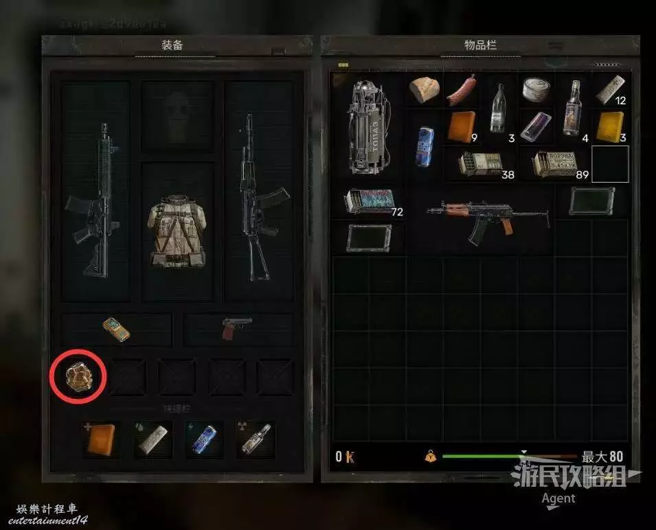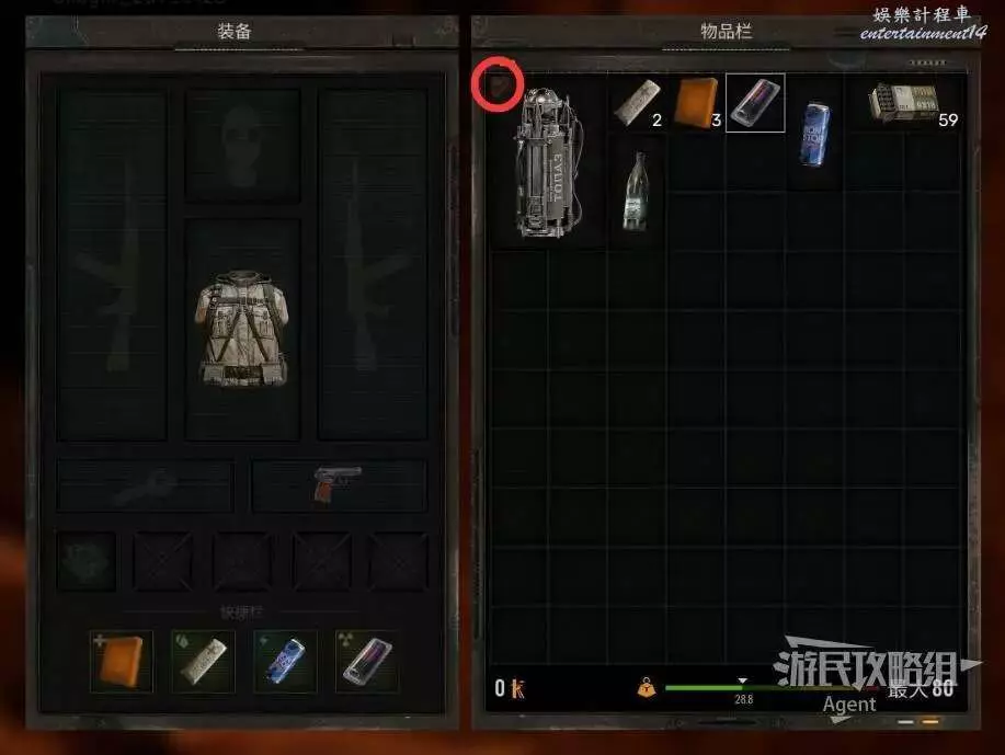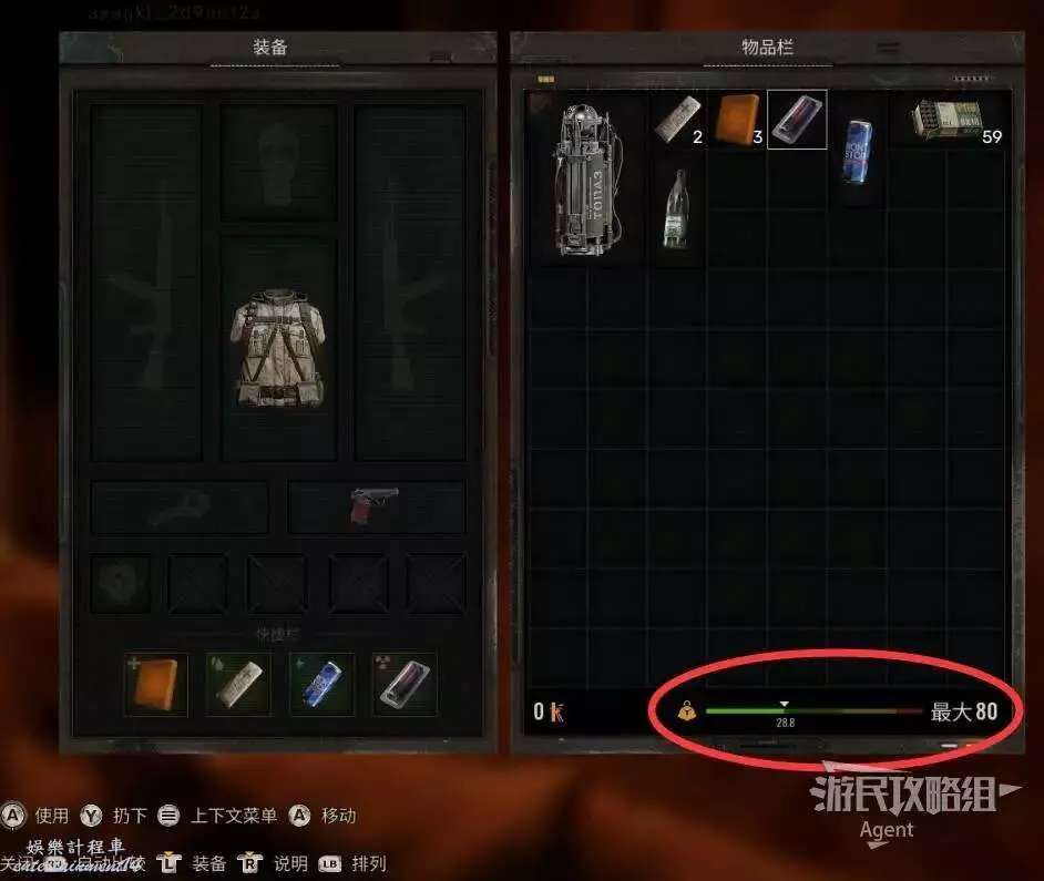 注意物品欄下面的負重值提示,當物品欄裡的東西比較多時,負重值到達黃色、紅色區域就會超重,會妨礙你的行動。多餘的物品可以回基地賣掉或者直接扔掉。