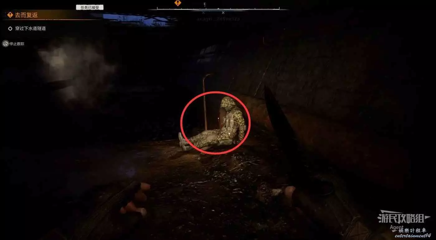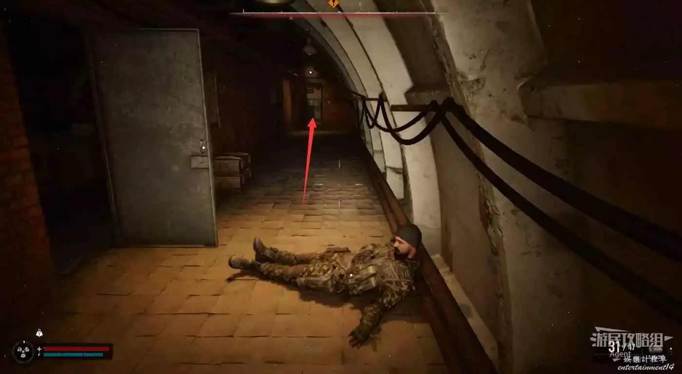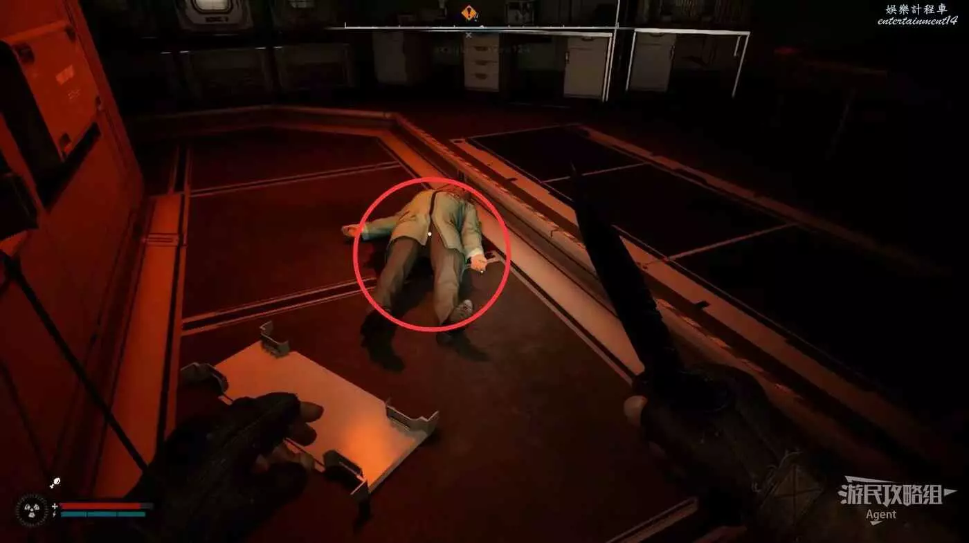 先去右邊拿到涅斯特的對話錄音。然後回來往前直走,找到個屍體搜刮。右邊還有兩條相通的岔路不用管,裡面什麼都沒有,還容易轉暈。