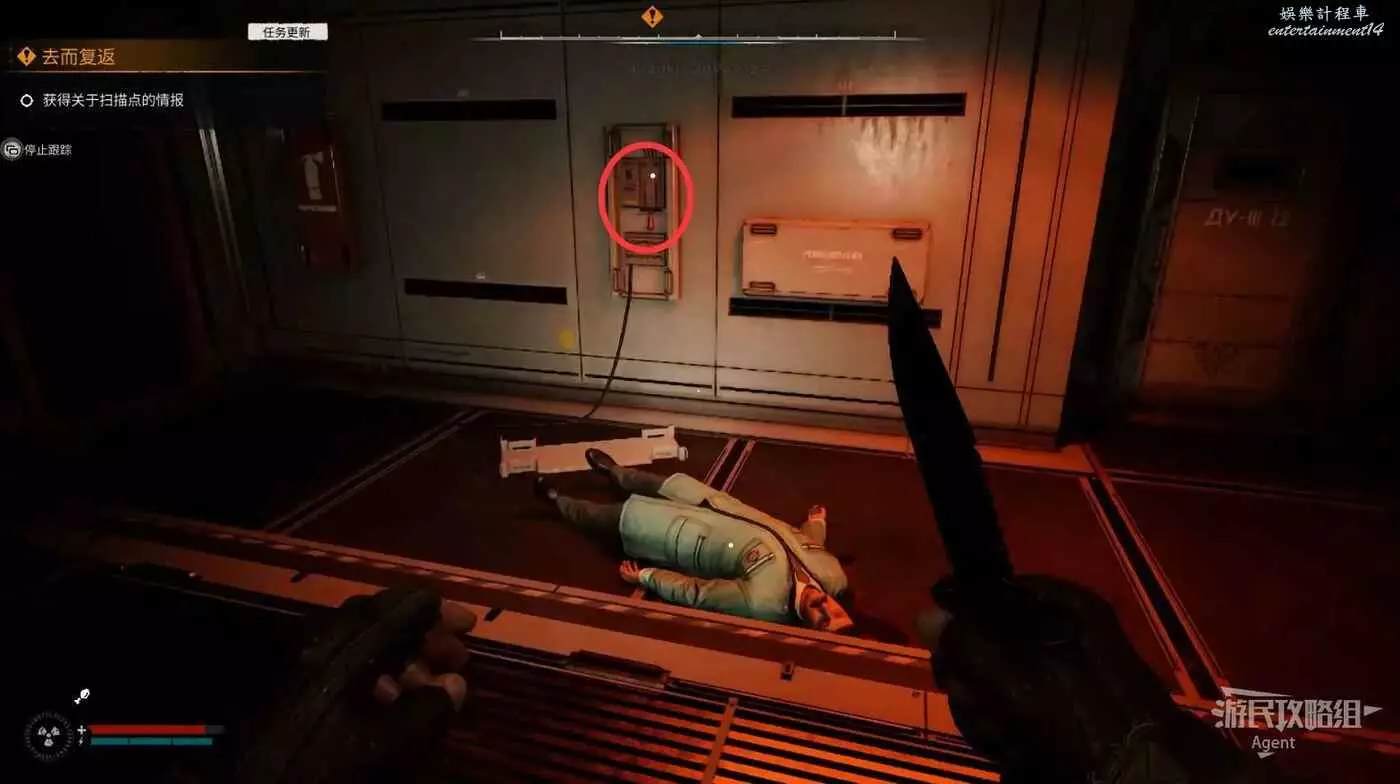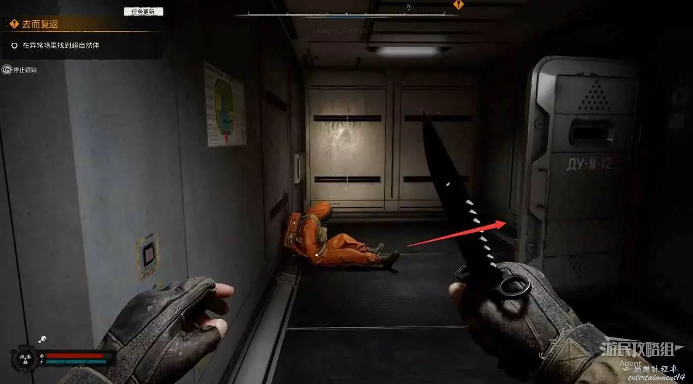 穿著防護服的屍體處,剛才沒拿探測器的話現在拿,然後從旁邊的門出去。