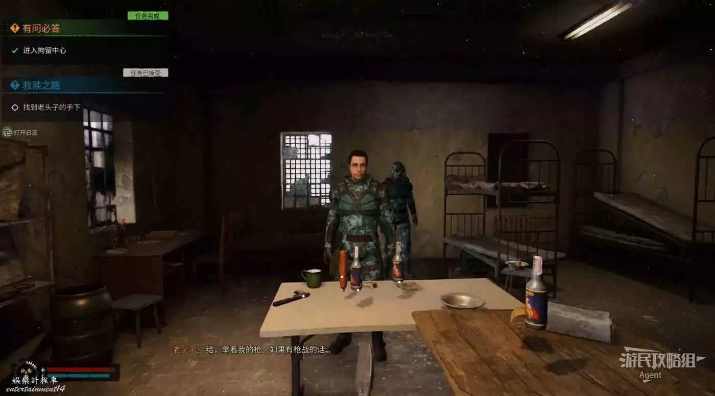 來到拘留中心,上二樓見到老頭子,他會給你把帶消音器的手槍,用於潛行暗殺。