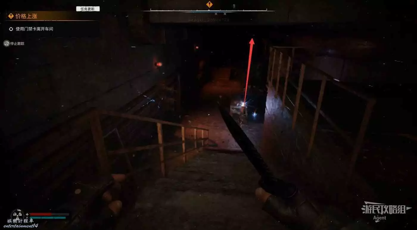 搜刮完車間後往回走,爬梯子上去到房子裡搜刮,最後用門禁卡開門離開。
