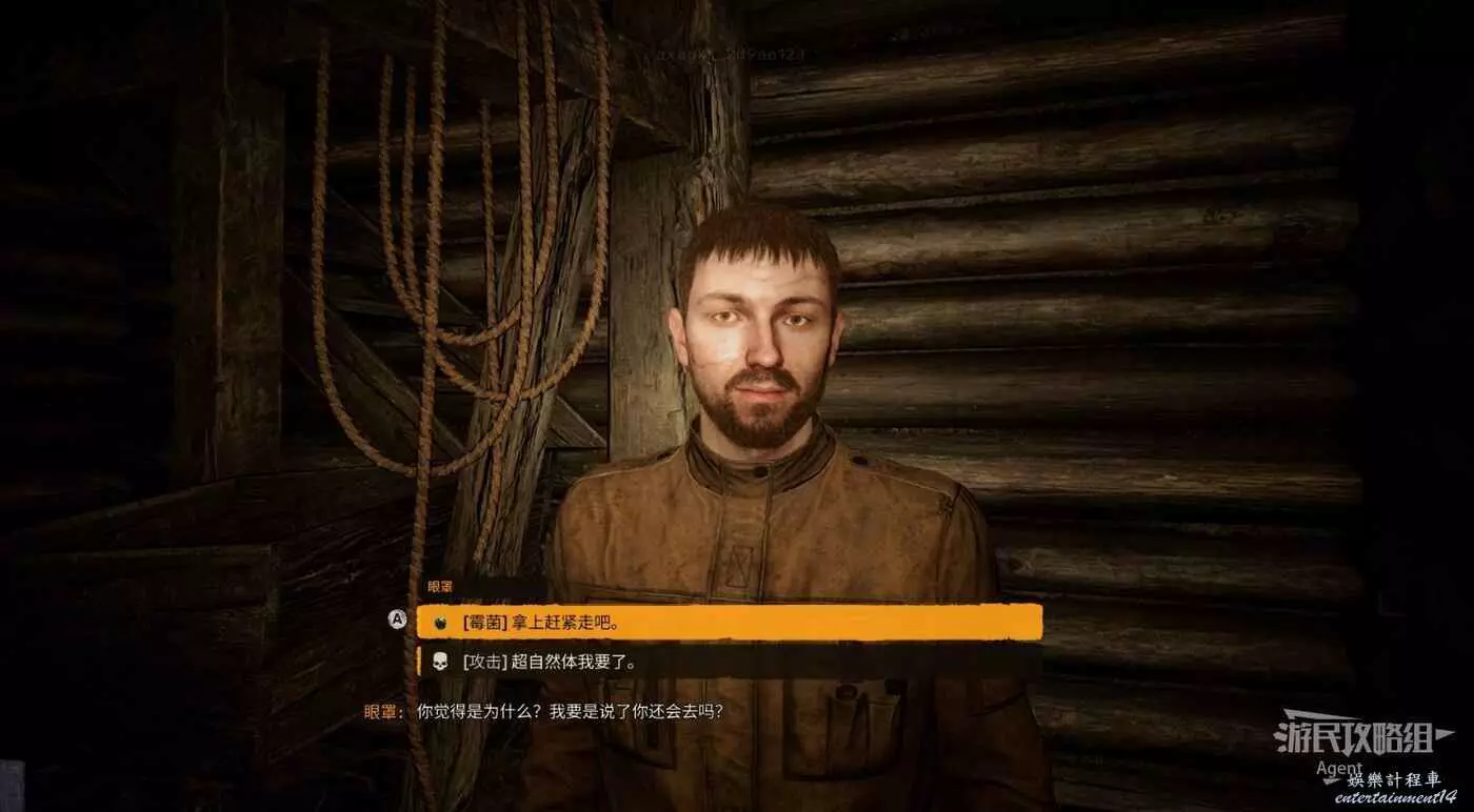 來到輻射危險標誌倉庫,到樓上找強盜打聽眼罩。可以付錢問情報,或者直接開打。