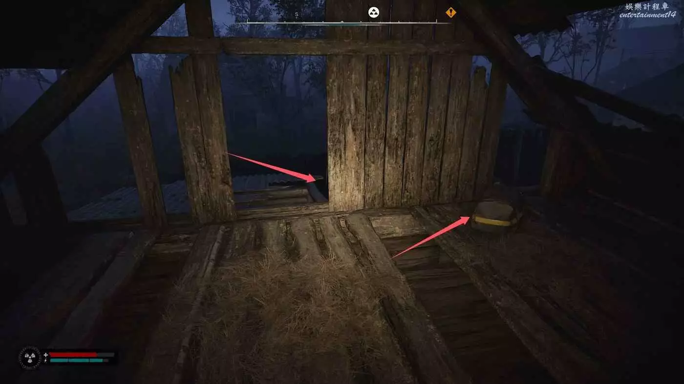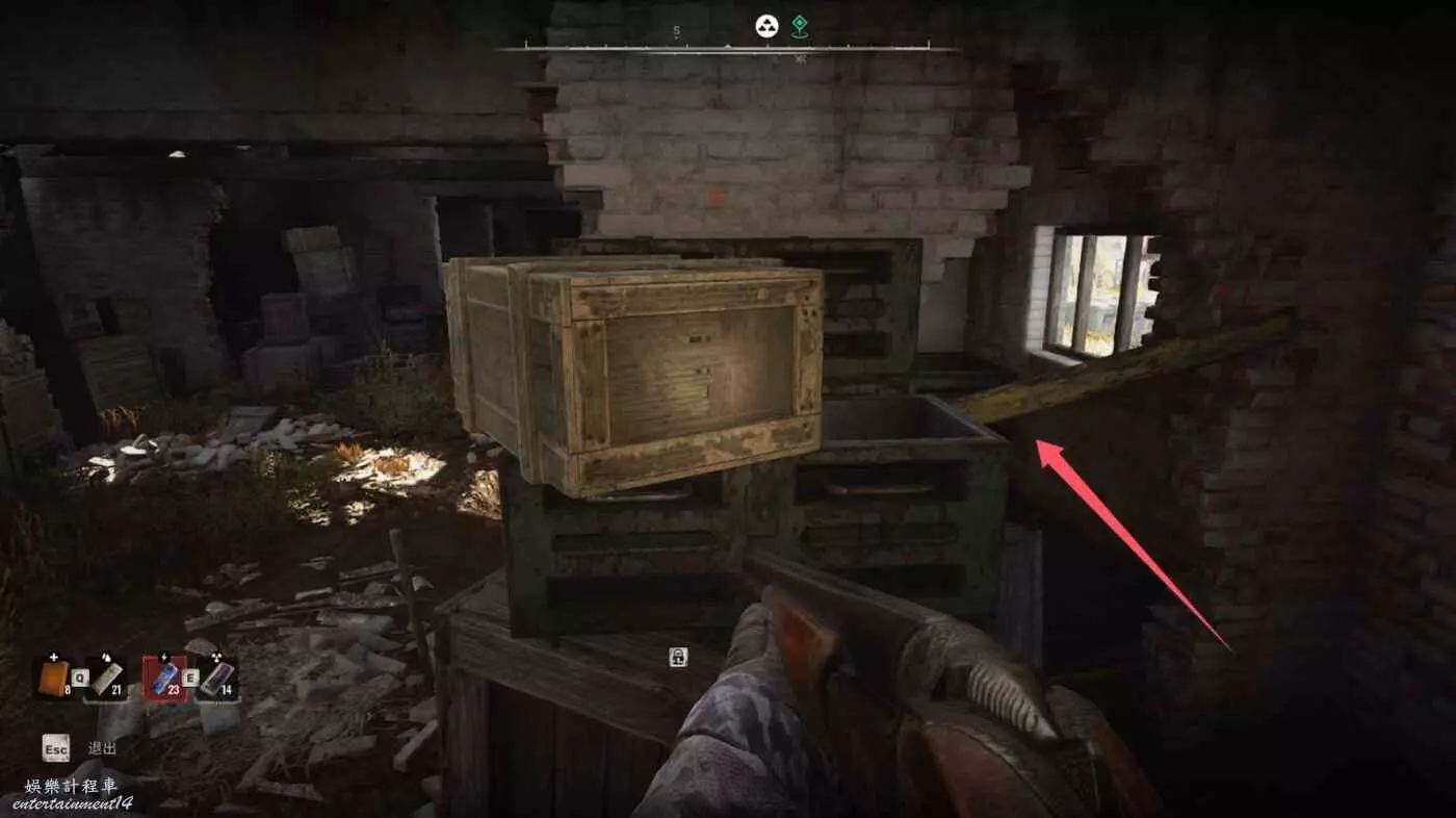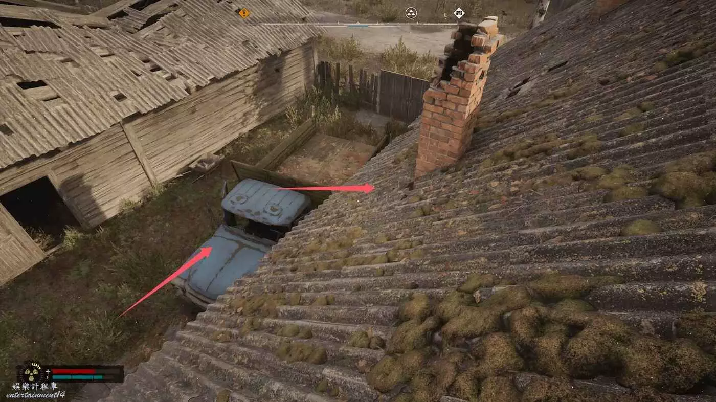 這個在小棚子上面,從塌掉的這兒上去後,走右邊這塊房頂,然後翻過去,一定要快,不然會被傳走。