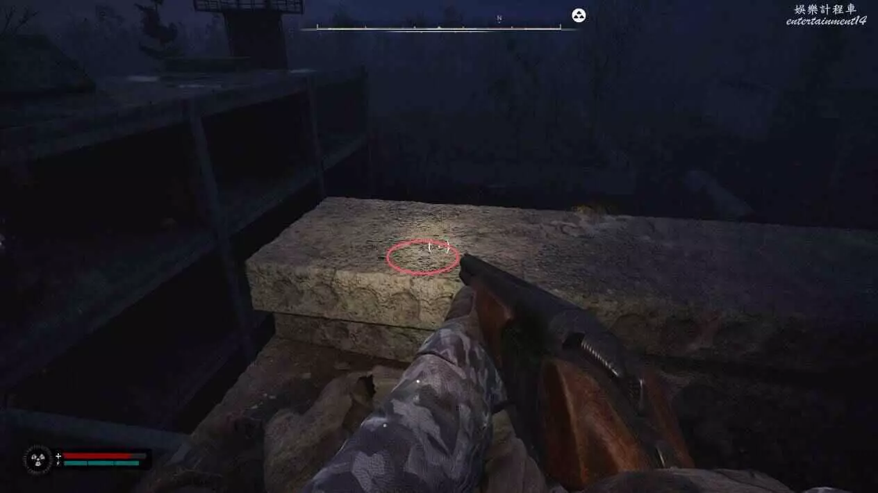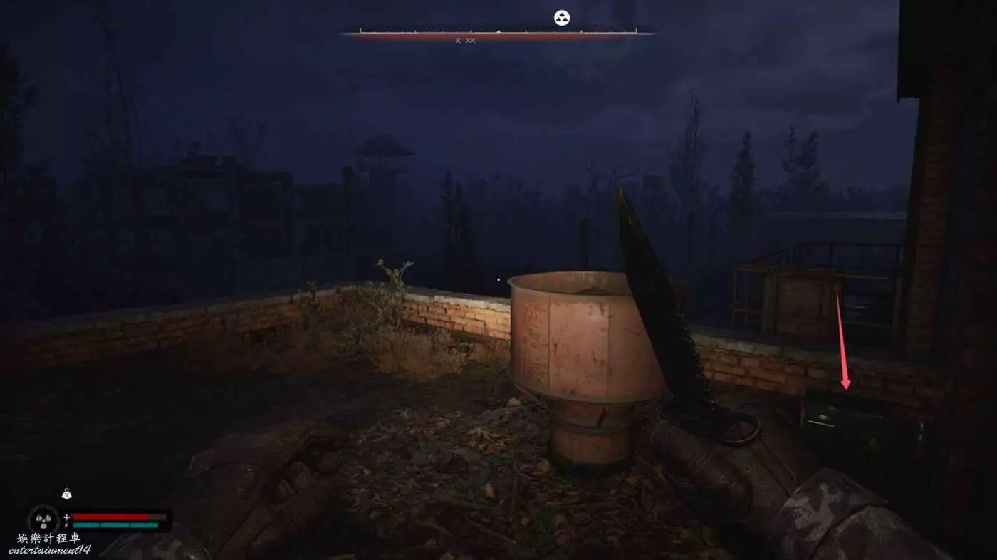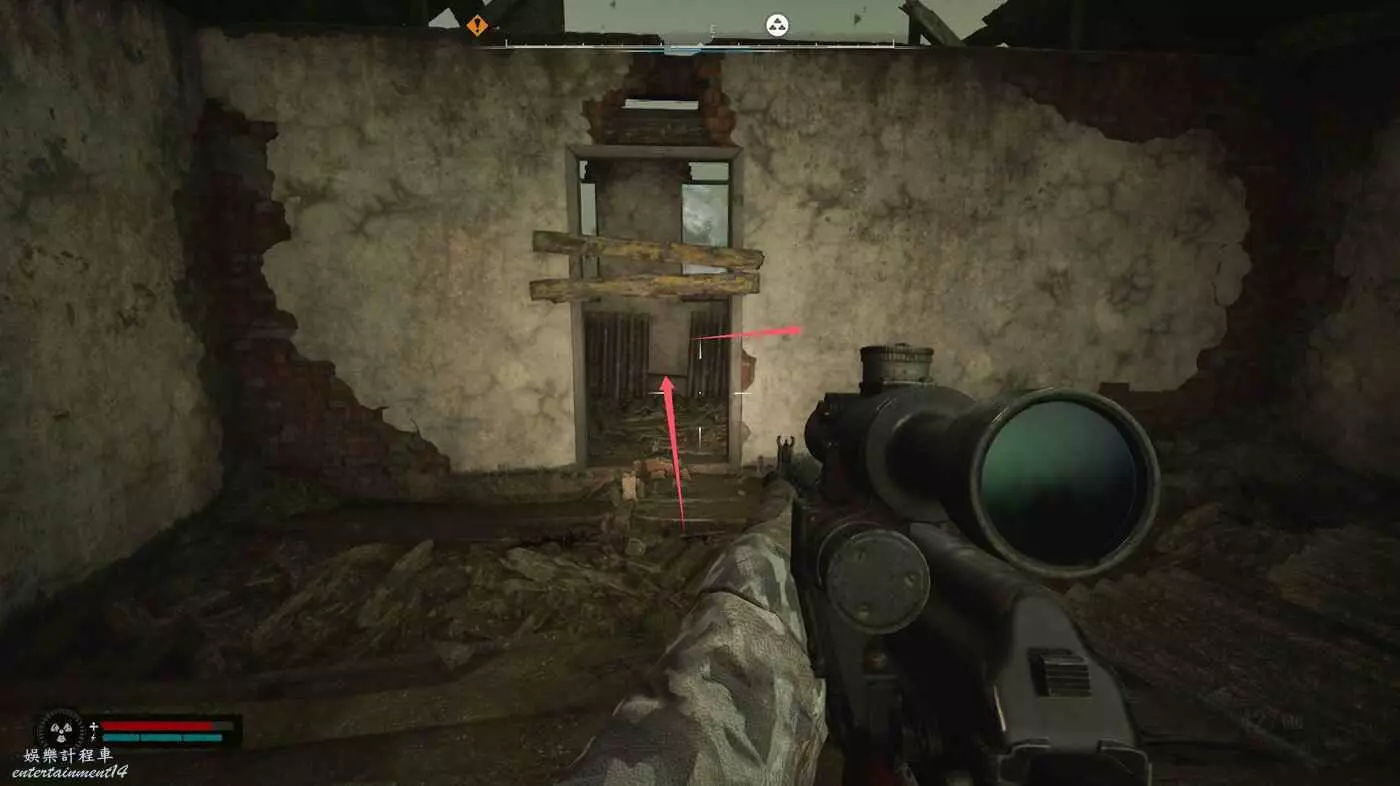 這個在小棚子上面,從塌掉的這兒上去後,走右邊這塊房頂,然後翻過去,一定要快,不然會被傳走。
