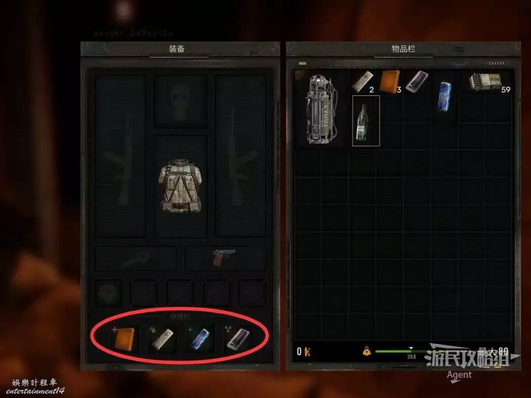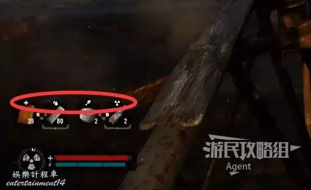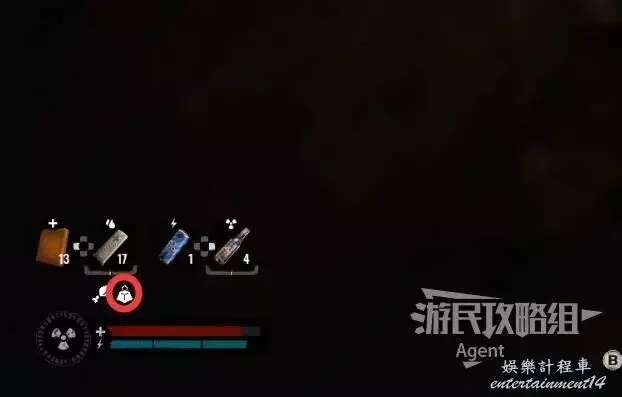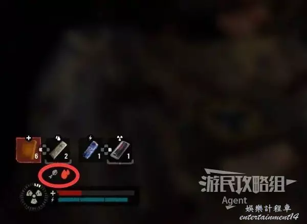 血條上方是道具快速欄,十字符號代表補血、水滴符號代表治療流血狀態、雞腿符號代表緩解饑餓、輻射符號代表治療輻射傷害、閃電符號代表補充體力。