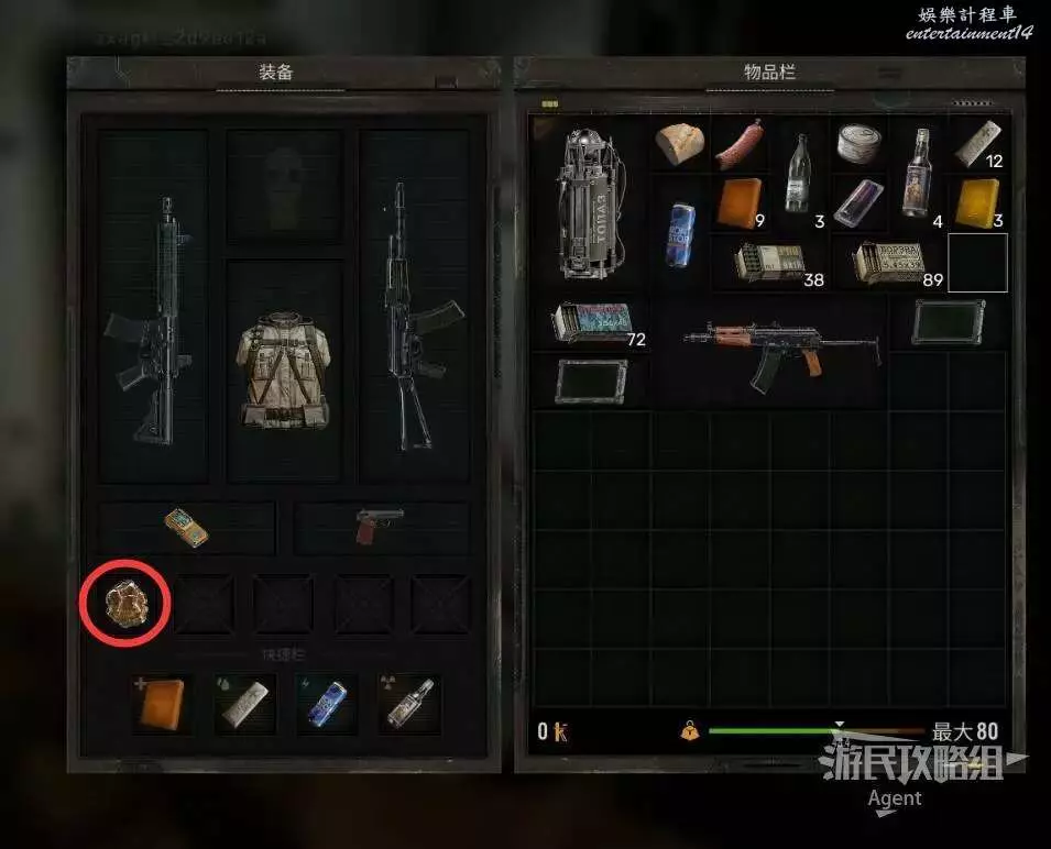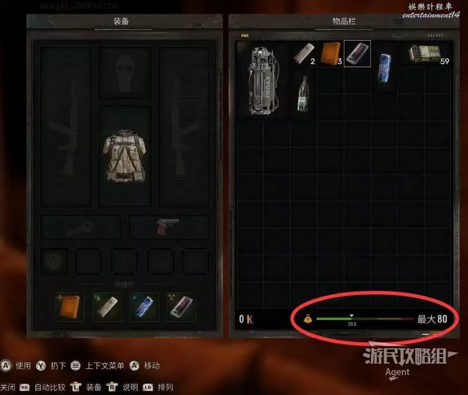 注意物品欄下面的負重值提示,當物品欄裡的東西比較多時,負重值到達黃色、紅色區域就會超重,會妨礙你的行動。多餘的物品可以回基地賣掉或者直接扔掉。