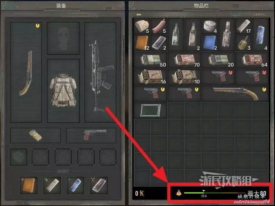 角色的初始負重默認為80kg,當負重較高時,移動速度就會降低,體力會消耗更快,體力恢復也會變慢。如果超出了負重上限,角色將無法移動,直到丟出物品欄中的部分物品。角色的負重上限和當前負重可以在物品欄下方查看,參考下圖。