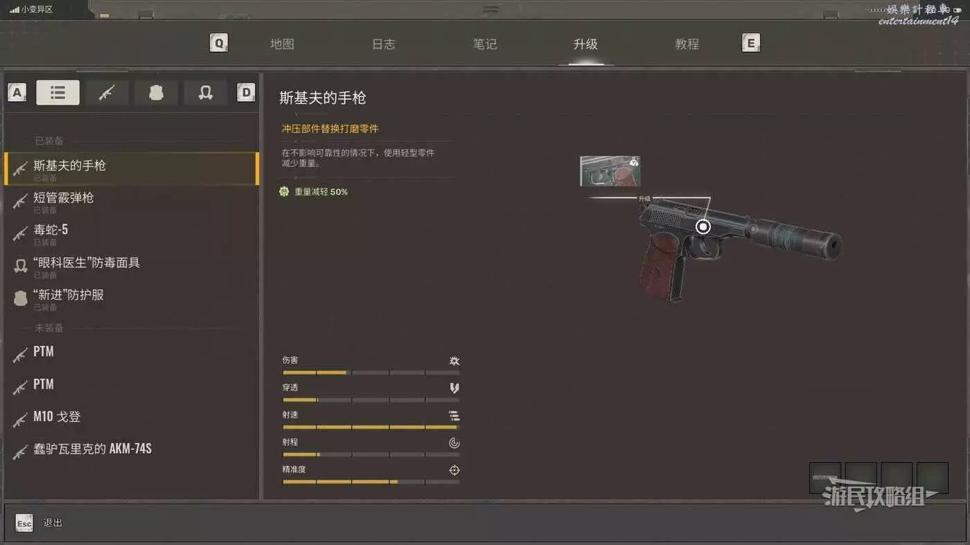 升級裝備可以降低其本身的重量,例如主角的手槍,升級之後重量能減輕50%,這樣就會更加方便攜帶。同時這些升級通常比提升負重上限的成本更低,很適合前期考慮。