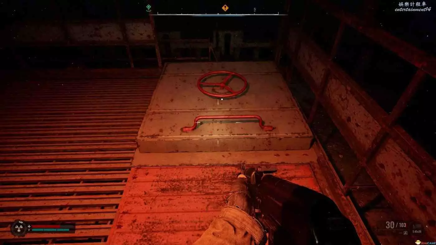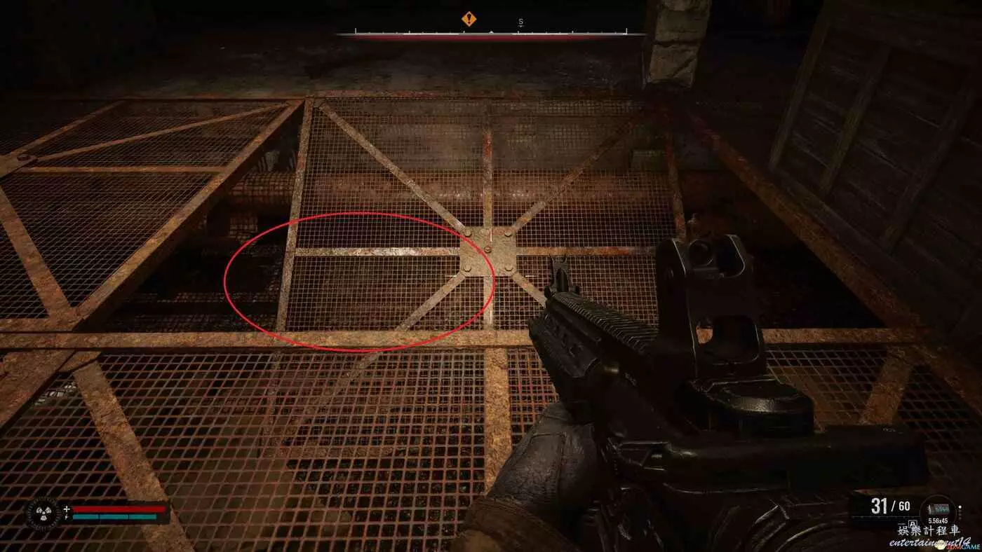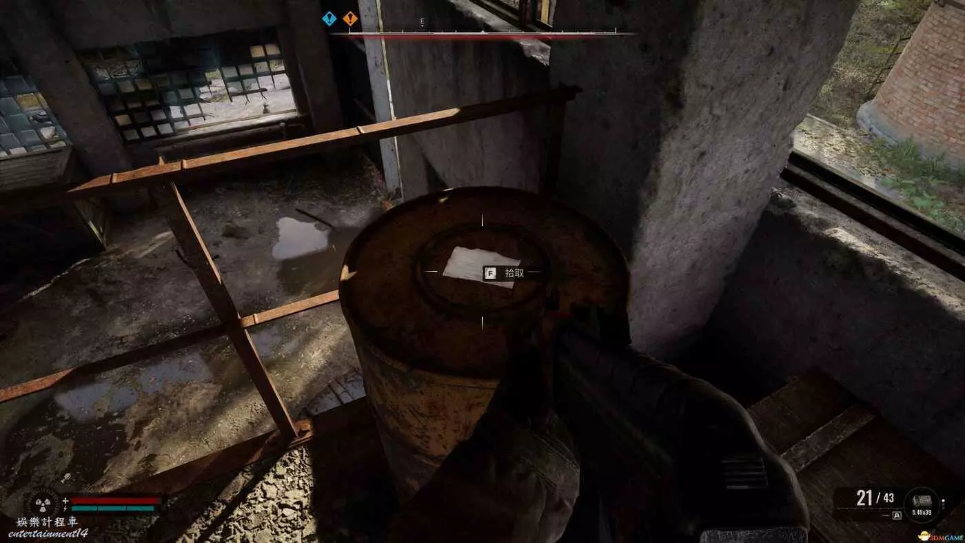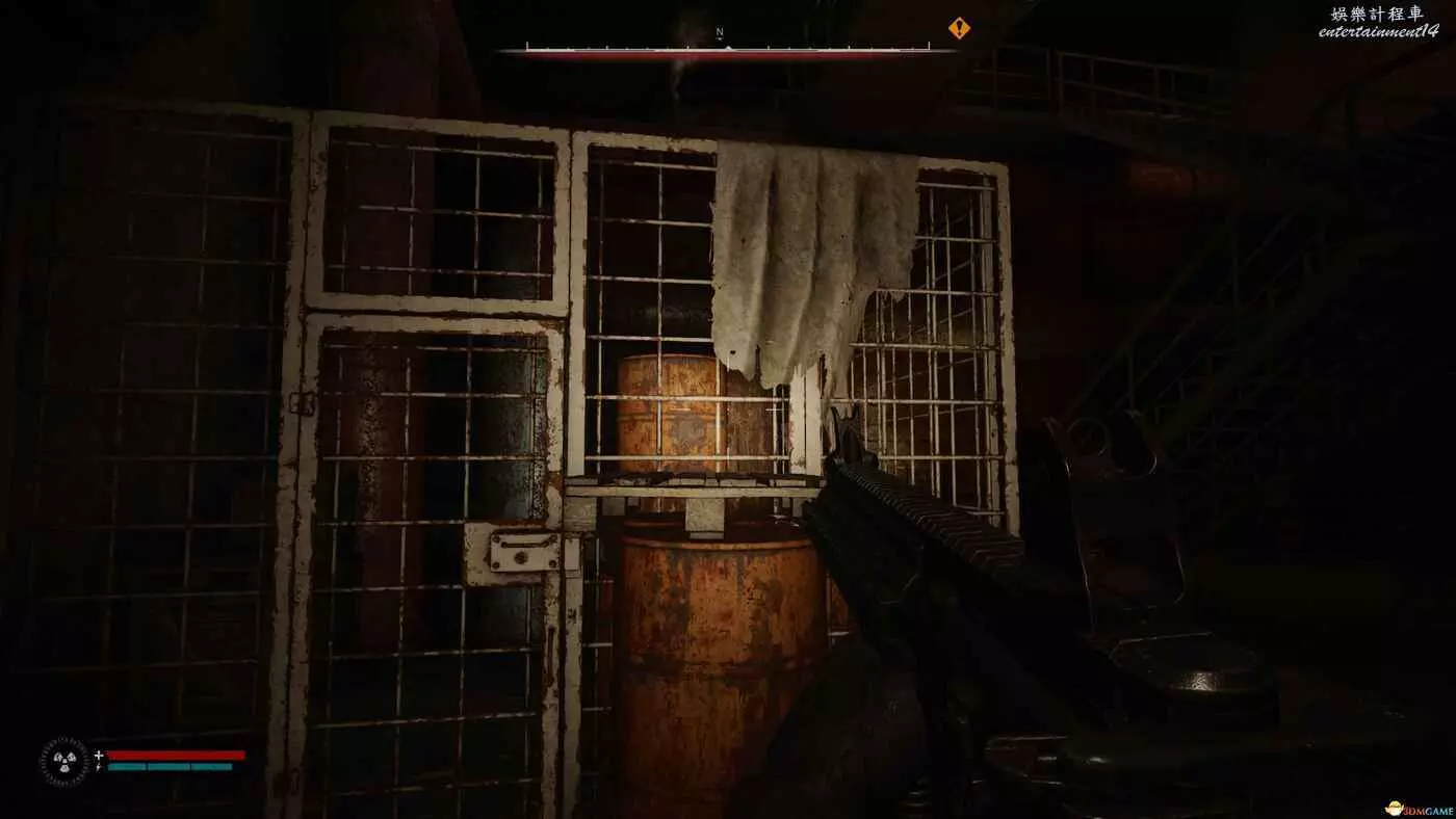 樓梯上去後鐵籠子裡有補給背包,從右側油桶跳進去,圖中油桶跳出來。
