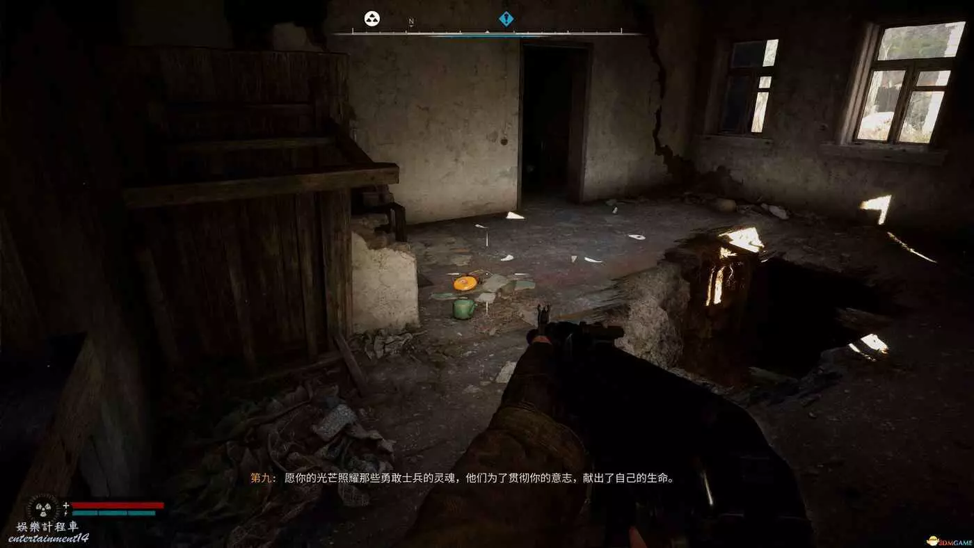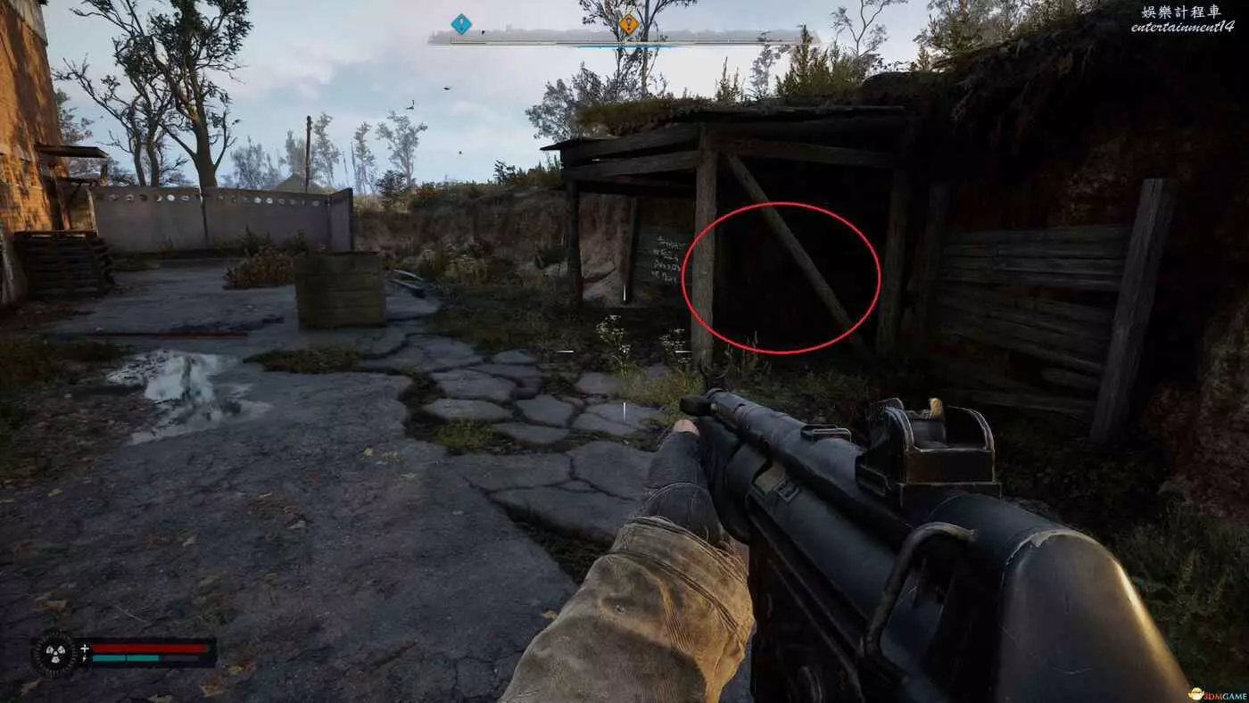 不要進入水中,向圍牆走,可以從圍牆右邊的破房子穿過去(還有屍體可以搜刮)。