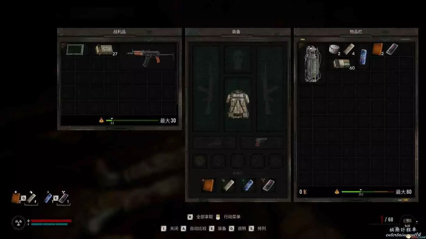 Q鍵道具補血、止血,E鍵道具減少饑餓、恢復體力(耐力)、清除輻射。短按或者按住就會使用不同的道具,所以q\e兩個鍵可以使用4個道具。