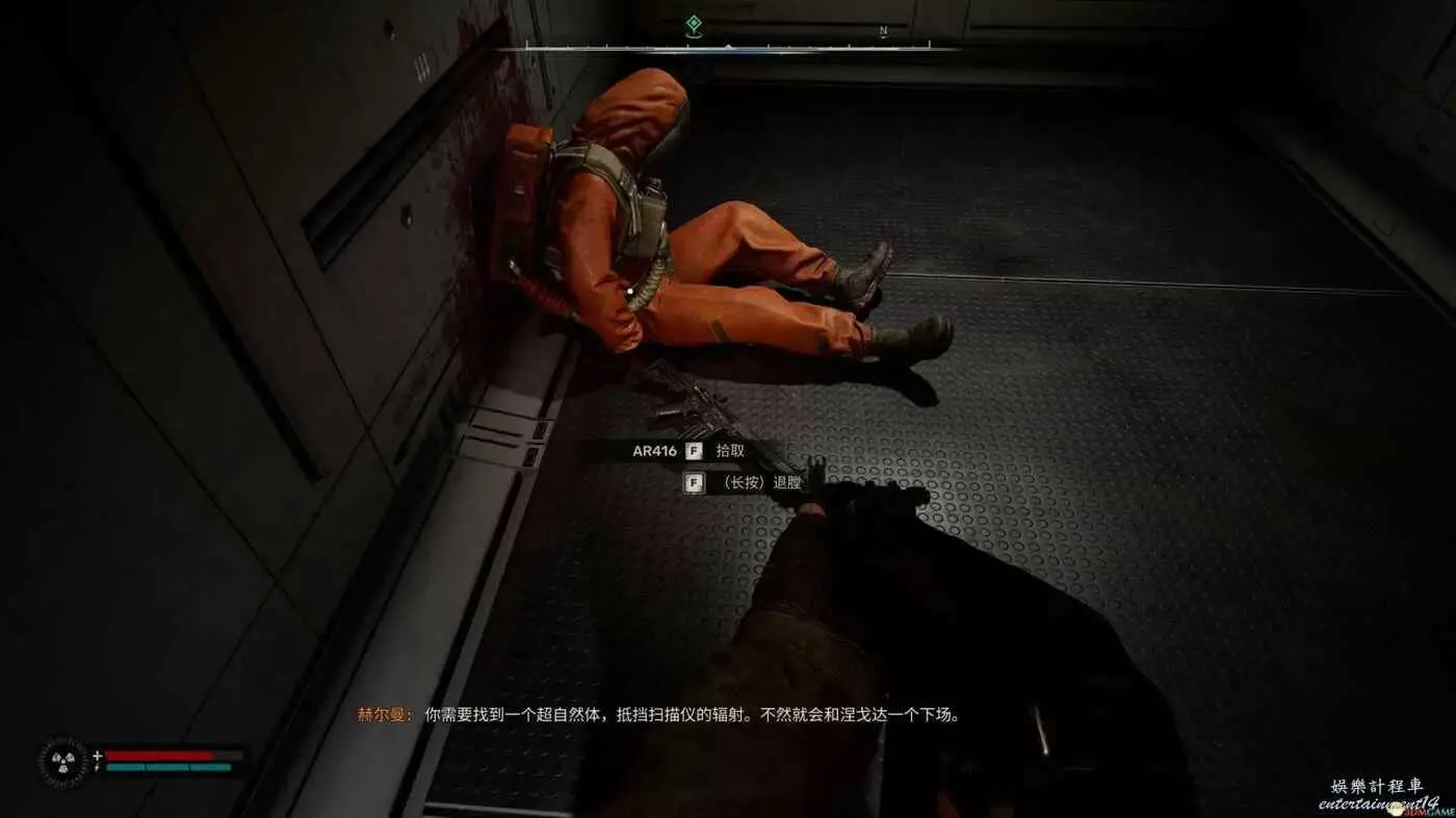 最後走到封閉門口(此時封閉口已經打開),拾取防護服屍體旁的ar416,也就是大家熟悉的hk416.