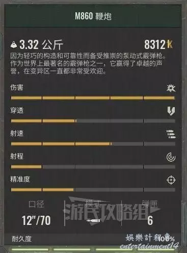 M860鞭炮是一把連噴,重量為3.2kg,彈匣為6,口徑12″/70,模式為單發,庫存格是5×2。是前期就能獲取的一把非常好用的連噴,傷害資料如下圖所示。