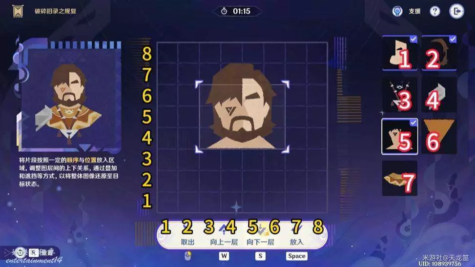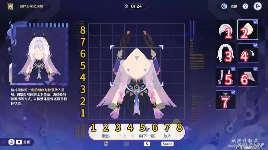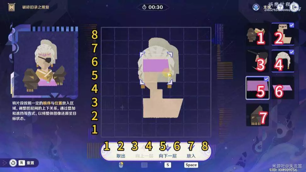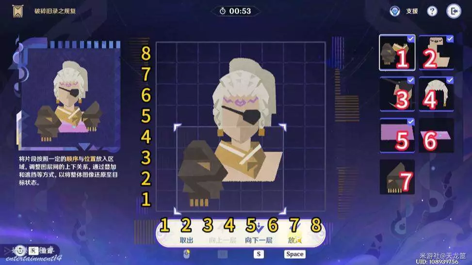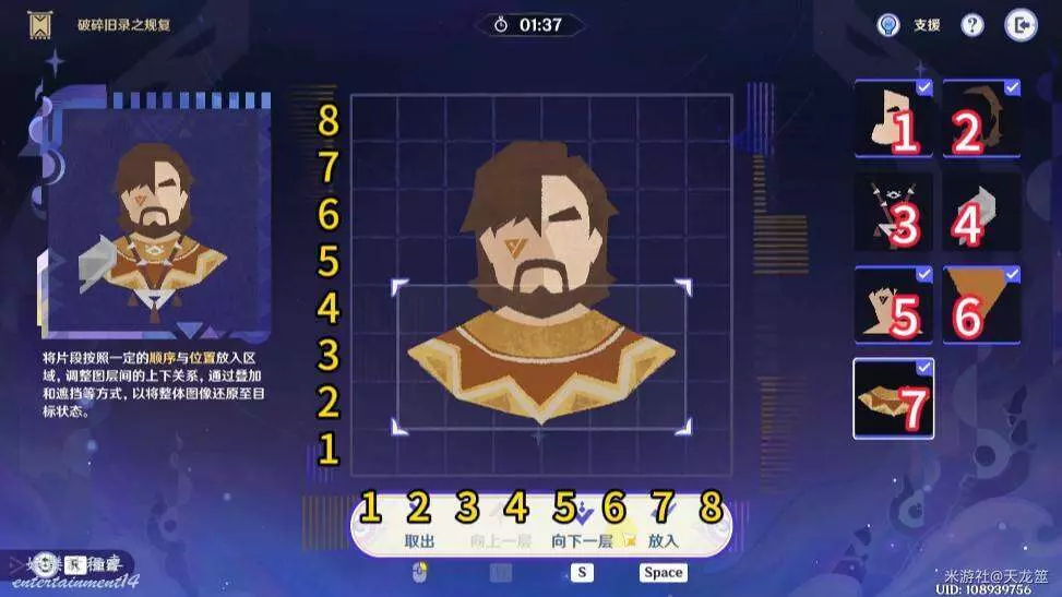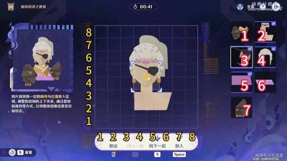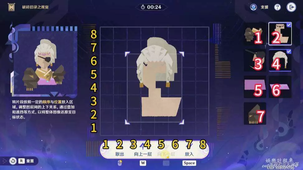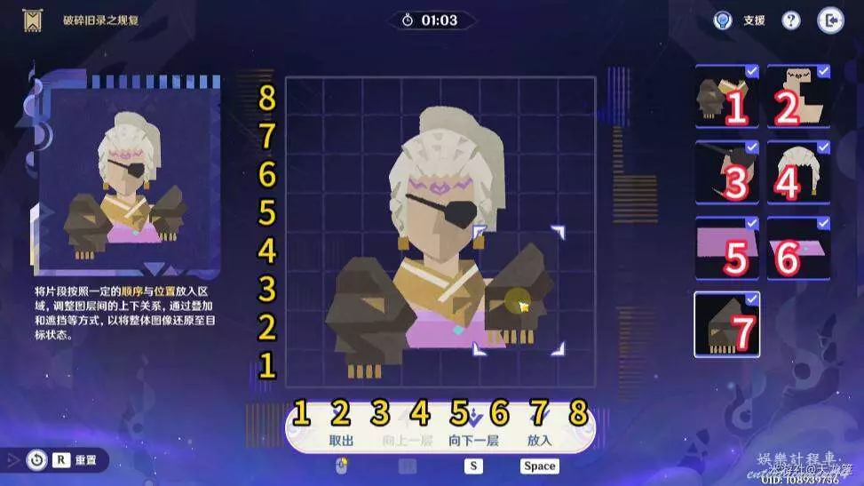 7、7號拼圖放在「2,3」的位置,再將1號拼圖上移一層即可