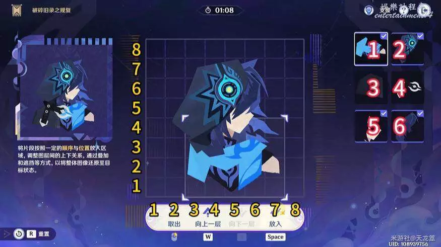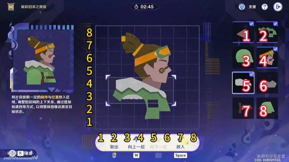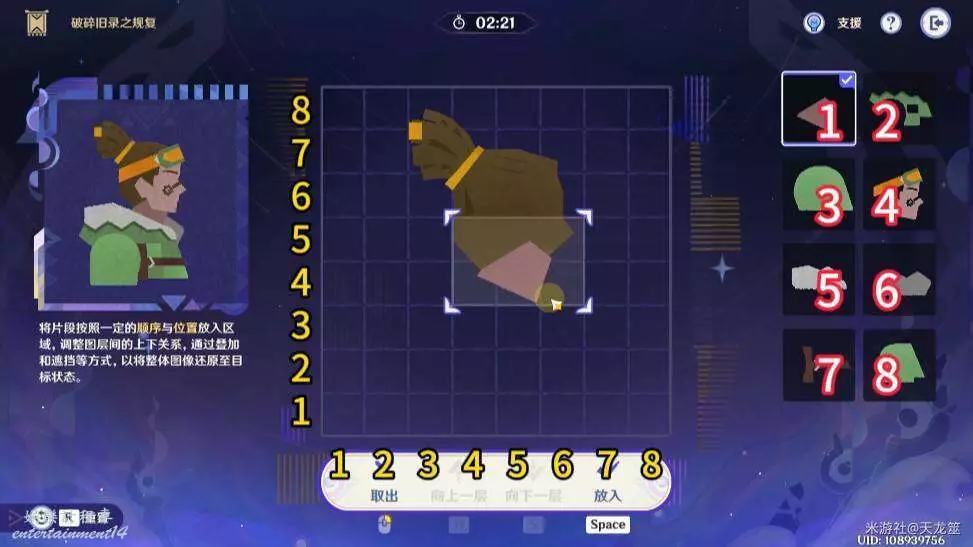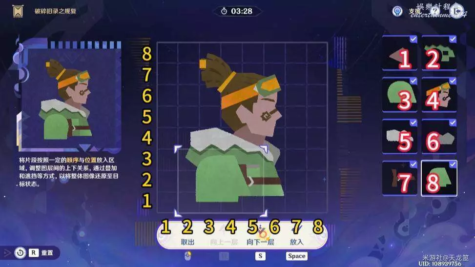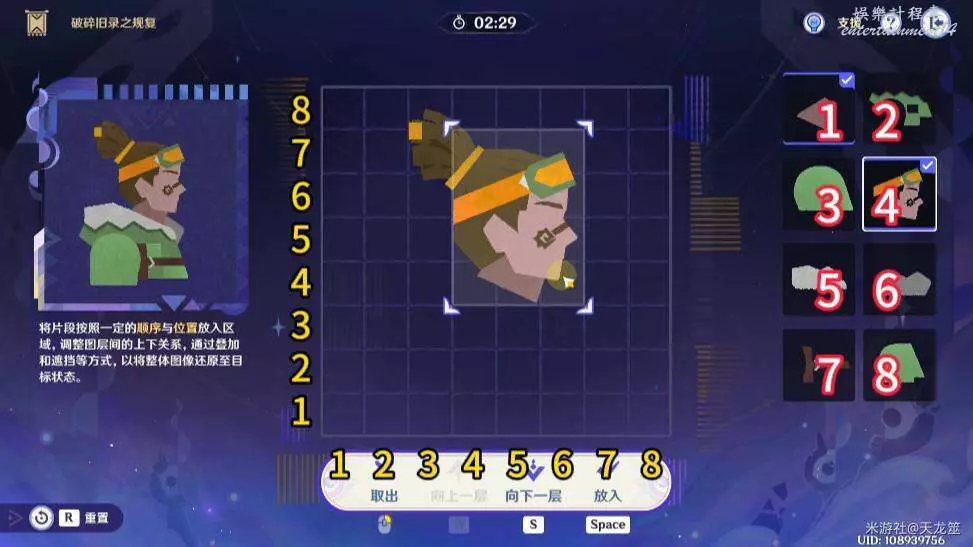 8、8號拼圖放在「1,2」的位置,下移兩層