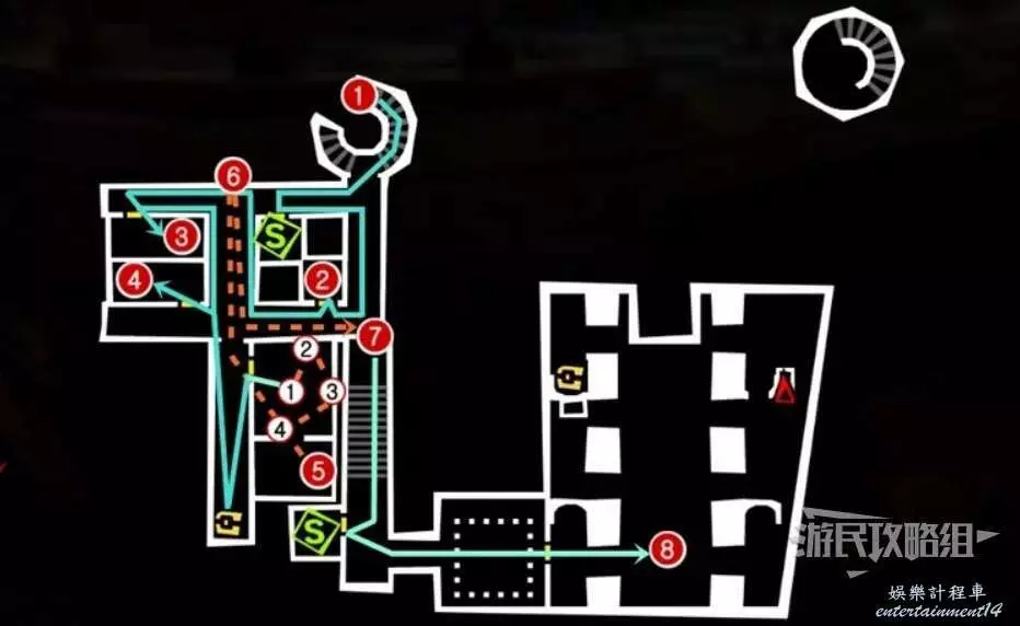 ①沿著螺旋樓梯上來,進入走廊,在這裡學習隱蔽。沿著走廊前進,消滅路上的敵人,開門進入下一個房間