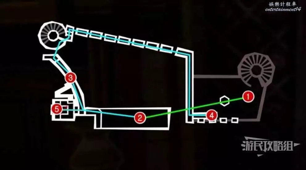 ⑥來到餐廳西南角,拉下開關。(1)回到餐廳入口,再拉一個開關→(2)進入餐廳,拉下東側牆上開關,進入東邊隔壁房間→(3)拉動西側牆上開關,打開北邊的門→(4)進入北邊房間,拉動開關,爬上架子穿過通風口→(5)拉動牆上開關,打開往東走的小路,別忘了開寶箱