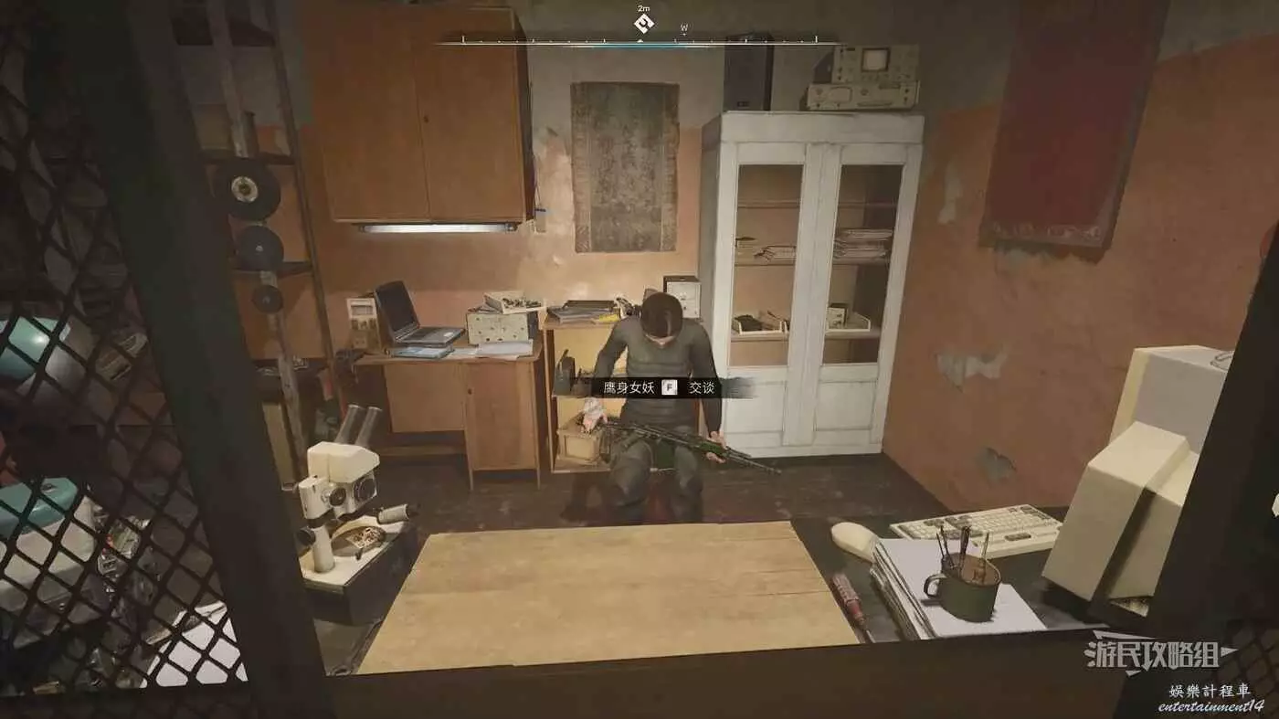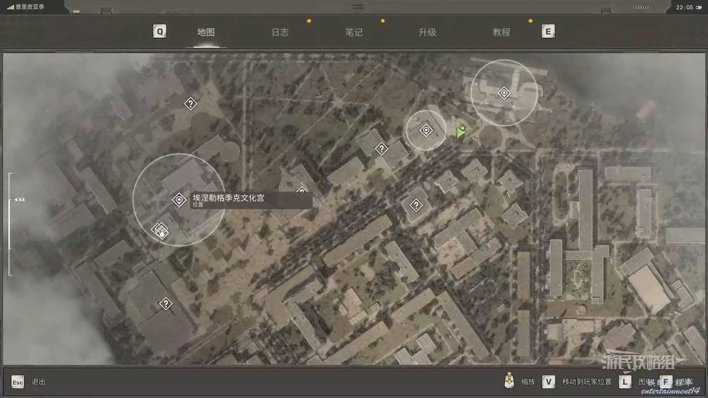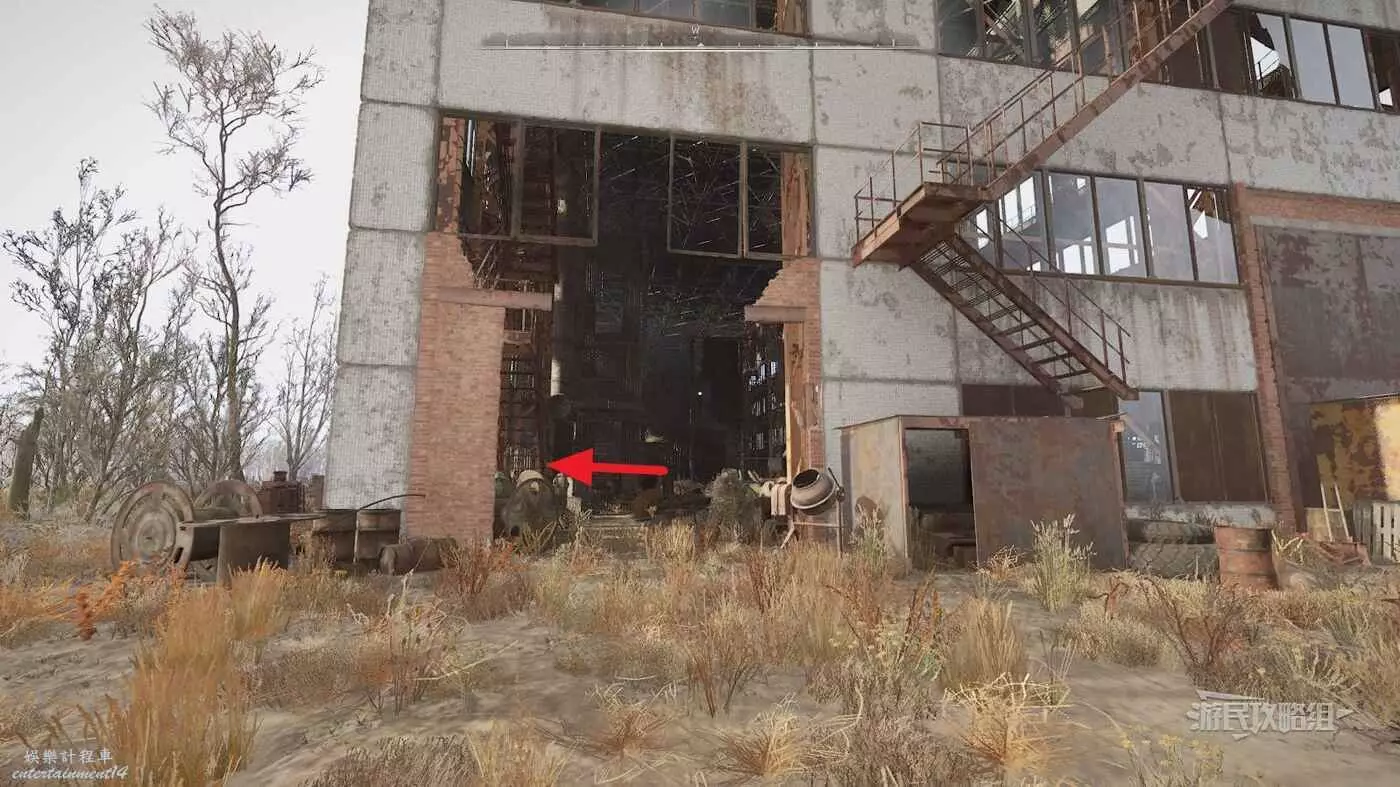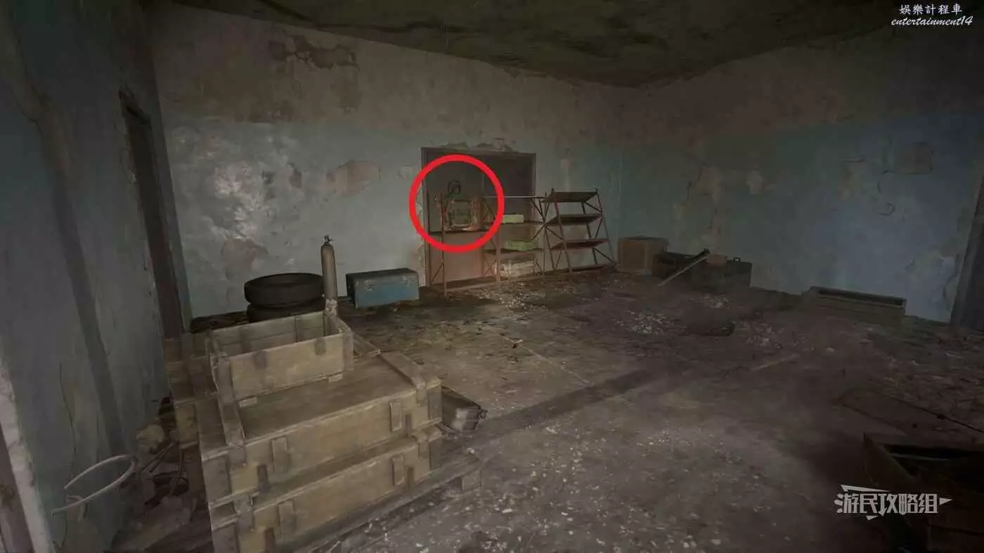 “灰熊”外骨骼位於普裡皮亞季中的白宮區域,從樓梯間的大門進入大樓,樓梯間的位置可以參考下圖綠標。