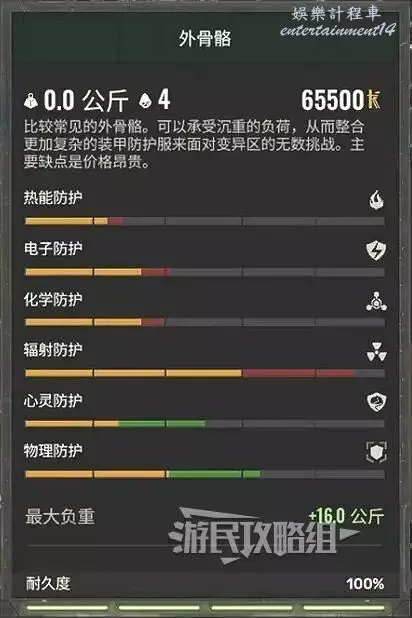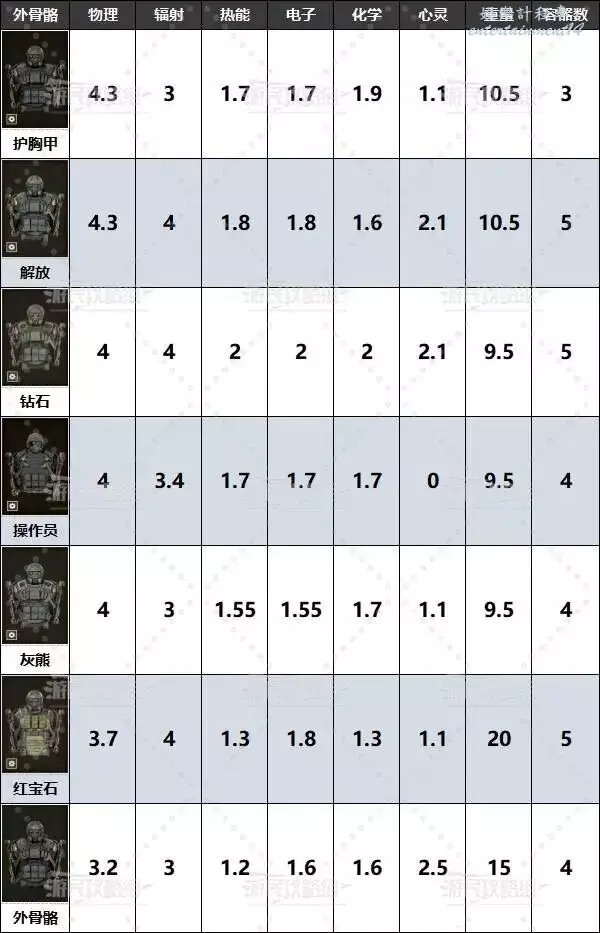 外骨骼數值如下圖所示。取自遊戲中用於顯示護甲數值的橫條圖,並以數位的形式顯示,數位範圍為0~5,0為最低,5為最高。