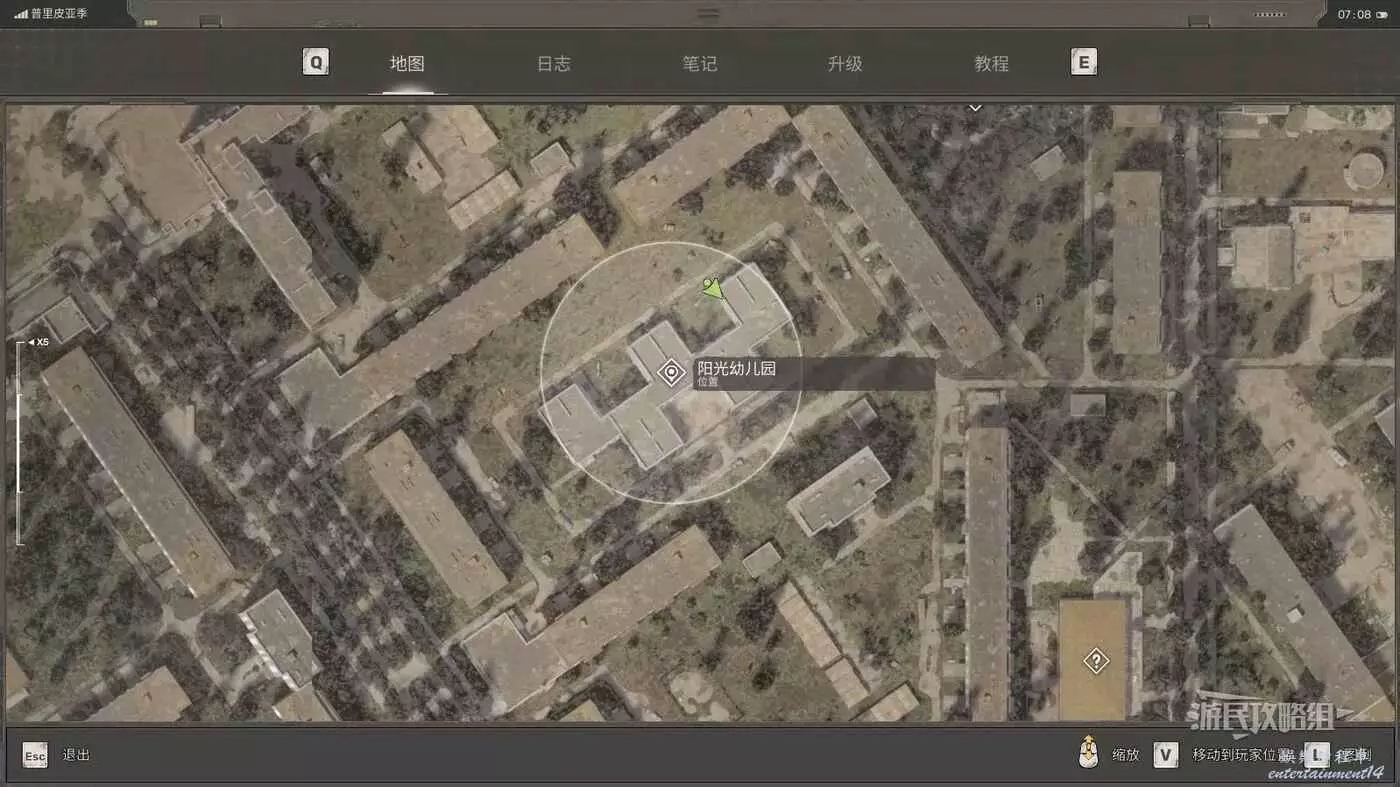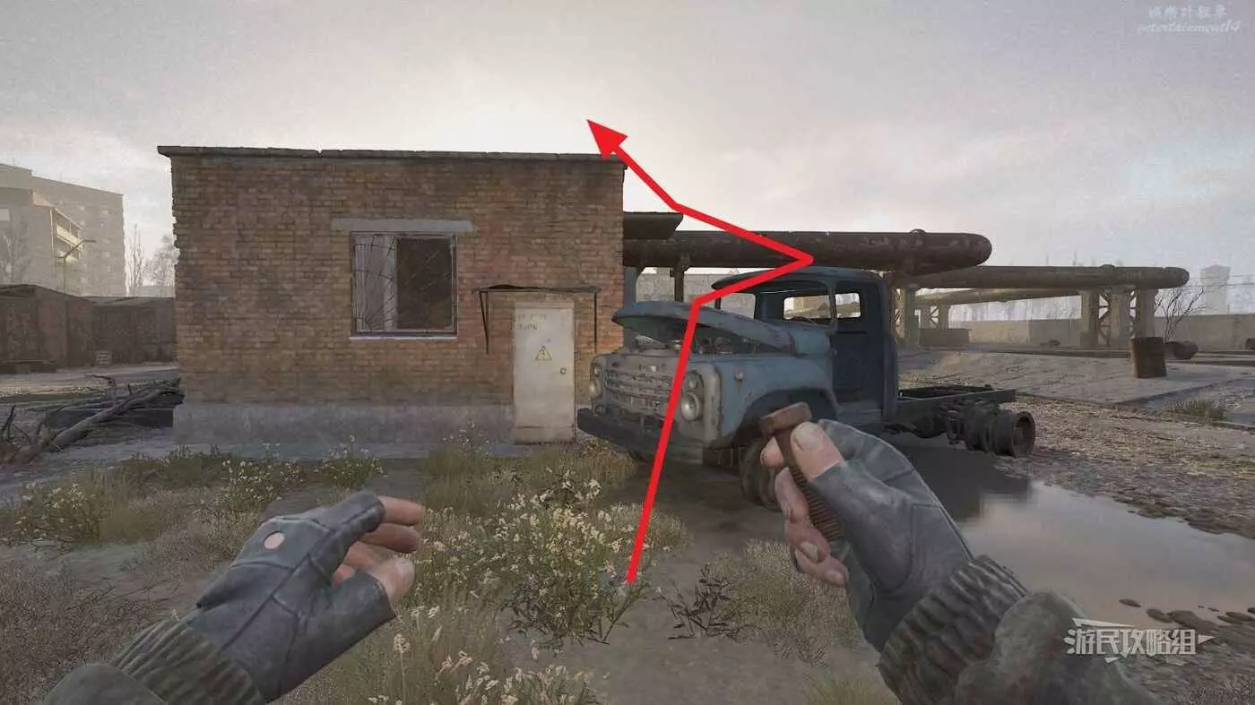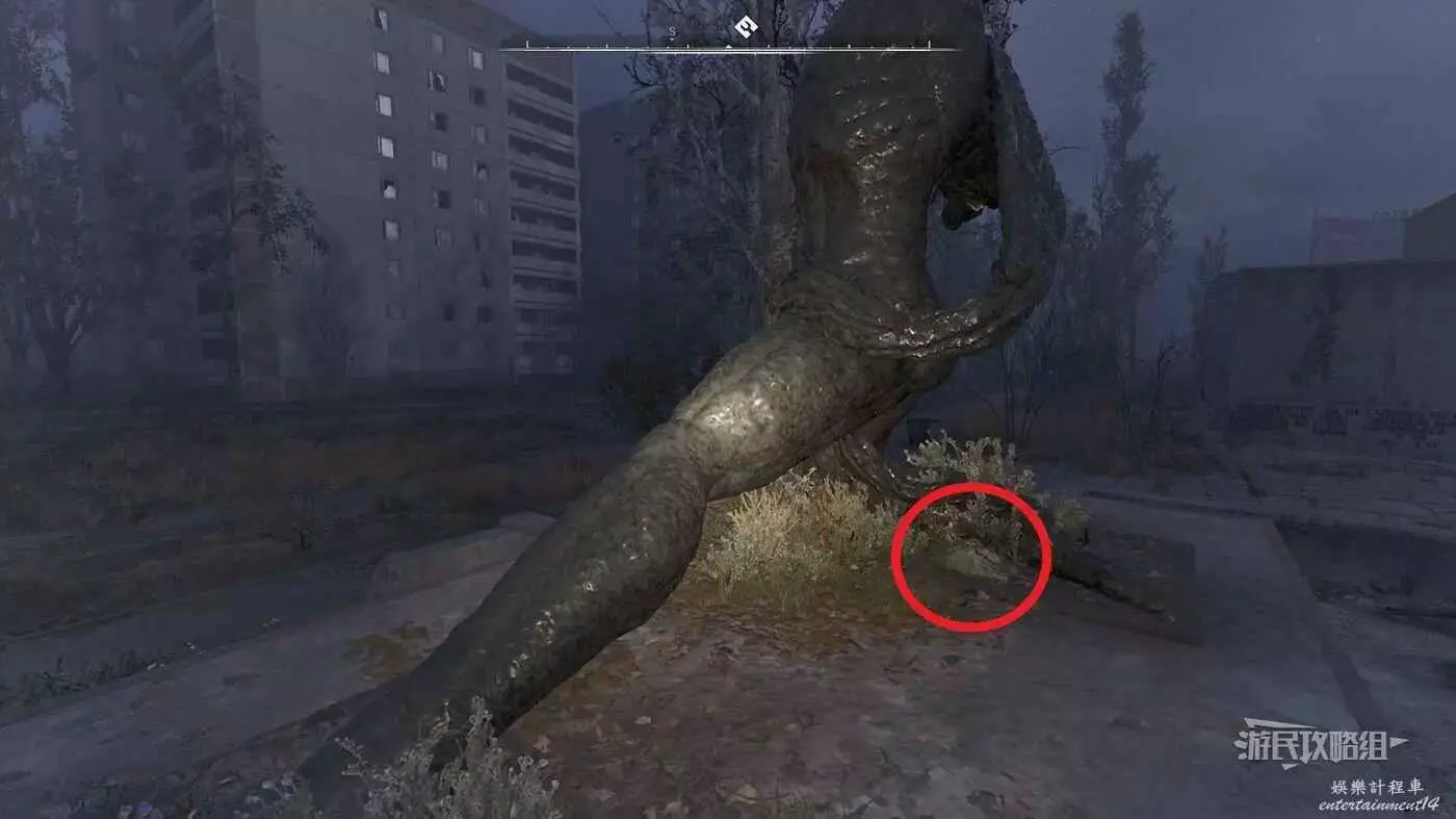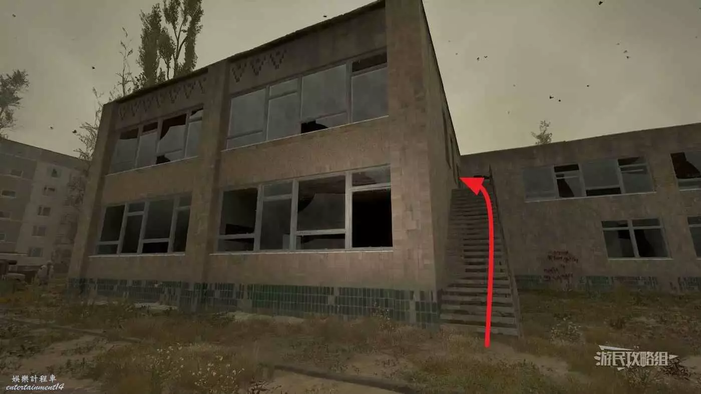 “鑽石”外骨骼位於普裡皮亞季的陽光幼稚園,首先前往陽光幼稚園門前的樓梯,參考下圖綠標位置。