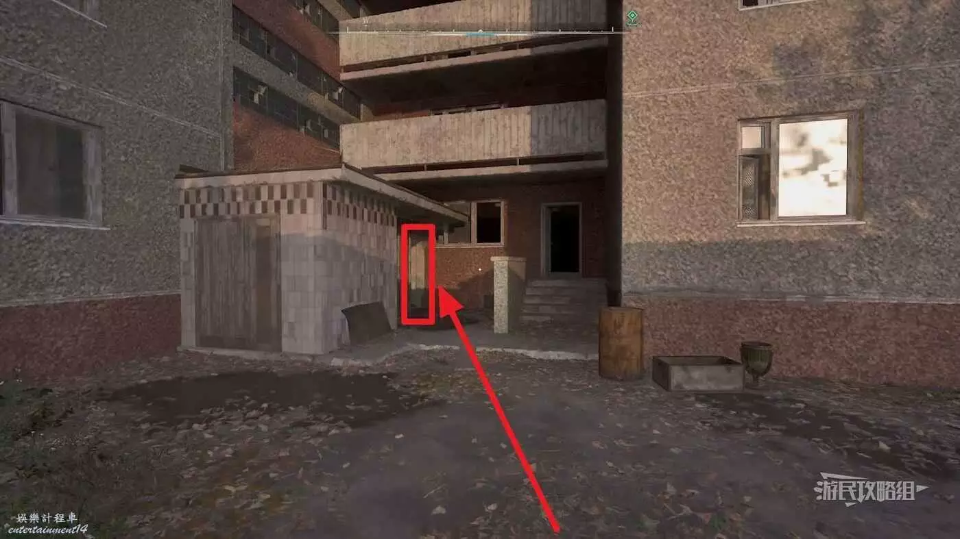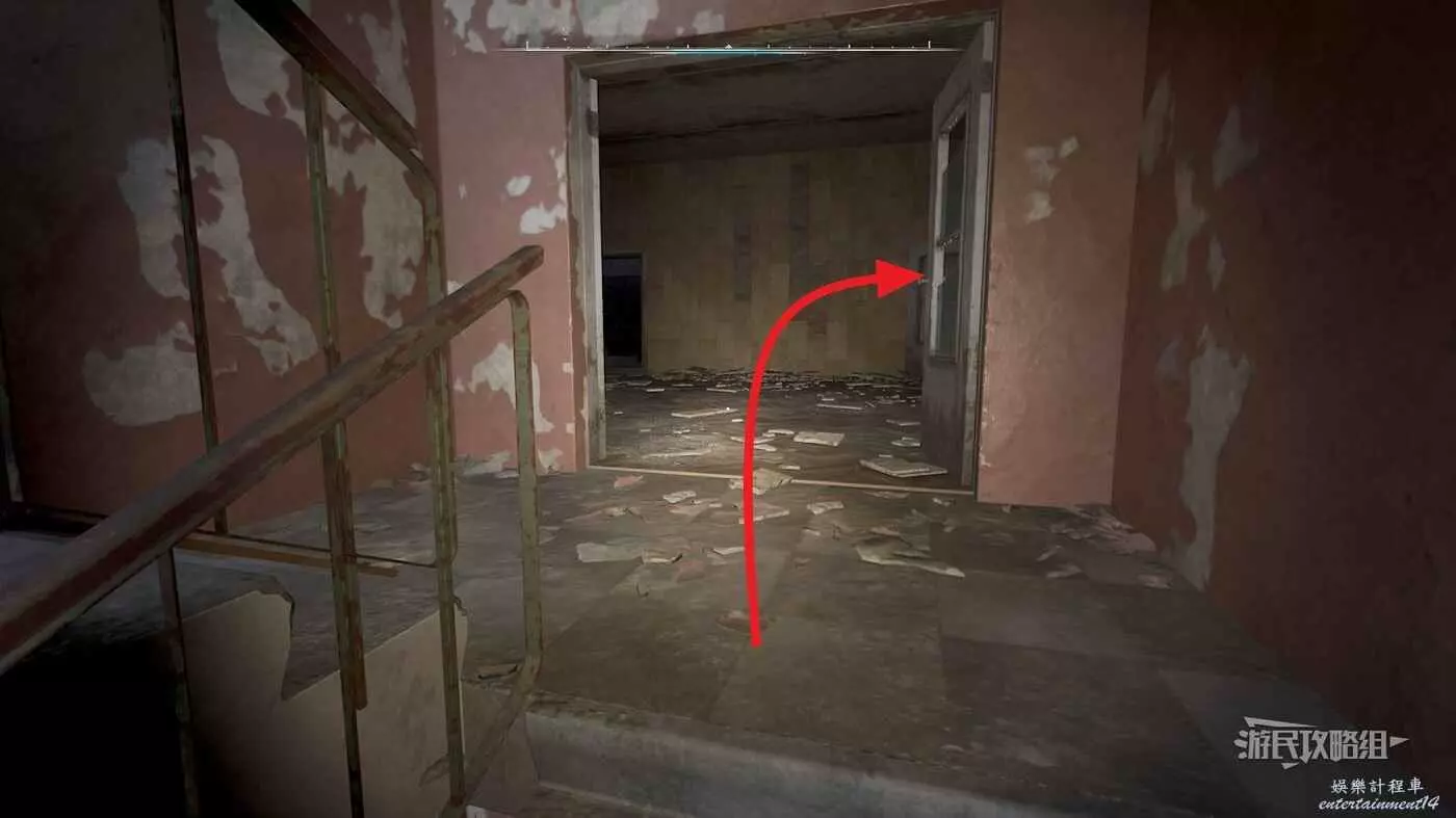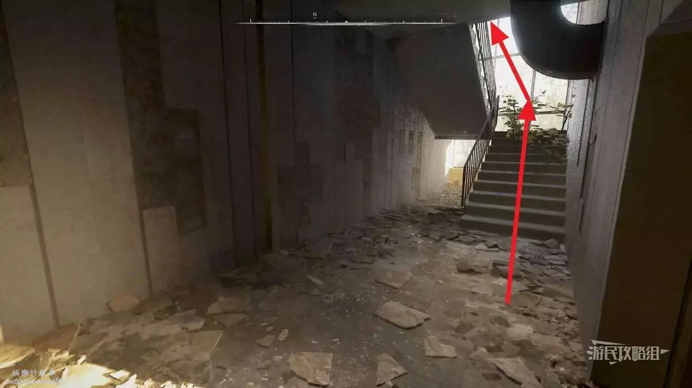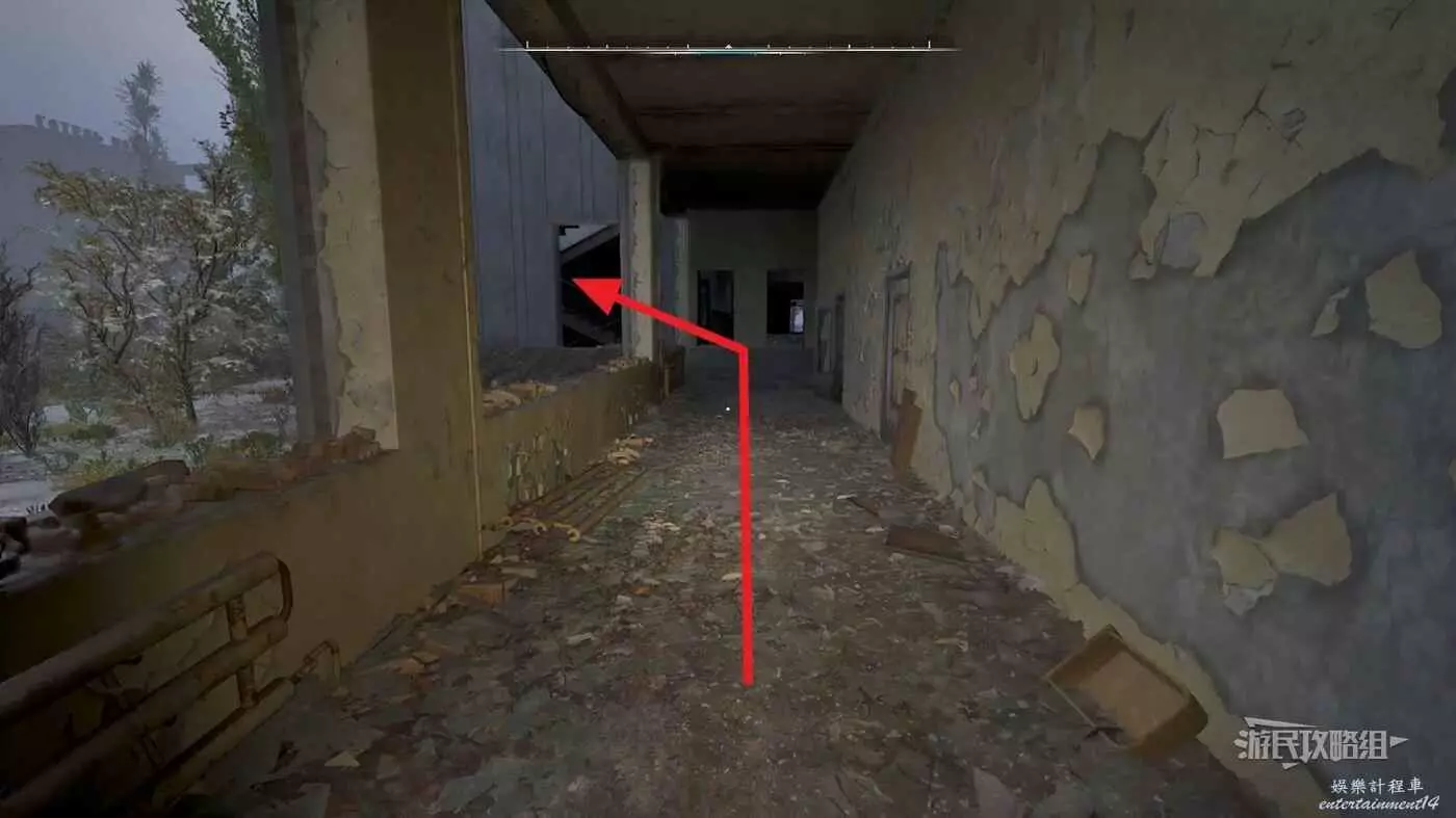 扔完手雷後,從這棟樓右邊的直角樓梯進入建築,然後穿過一層最外側的走廊。