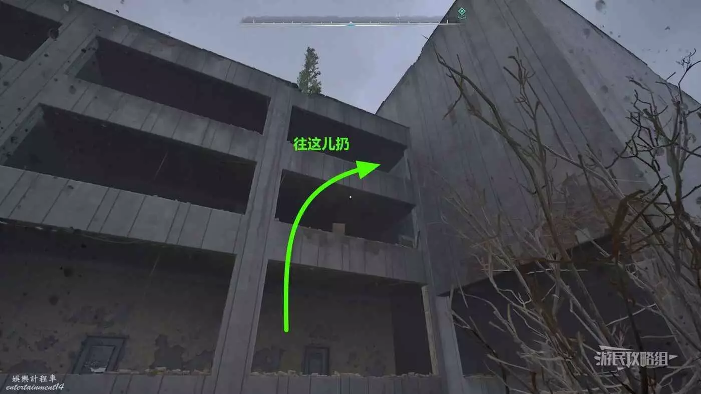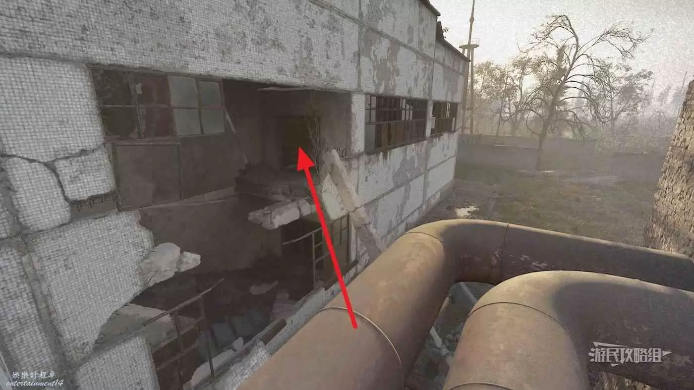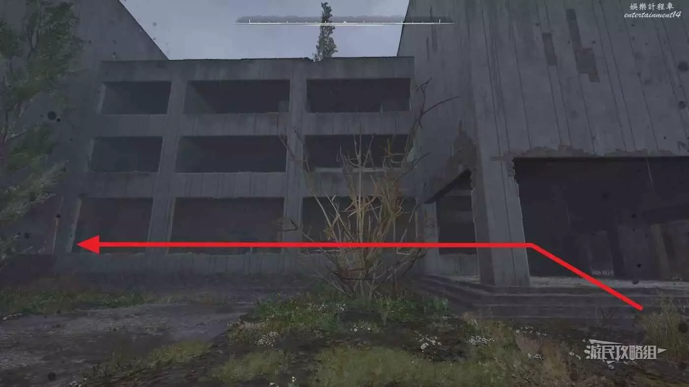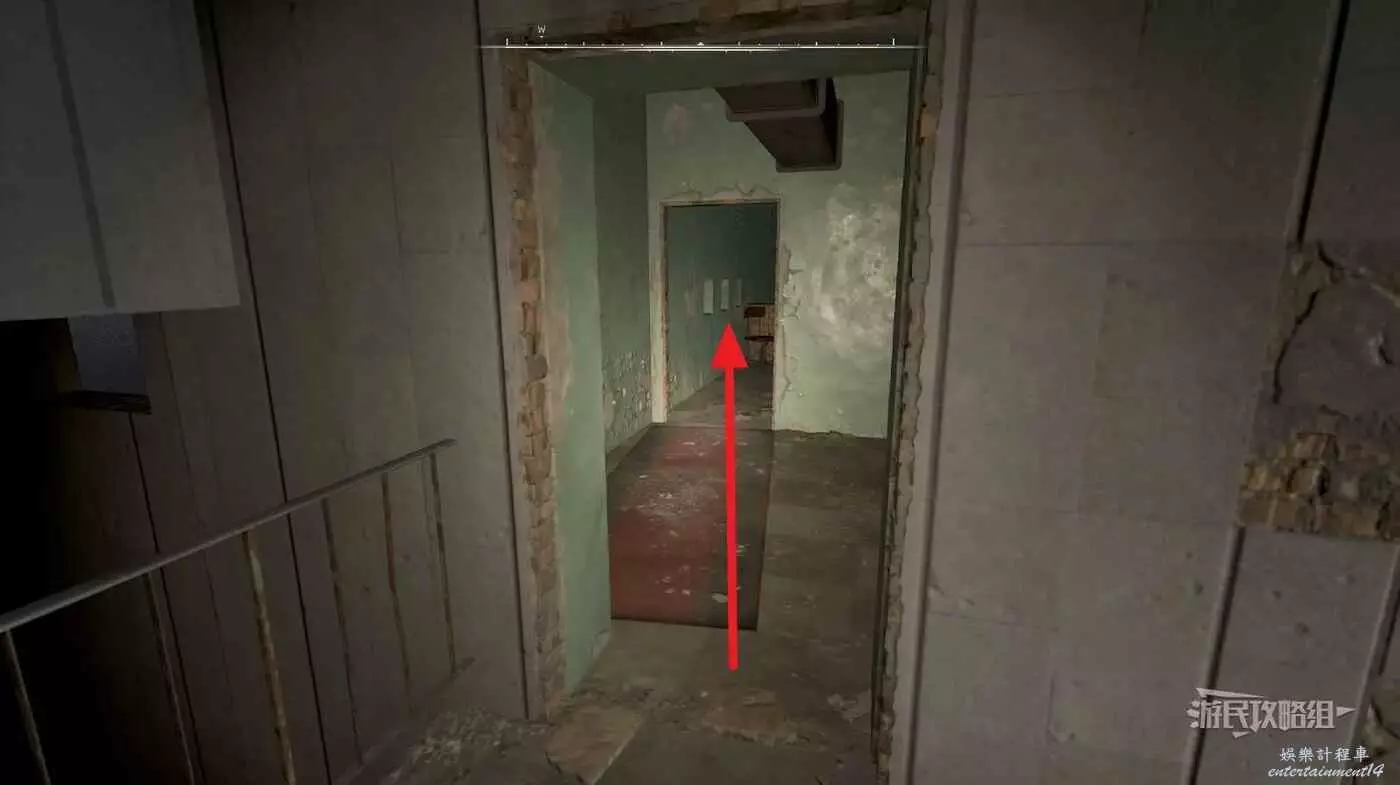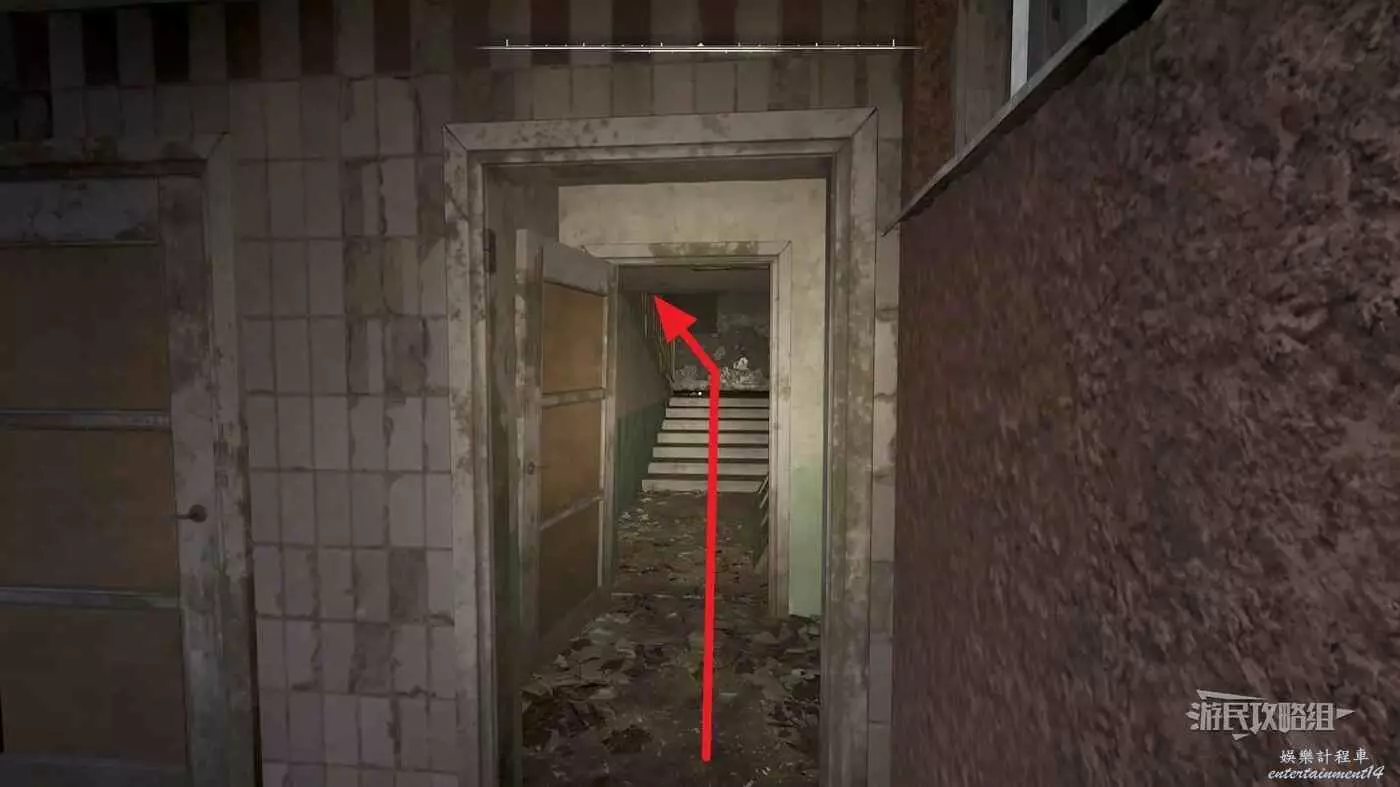 扔完手雷後,從這棟樓右邊的直角樓梯進入建築,然後穿過一層最外側的走廊。