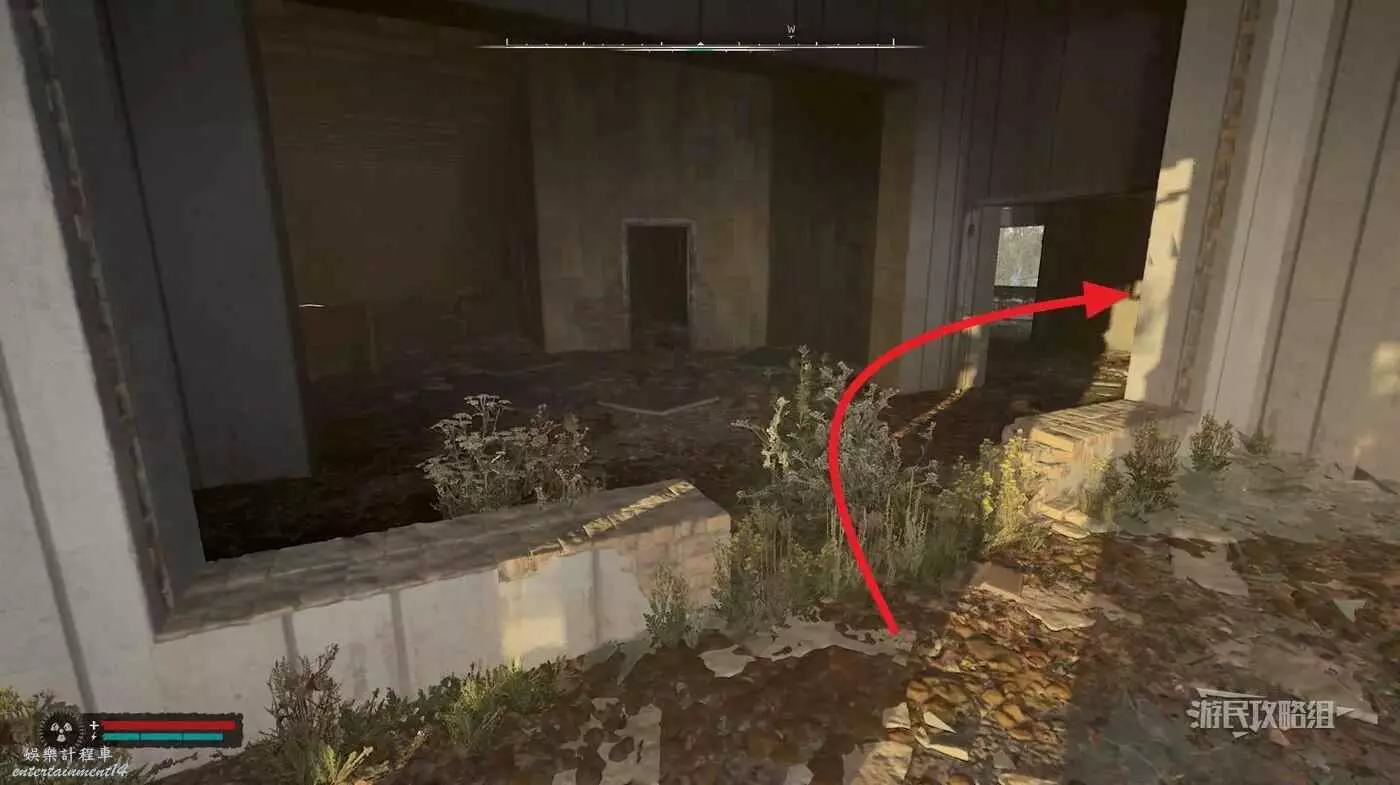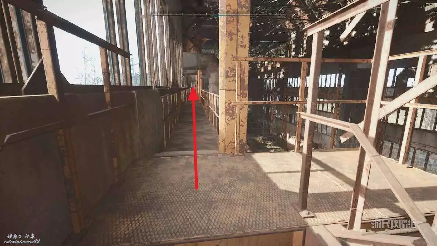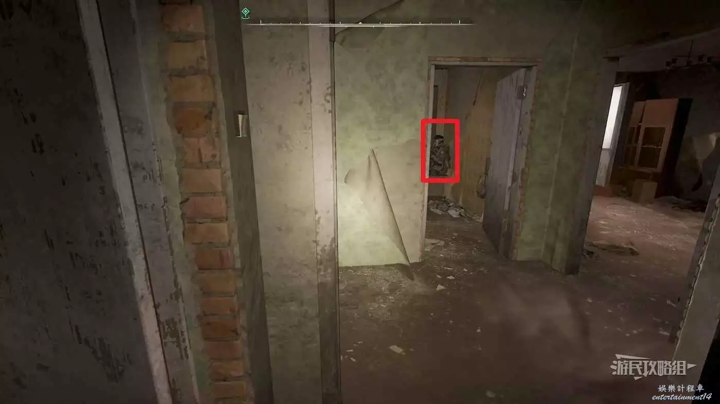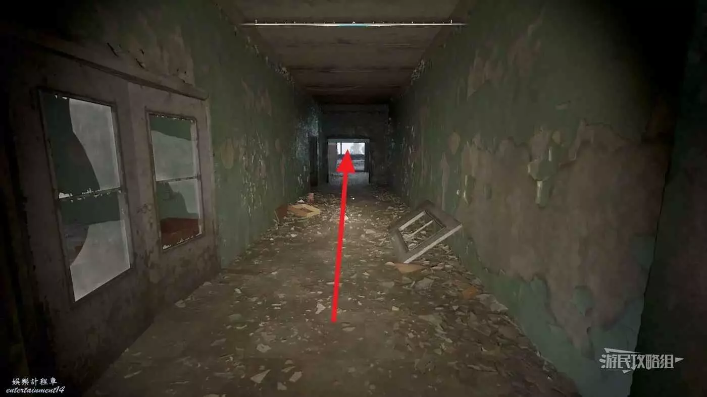 扔完手雷後,從這棟樓右邊的直角樓梯進入建築,然後穿過一層最外側的走廊。