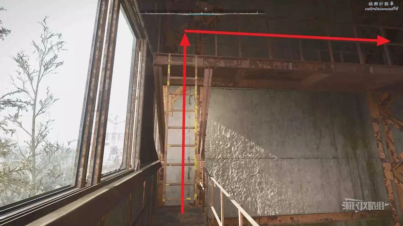 走到管道的盡頭,最後一個拐彎處,從這裡跳到對面建築廢墟的二層。