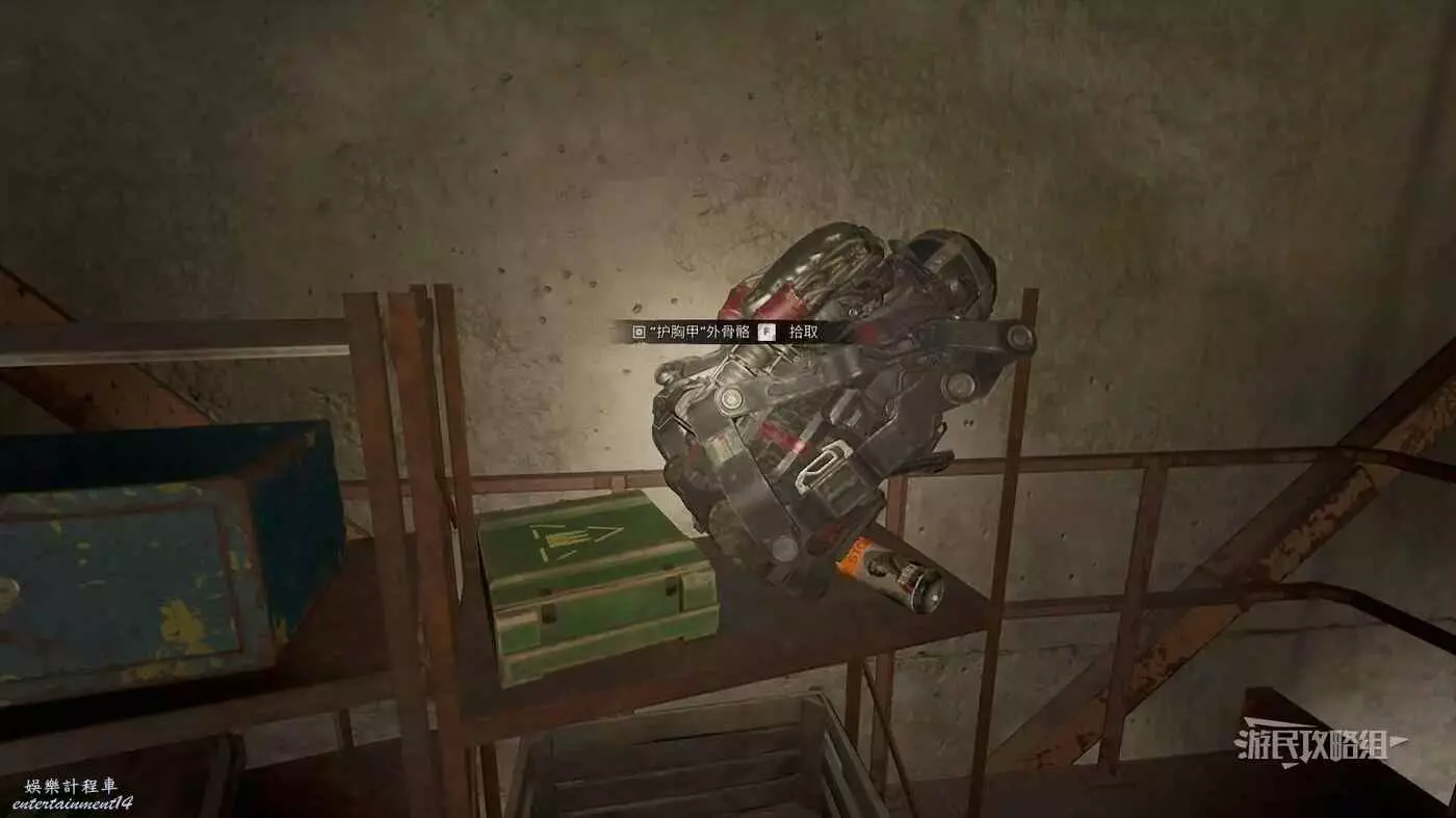 走到走廊中間位置,在凸出的小平台處左轉,即可在架子上看到這個外骨骼。