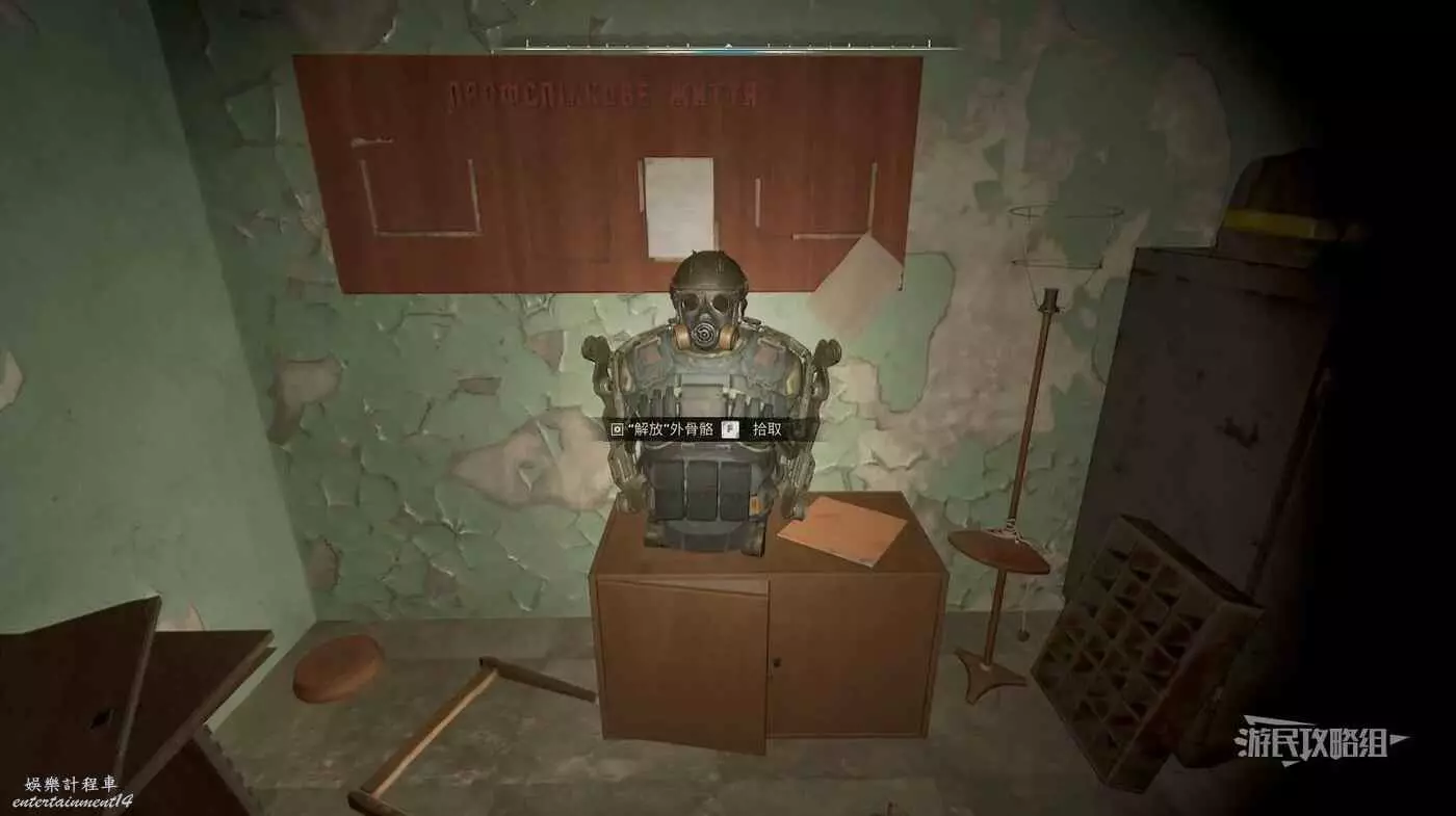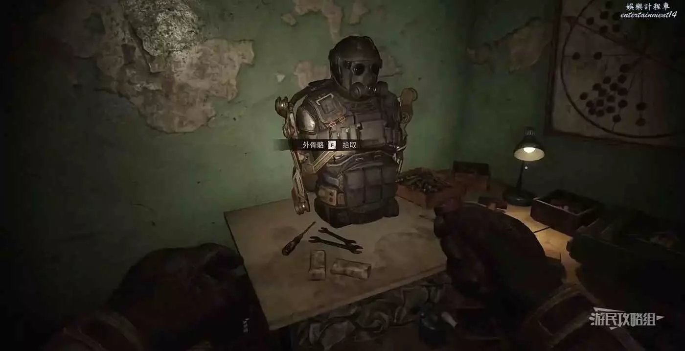 到達二層後右轉可以看到一個房間,只有一個房間,走到房間盡頭即可拾取外骨骼。