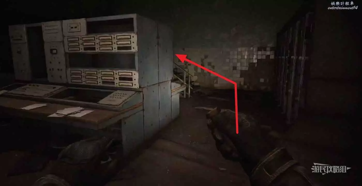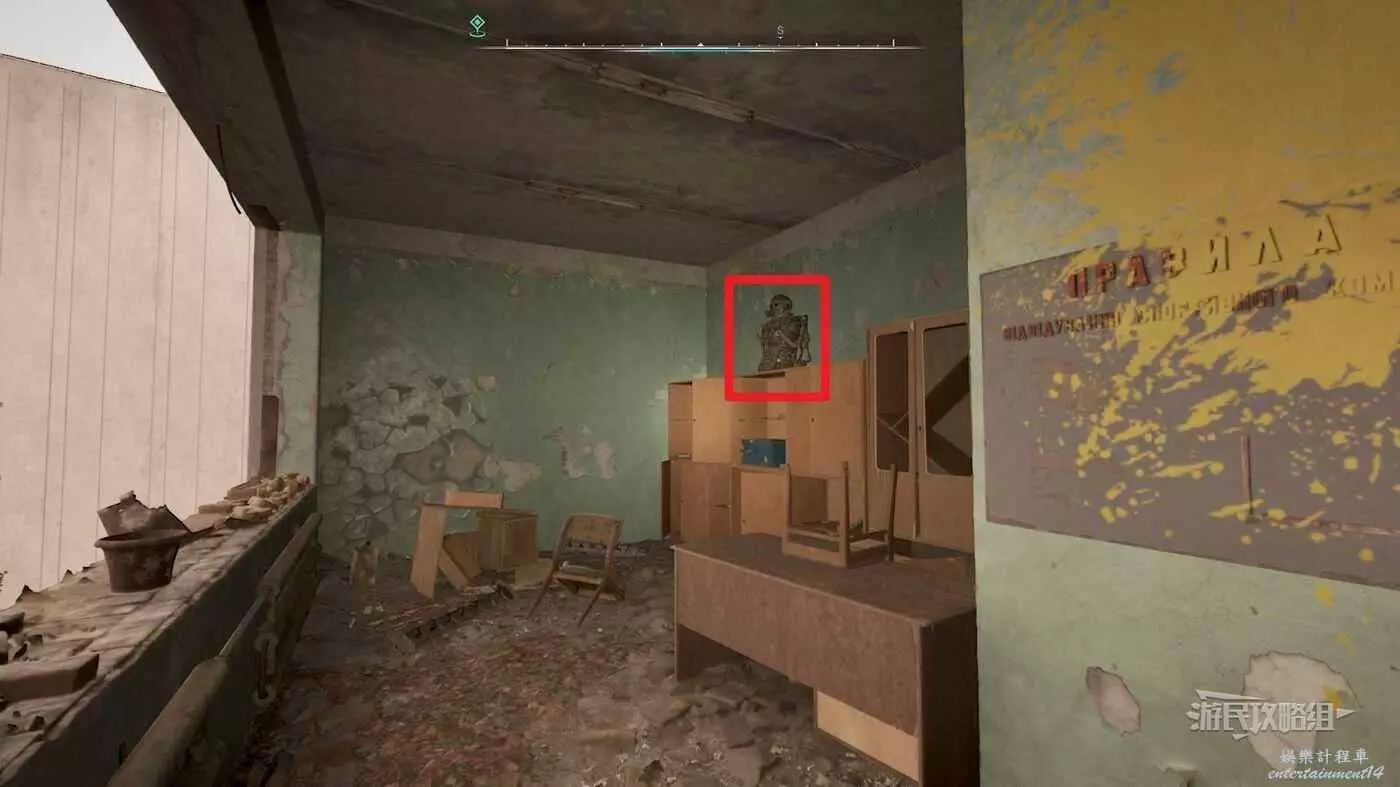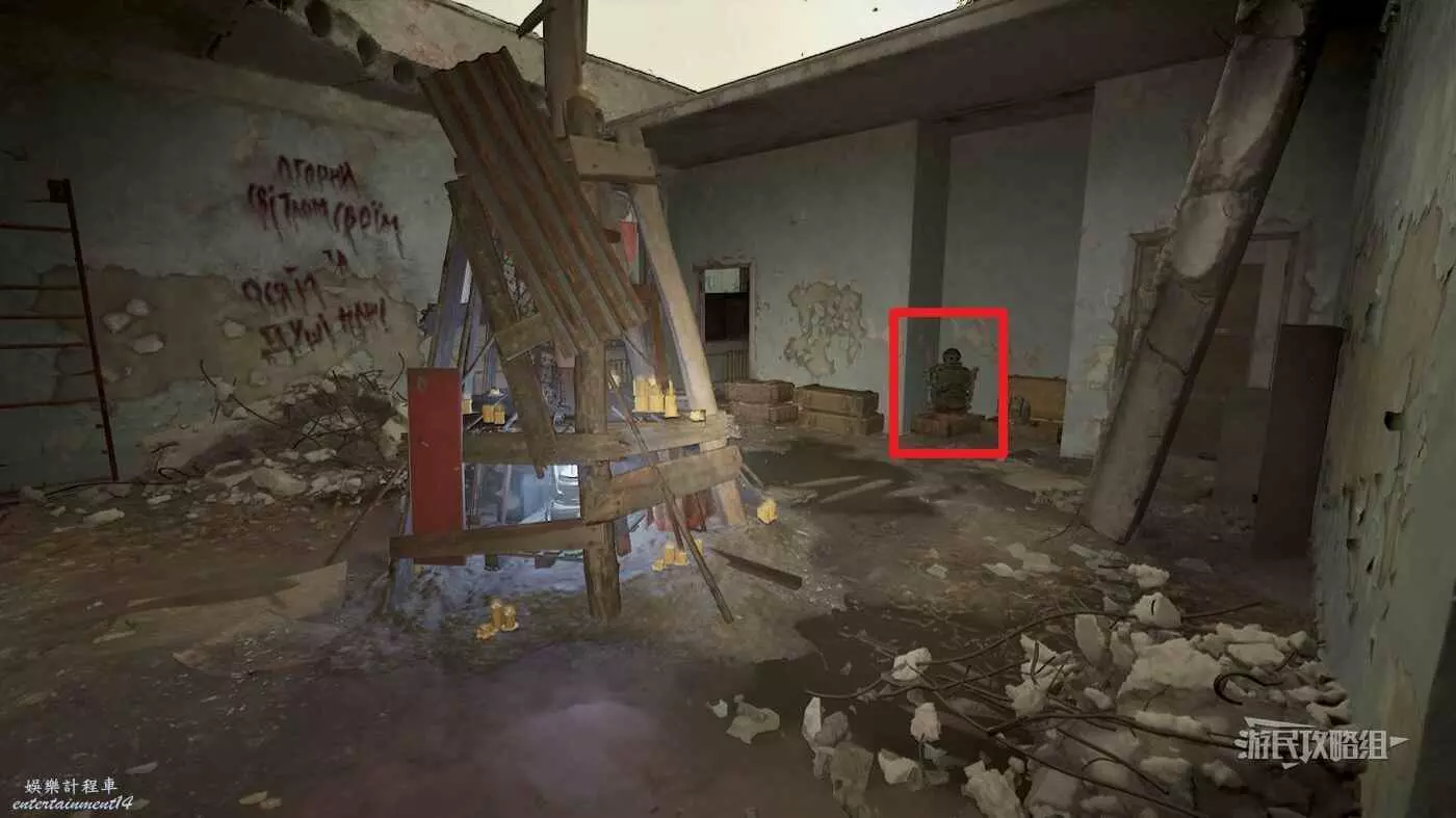 “紅寶石”外骨骼防護服位於普裡皮亞季中的埃涅勒格季克文化宮,需要先從下圖綠標所示位置扔手雷把外骨骼所在房間的門炸開再前往拾取(如果正確炸開的話,能聽到木頭板子被炸到的聲音)。