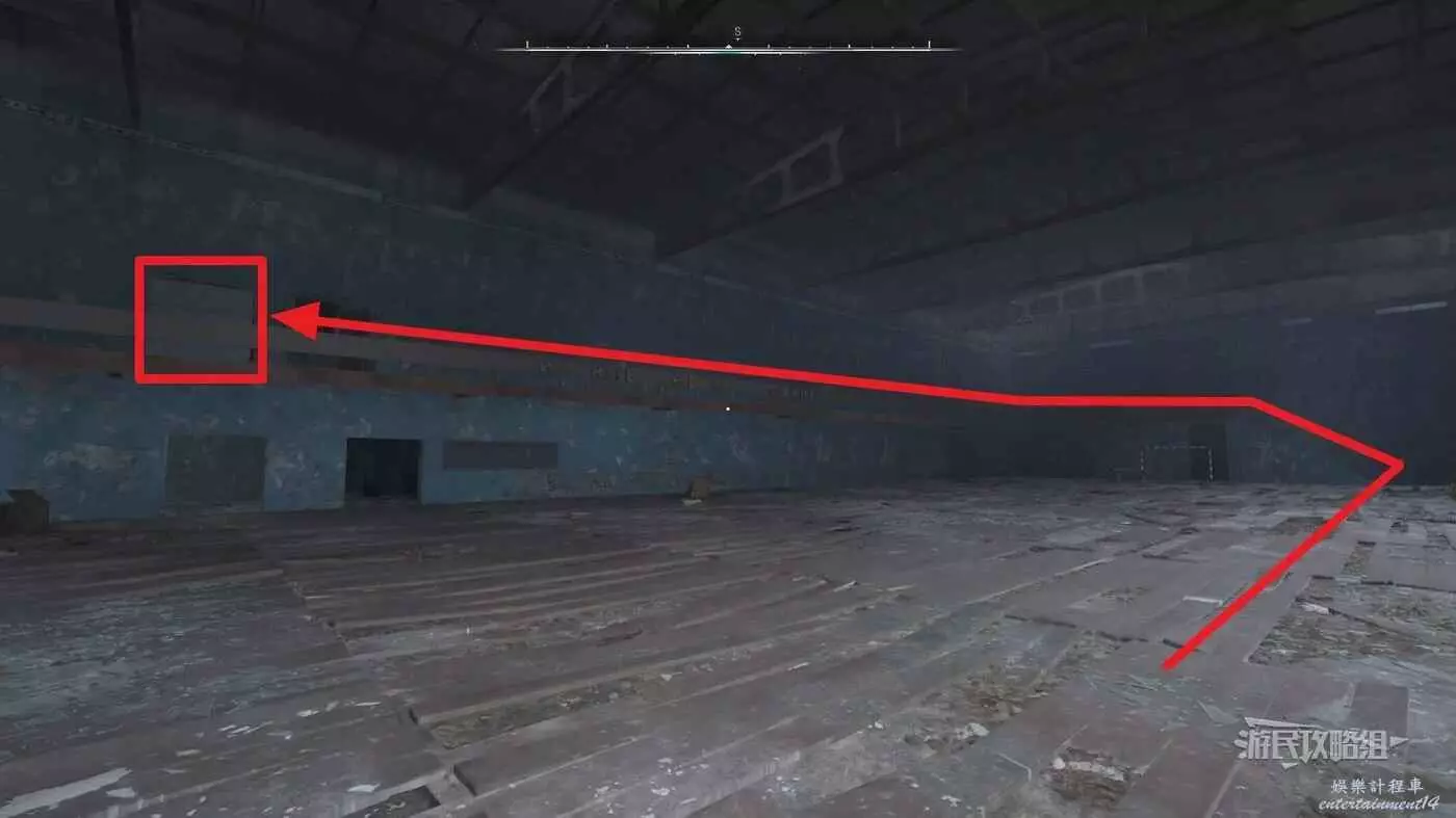 穿過整個場地,走另一側的樓梯,進入下圖紅框所示的兩扇白門,如果剛才手雷爆炸的位置是正確的話,靠近這扇門應該可以打開。如果無法打開,就回到起點重新丟手雷炸門。
